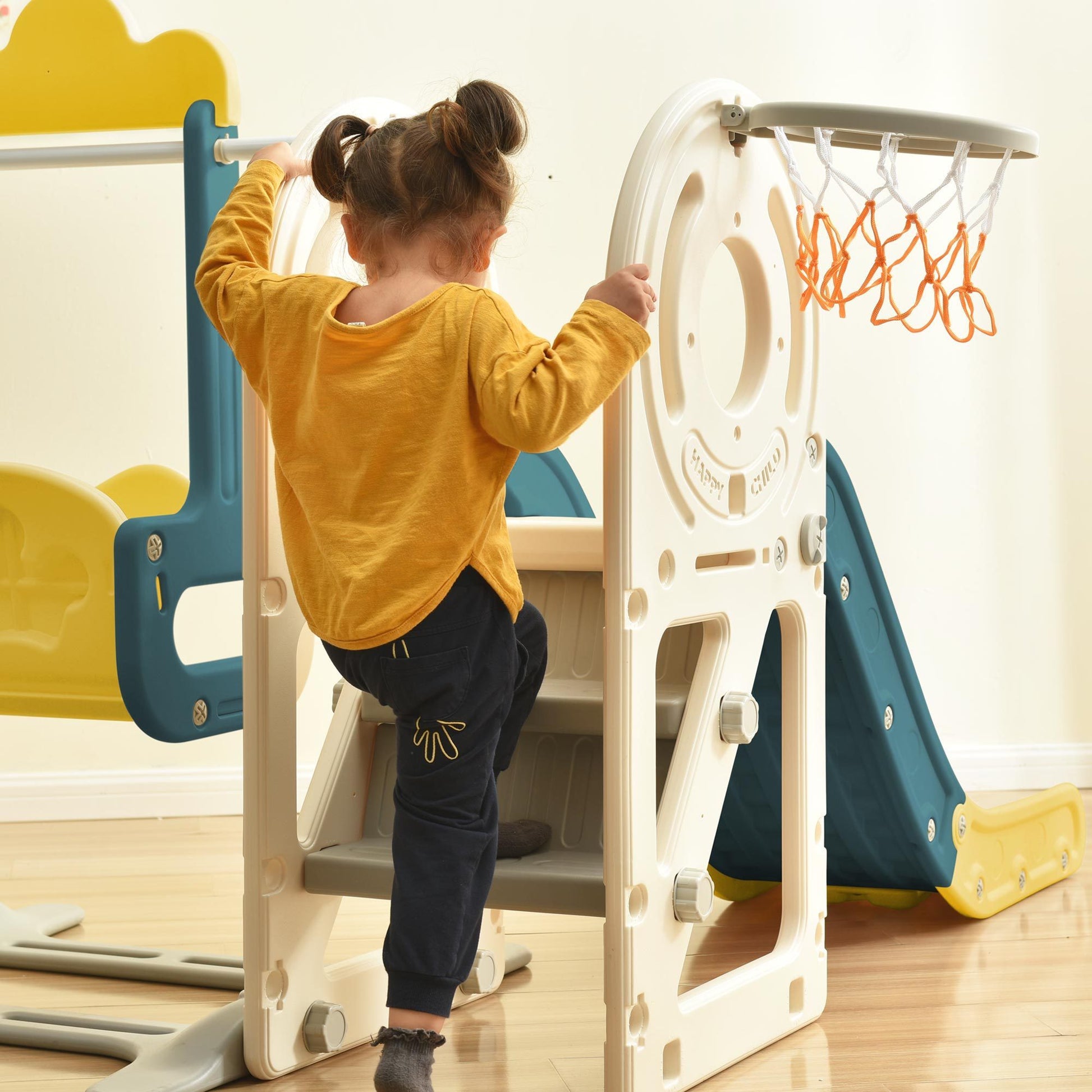 - 5 IN 1 Slide Set - This freestanding slide integrates 5 exciting play sections for kids. The two parts of the slide group have wide step pedals and smooth slides for children to slide down freely. The other part consists of a realistic bus model and a fun basketball hoop. A very cute little swing is fixed between the bus and the slide This surprising combination can bring endless play fun to children.