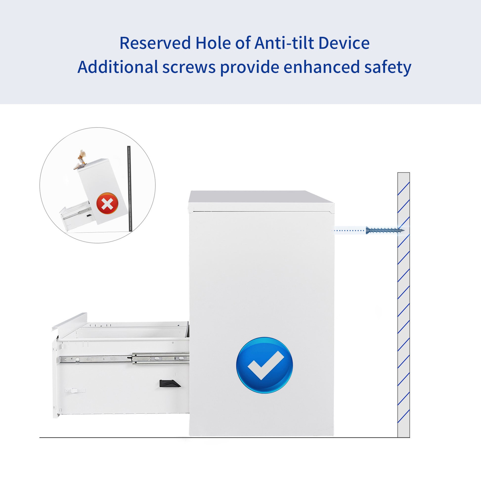 - [ANTI-TILT DESIGN] When one drawer is pulled out, the interlocking system prevents other drawers from being pulled out. What's more, there are also two reserved anti-dumping holes in the rear plane that allow the cabinet to be attached to the wall. All of these are designed to prevent tipping and can keep you safe, especially for kids.