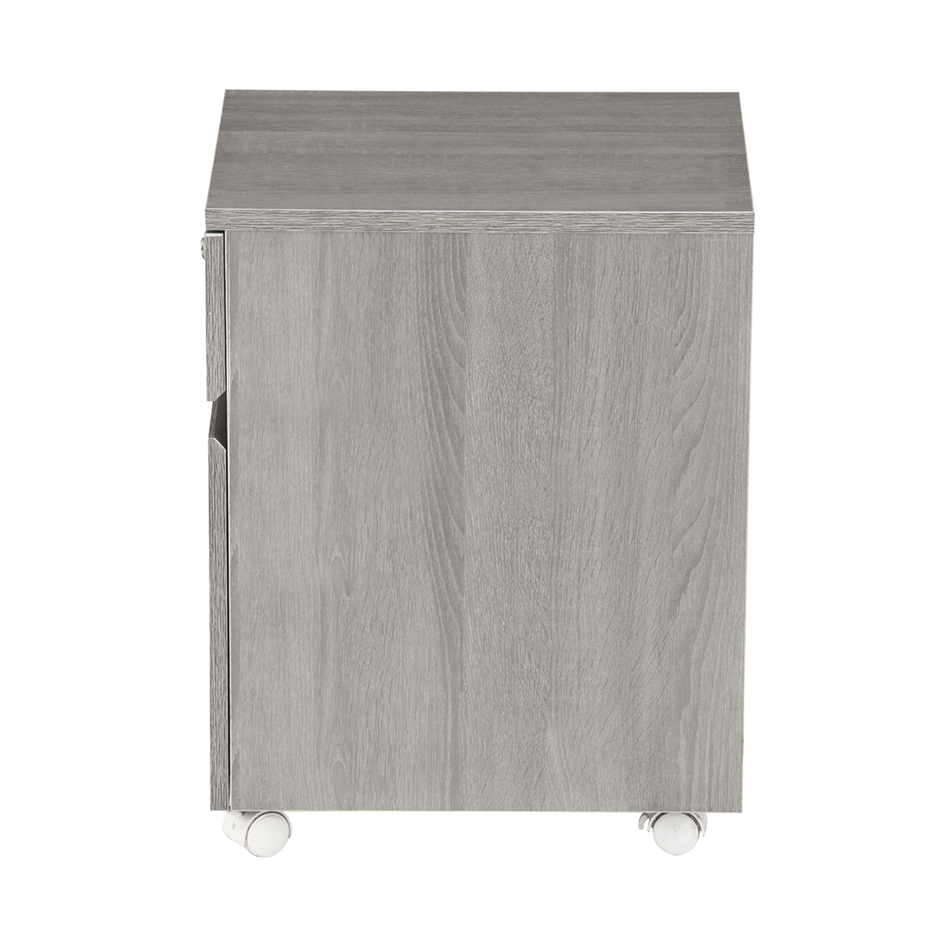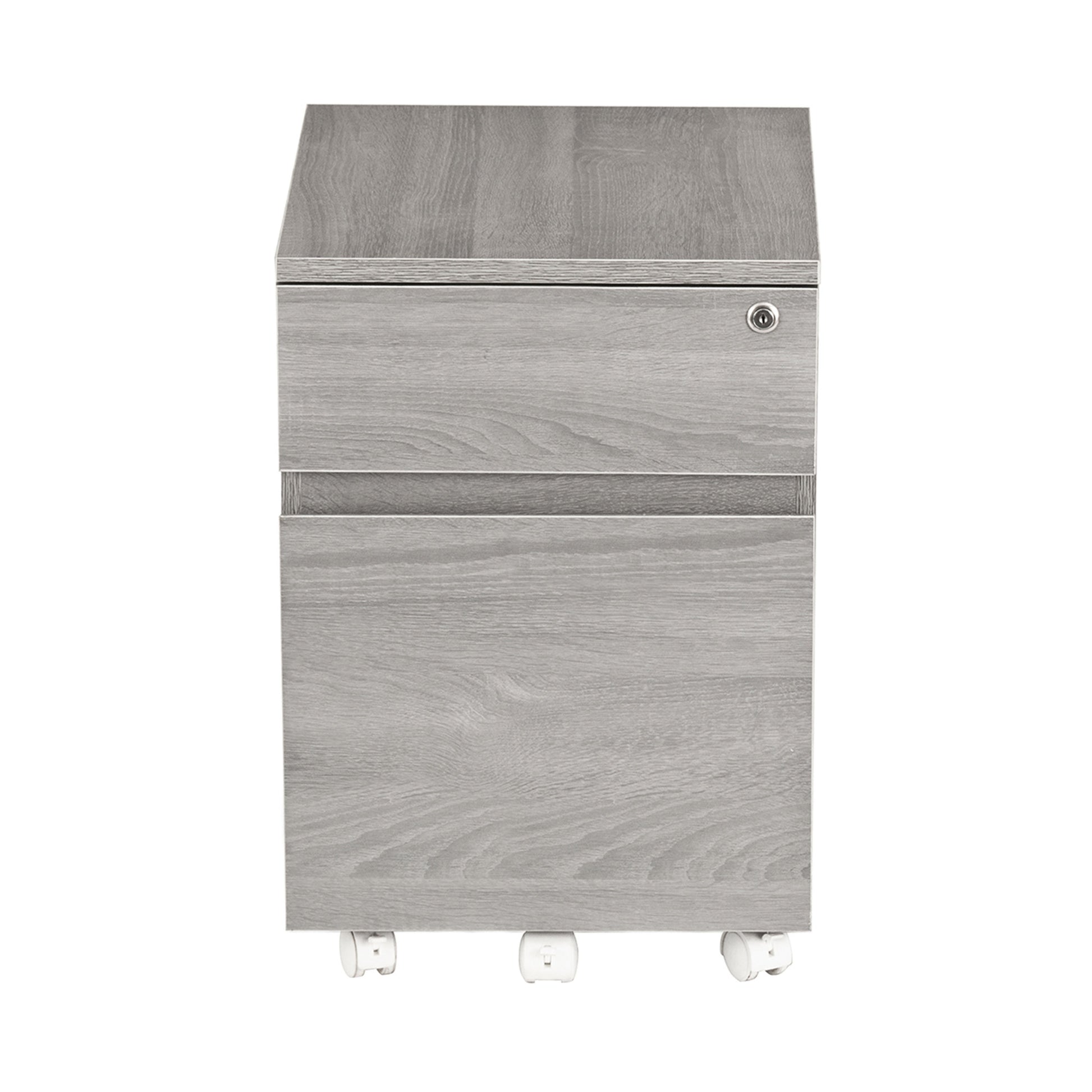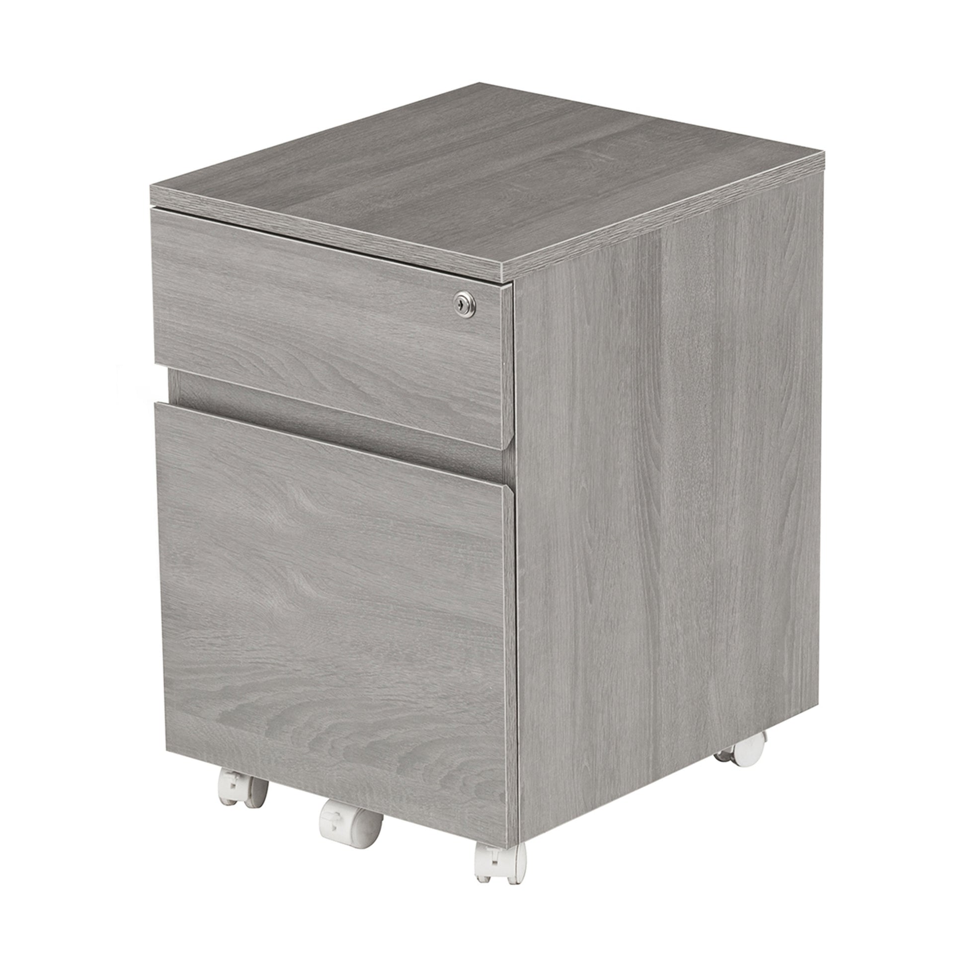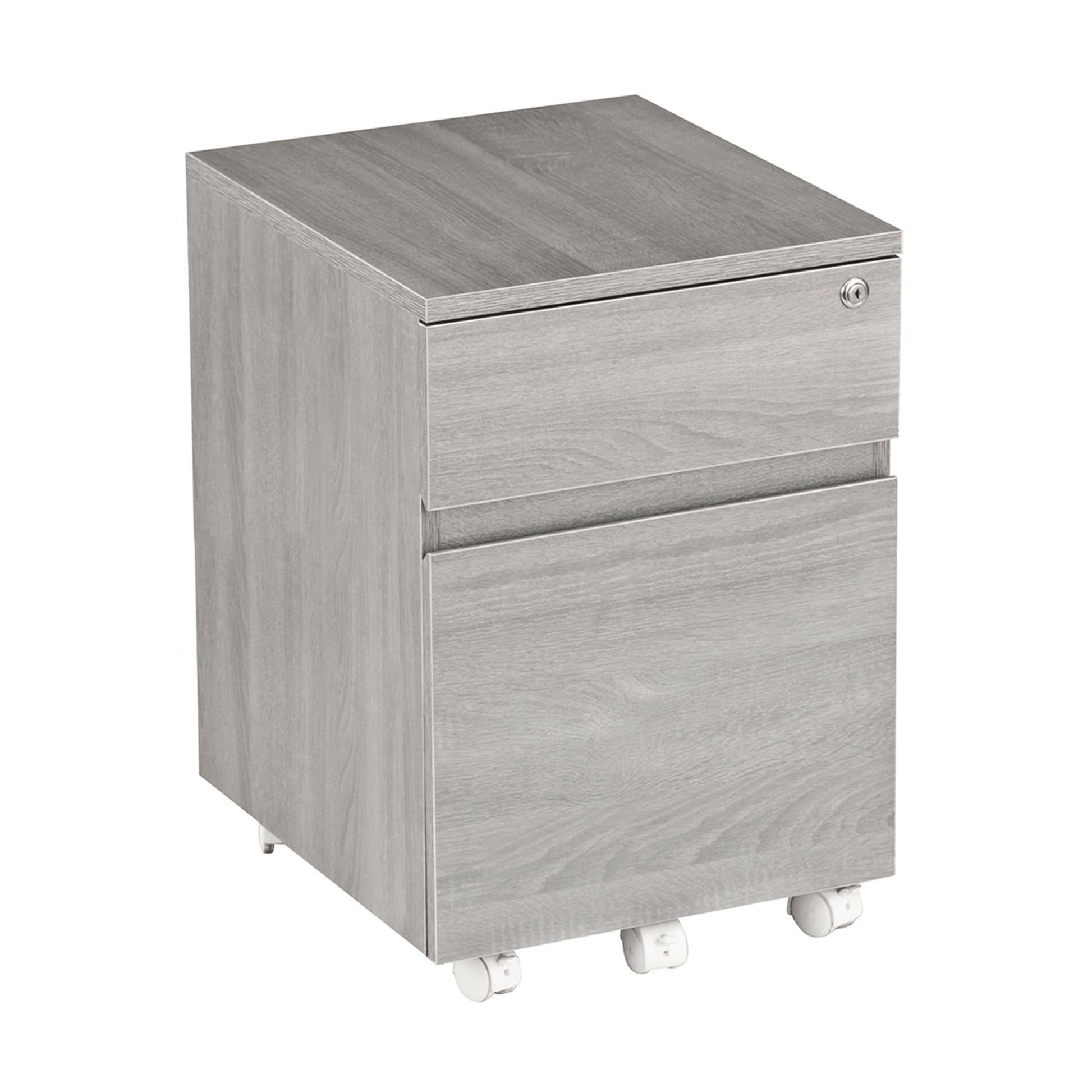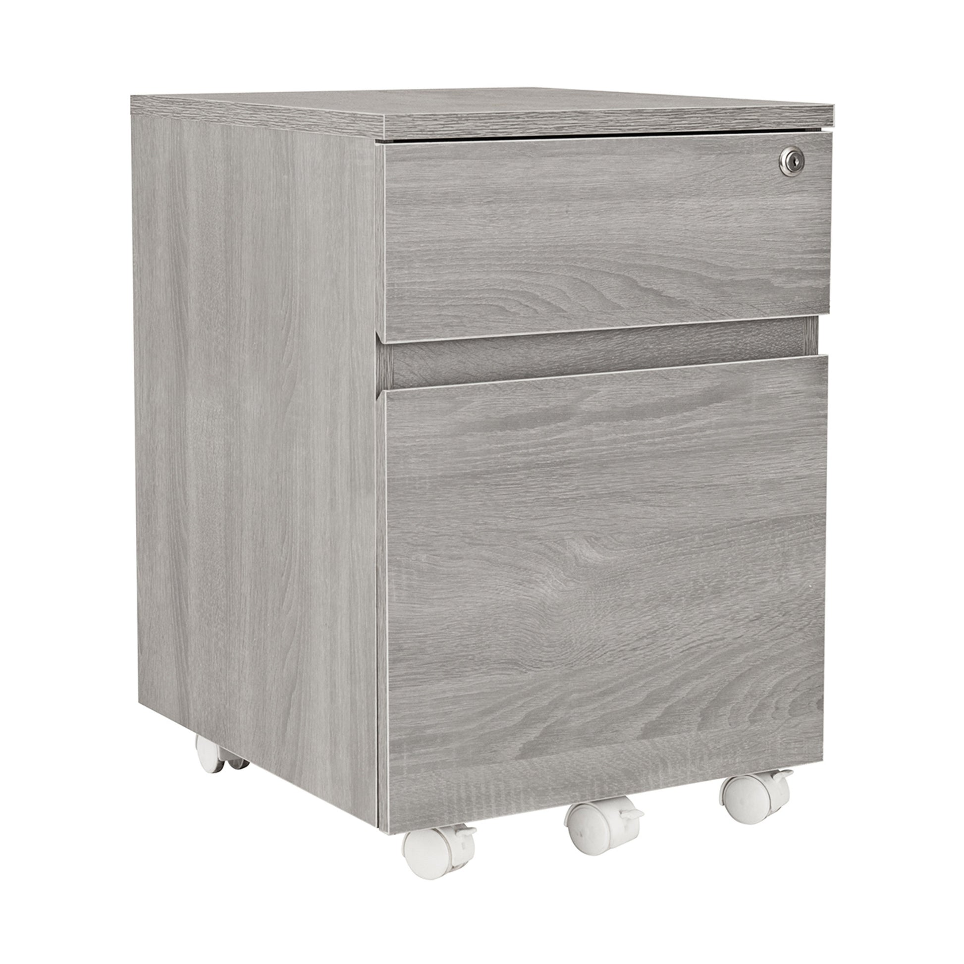 LONG DESCRIPTION : This Techni Mobili Rolling File Cabinet is a great space-saving solution for your home office to keep you organized. It's two drawers provide the storage you need to file your important documents. The top drawer includes a lock and key to safely protect your personal belongings and confidential documents. The bottom hanging file cabinet allows for easy filing. It is made of MDF with a moisture laminate veneer atop five double wheel casters with locking mechanism.