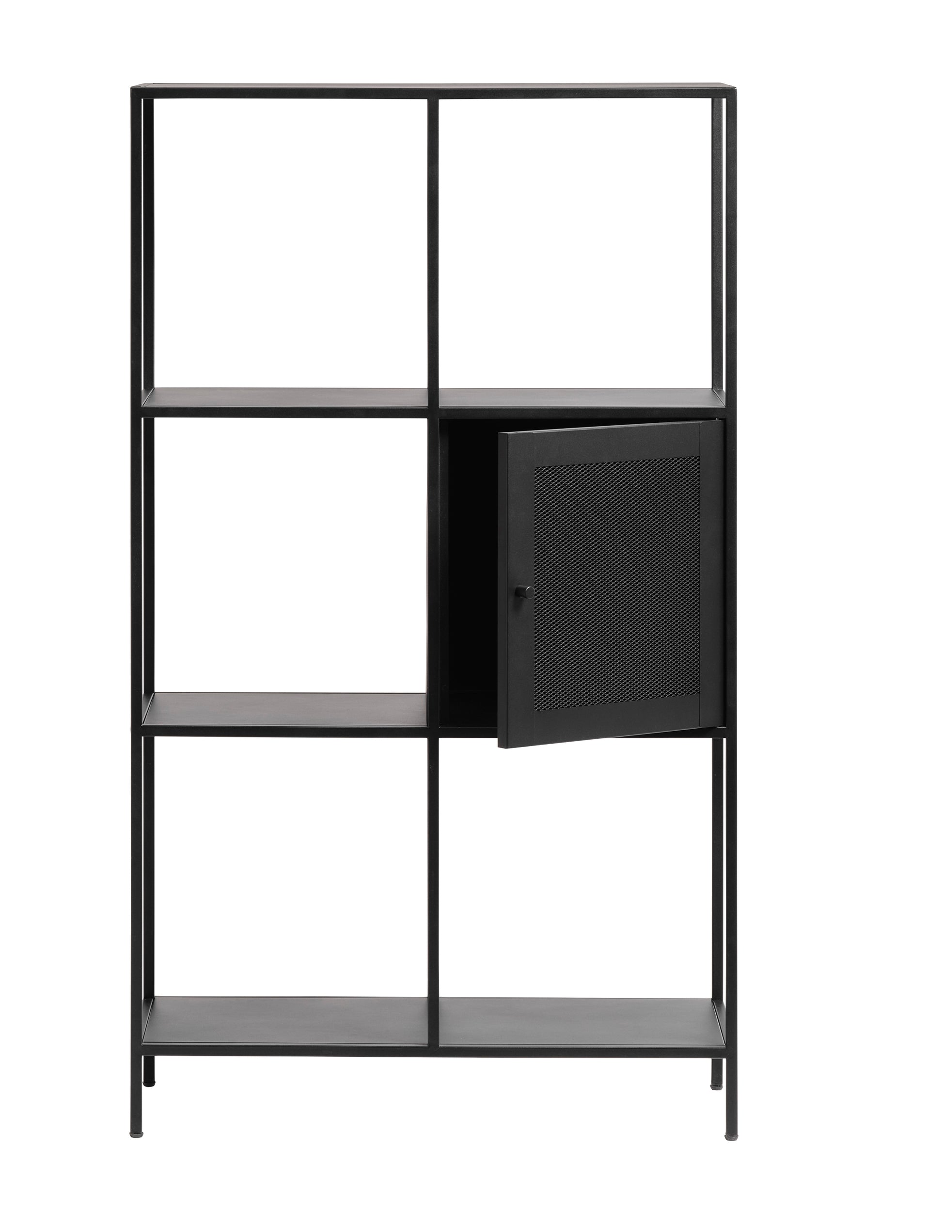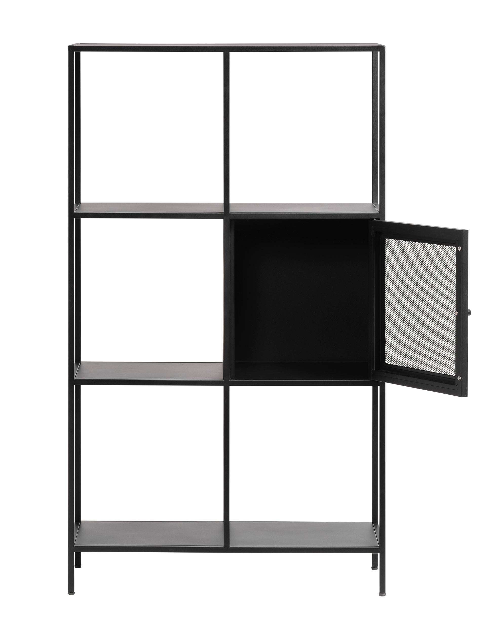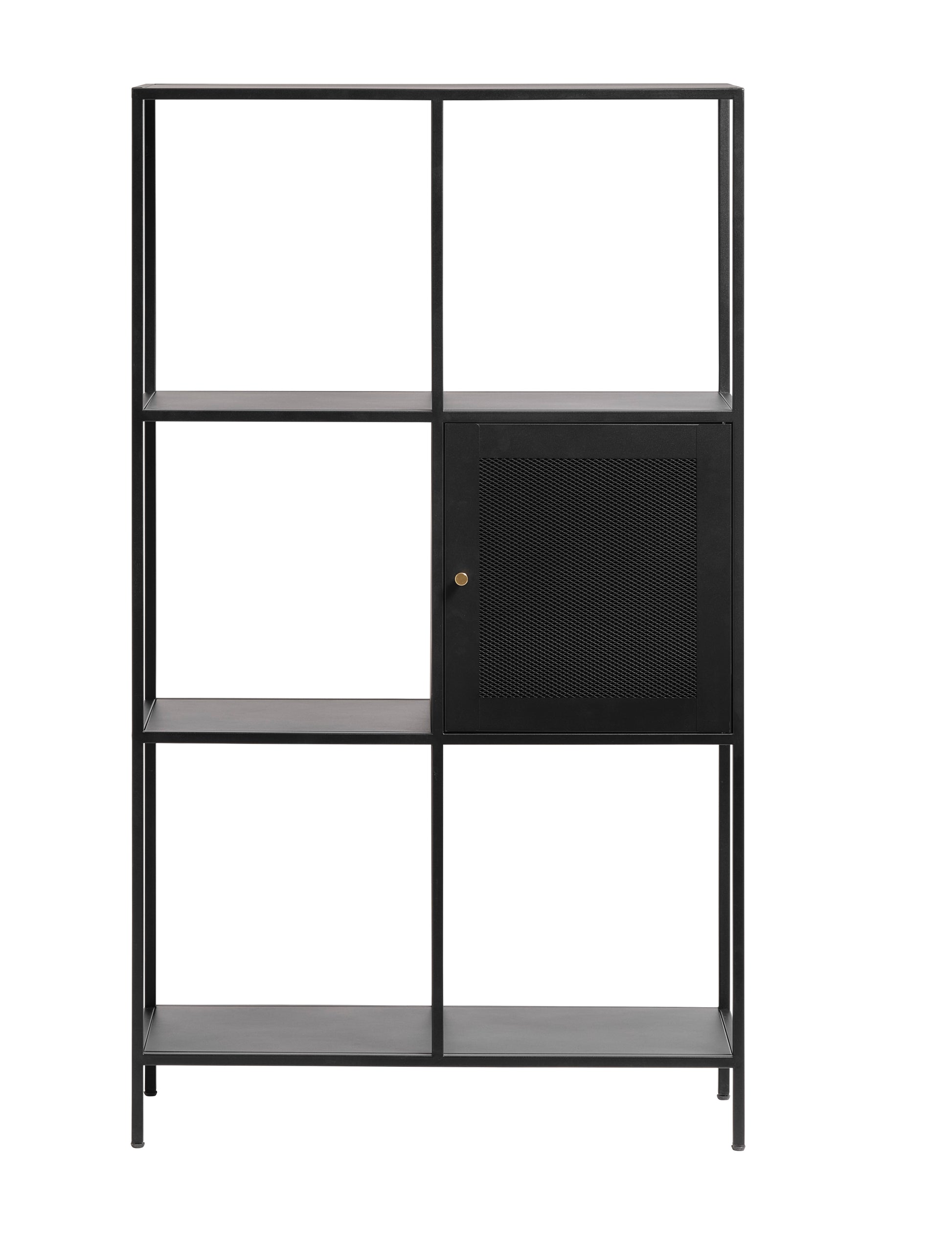 Experience the epitome of refined modern design with this metal bookcase. Crafted with precision, the bookcase showcases a sleek black metal framework, providing an elegant haven for your treasured pottery, books, and curated collectibles. It features a discreet door, offering hidden storage for seamless organization, while the handles are available in two exquisite options: timeless black or opulent gold. Constructed from premium powder-coated metal, this storage cabinet seamlessly complements any room in your home, whether it's the bedroom, guestroom, bathroom, entryway, kitchen, laundry room, living room, den, or any space that craves an elevated touch. The bookcase arrives flat-packed in one box, ensuring effortless assembly and a hassle-free setup. Elevate your interior decor with this sophisticated metal bookcase, embodying a perfect fusion of modernity and timeless elegance.
