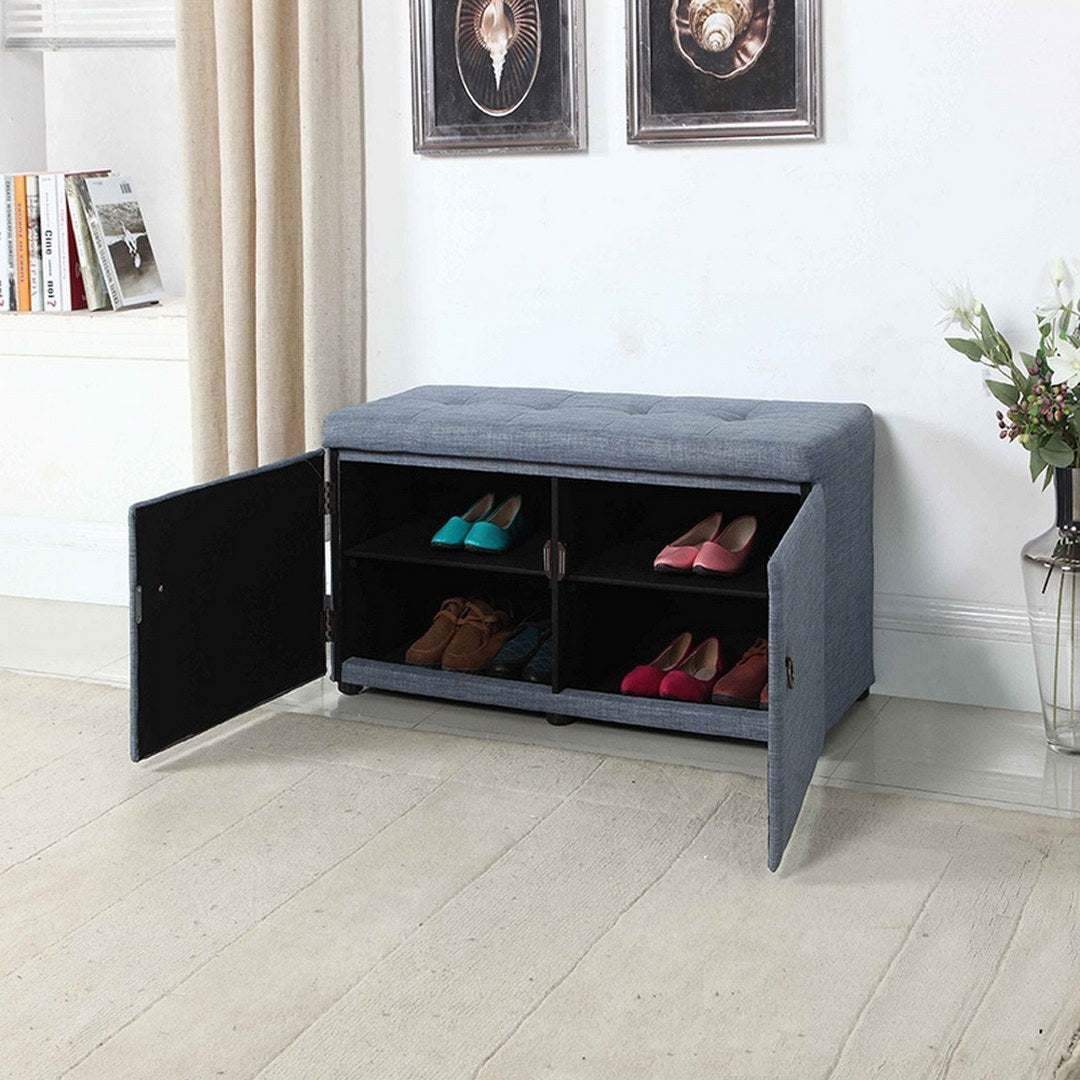 Upholstered Tufted Storage Bench gives you the best of both space and style. Made with plush fabric, the seat opens a 2-door closet in the front as a built-in storage hidden black compartment shelves for blankets, quilts, shoes and pillows. Keep it in the master bedroom or the drawing room as needed. Store in Style! Seating Weight Capacity: 225 lbs. Armless. Get the best of comfort and storage with the amazing Tufted Soft Fabric Storage Bench. Color: Slate Blue. Wood Construction Frame. Storage Opening is in the Front with a Metal Pull Handle. •Storage Dimension: Top Shelves - 18" L x 12" W x 6" H, Bottom Shelves - 18" L x 12" W x 6.75" H. Each Door measures 18" L x 12" W x 12.75" H. •18" H Bench Dimension without the legs. Leg dimension: 2" L x 2" W x 1" H •Storage Opening is in the Front with a Metal Pull Handle. Double Hinge on both side for stability. •18" H Bench Dimension without the legs •Wipe with a damp cloth or Upholstery Cleaner