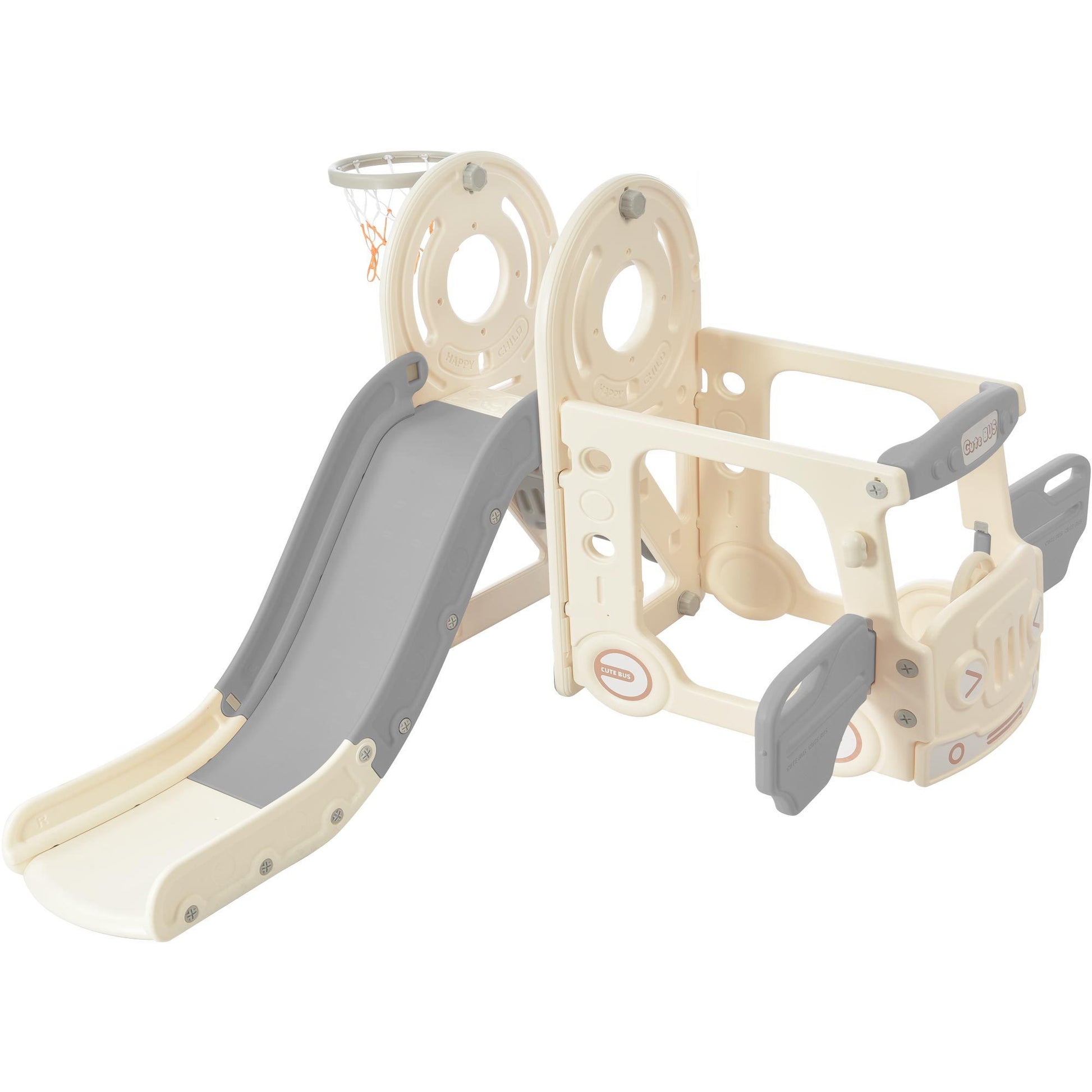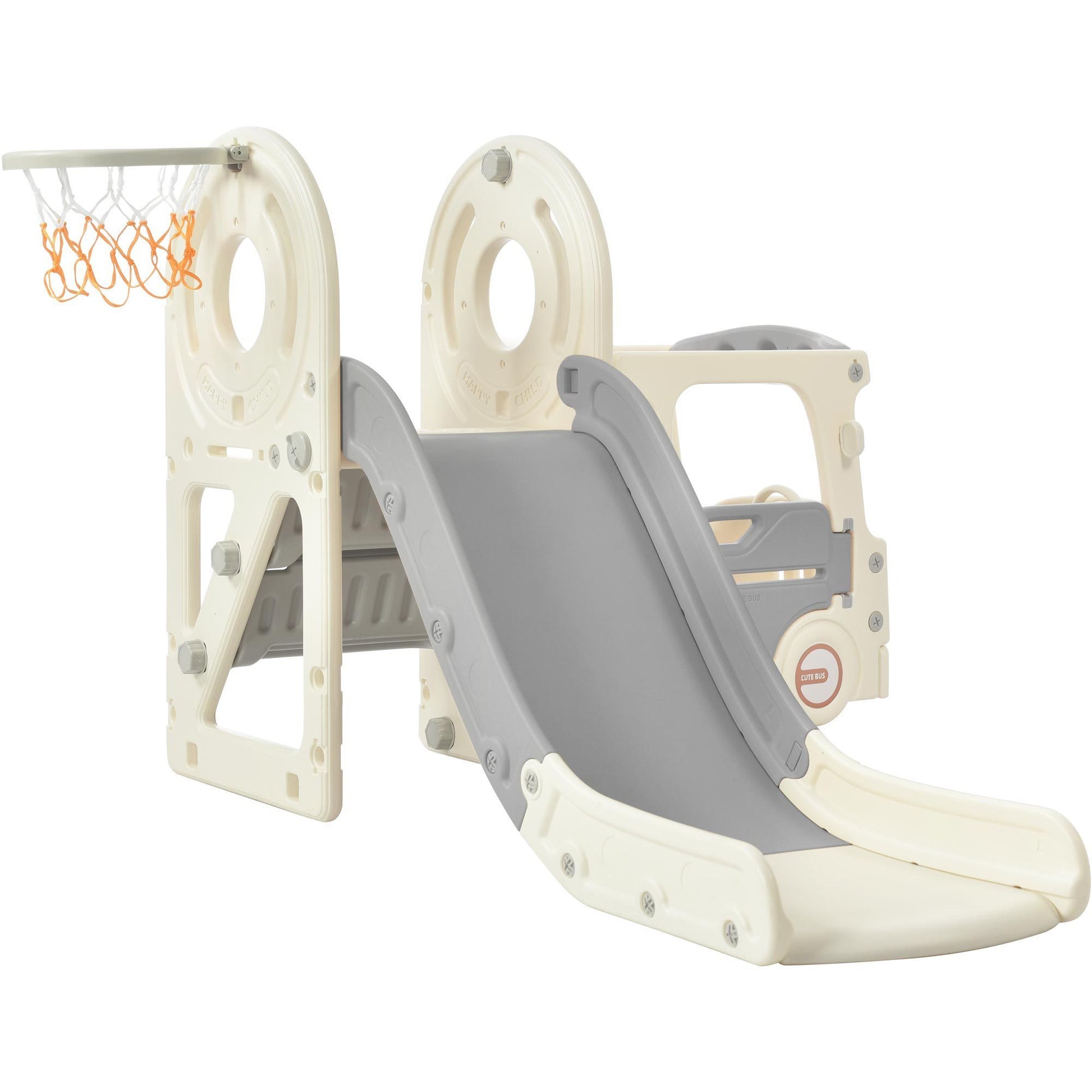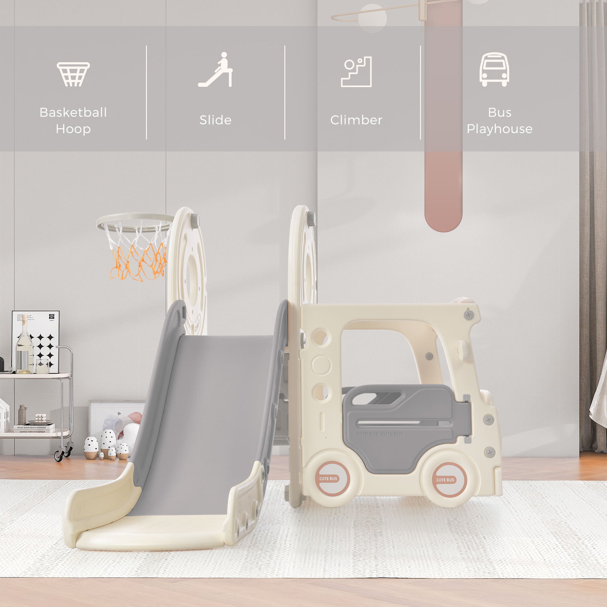 - 4 IN 1 Slide Set - This freestanding slide integrates 4 exciting play sections for kids. The two parts of the slide group have wide step pedals and smooth slides for children to slide down freely. The other part consists of a realistic bus model and a fun basketball hoop. This surprising combination can bring endless play fun to children.