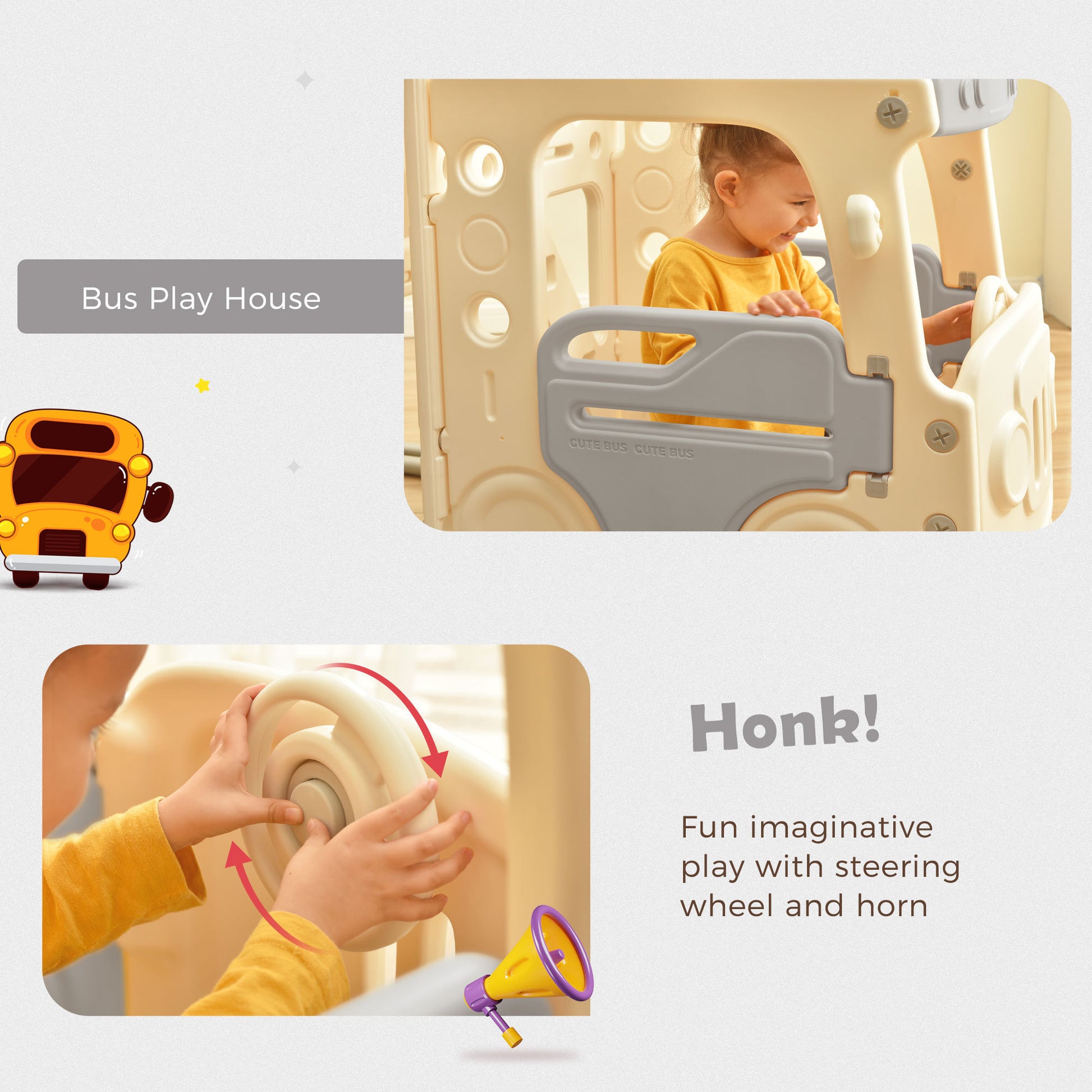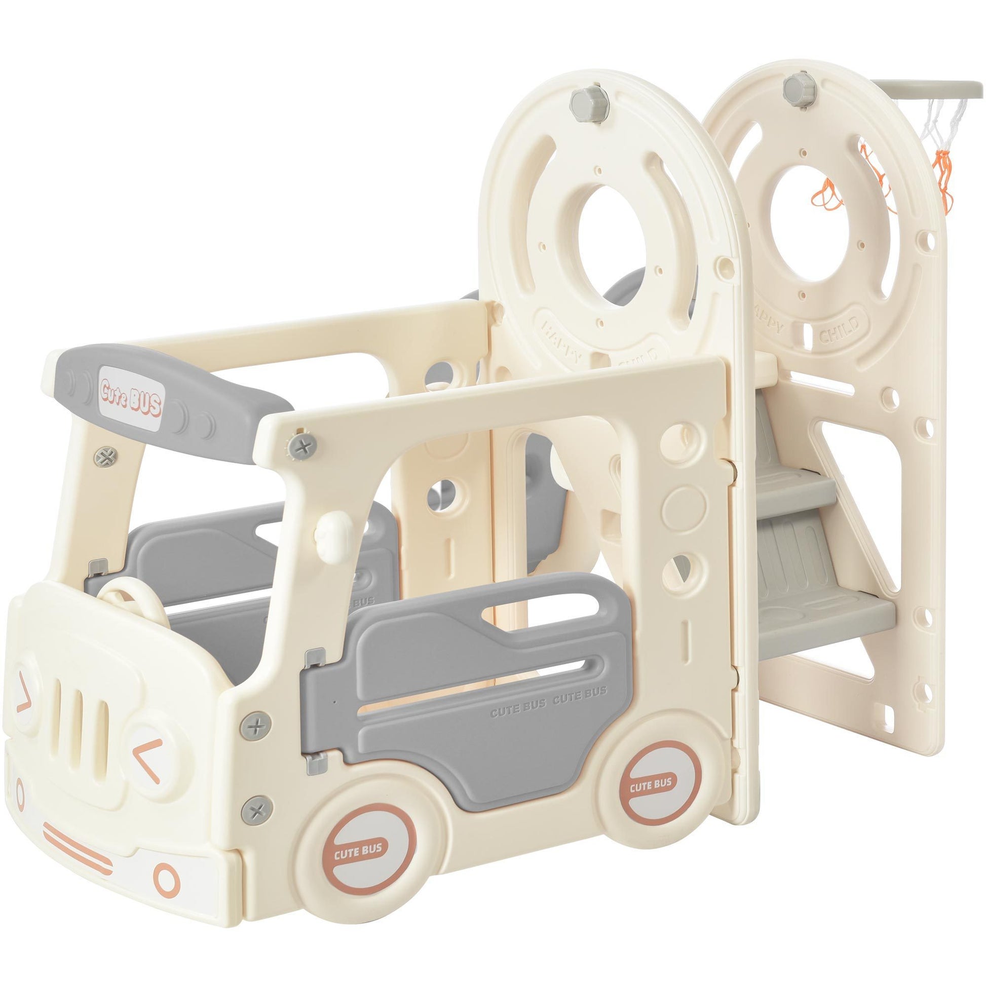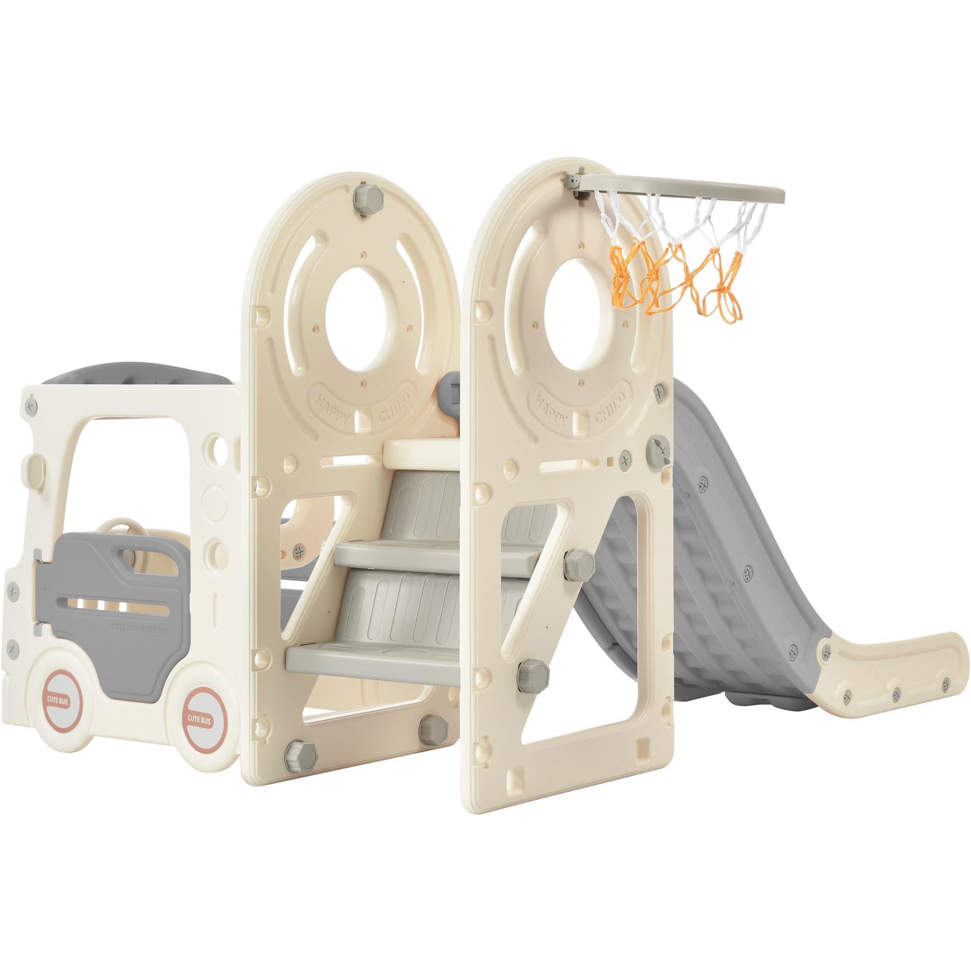 - 4 IN 1 Slide Set - This freestanding slide integrates 4 exciting play sections for kids. The two parts of the slide group have wide step pedals and smooth slides for children to slide down freely. The other part consists of a realistic bus model and a fun basketball hoop. This surprising combination can bring endless play fun to children.