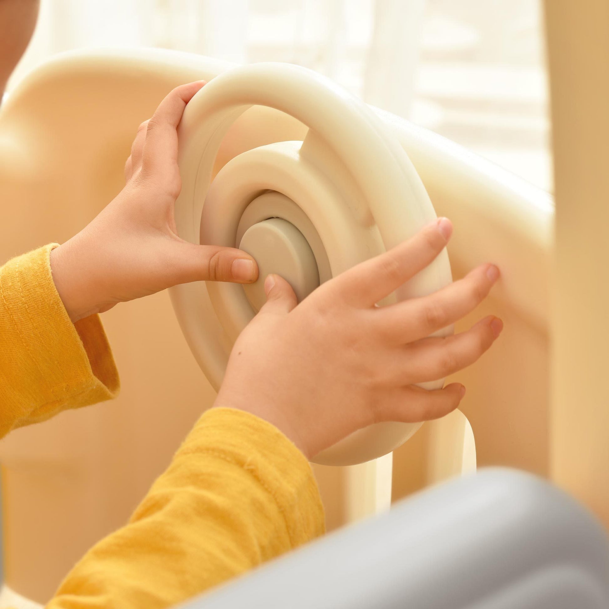 - Fantasy Design - We designed a realistic bus theme for this freestanding baby slide, making it totally unique and the perfect gift to surprise your babies. The bus model part includes an interesting push-button steering wheel, two lights and two rear-view mirror props, which provide some auxiliary educational functions while fully interacting with children.