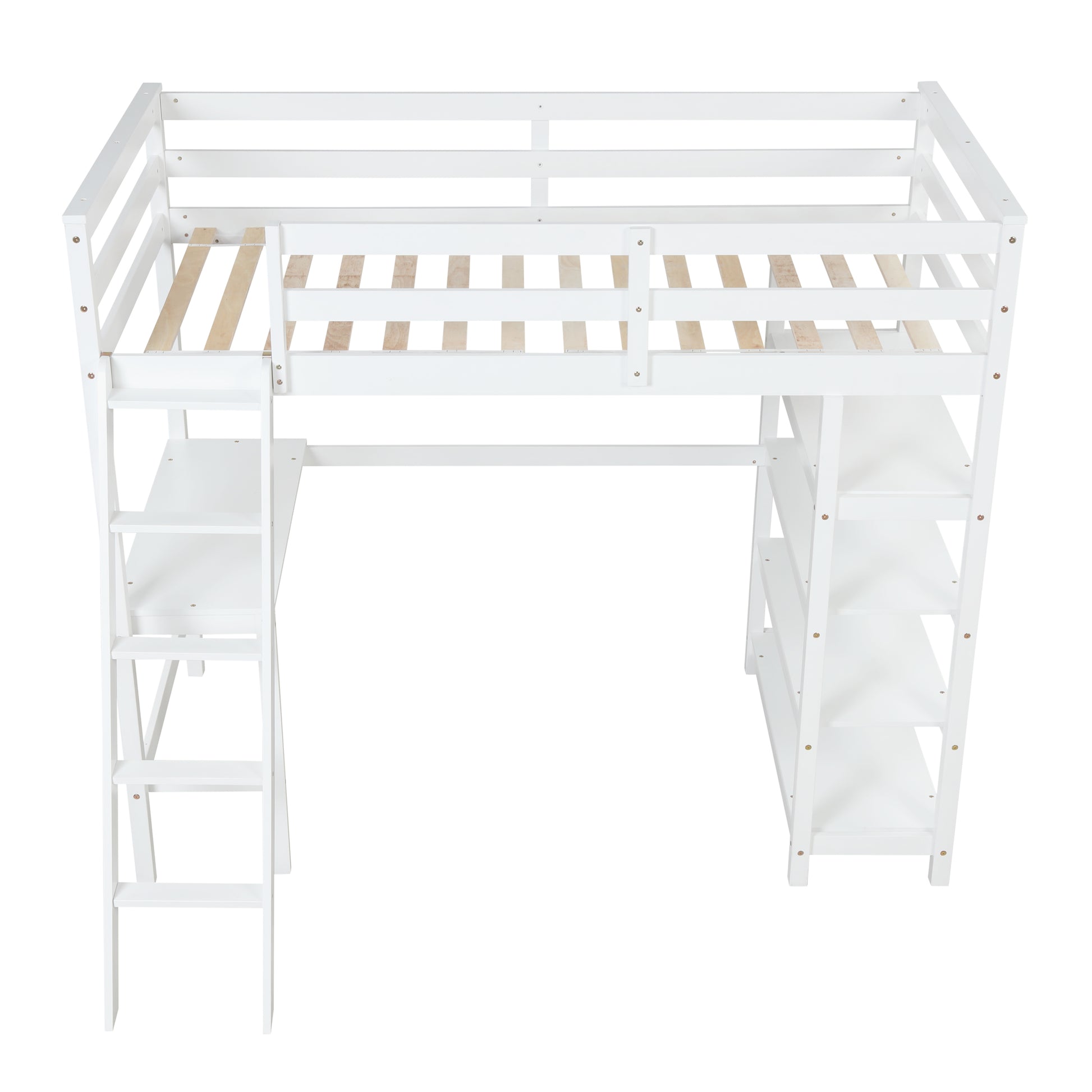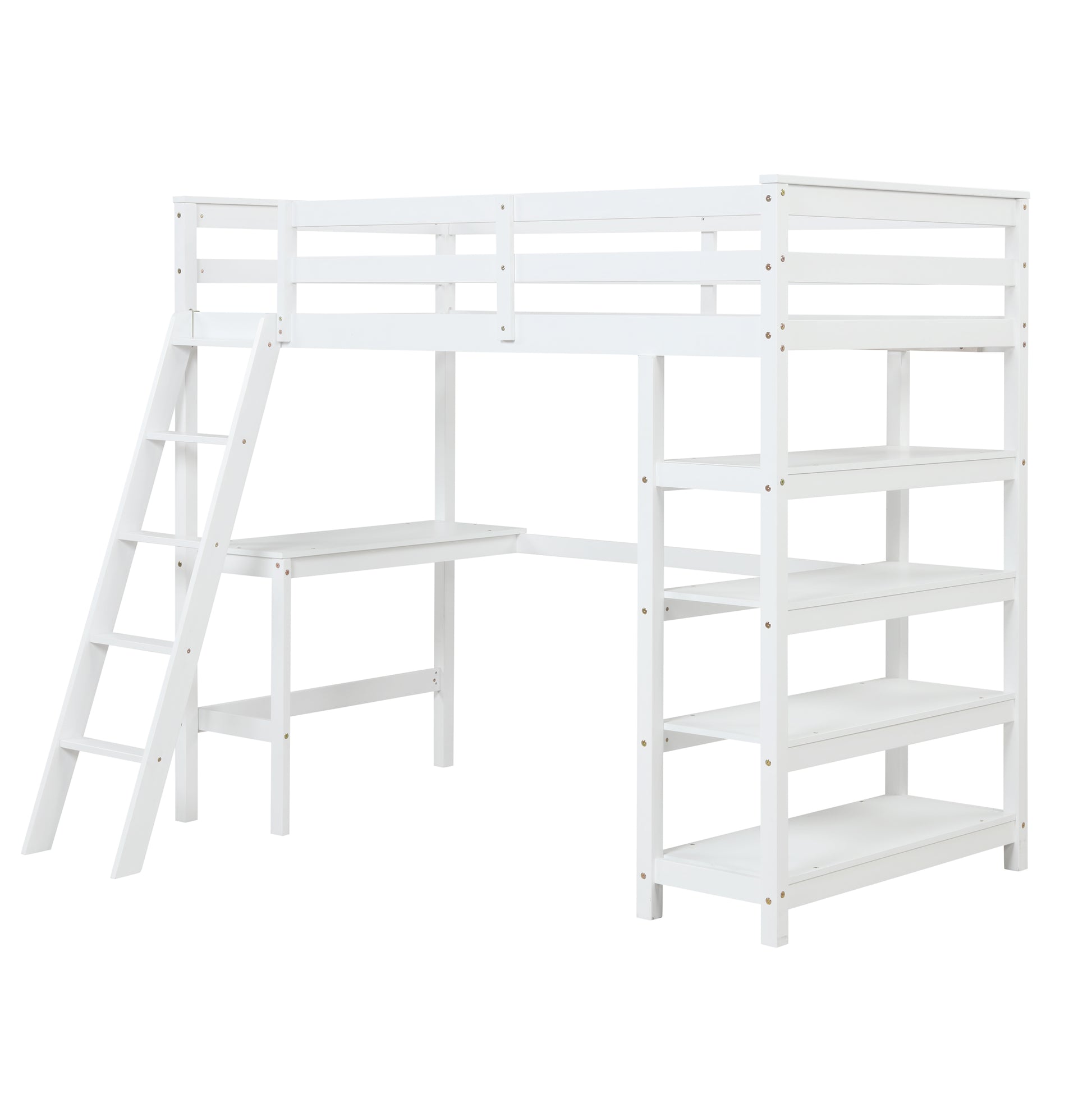 The loft bed combines bedroom and study into a cozy and lovely space, below the upper bunk there are a built-in desk and crosswise shelves on the other end ,which make kids to do homework and get books and daily items from the 4-shelf storage stand very conveniently. The shelves stand also can display anything lovely and keep your bedroom neat and concise , making this loft bed to show outstanding centrepiece to any bedroom. The inclined ladder on the