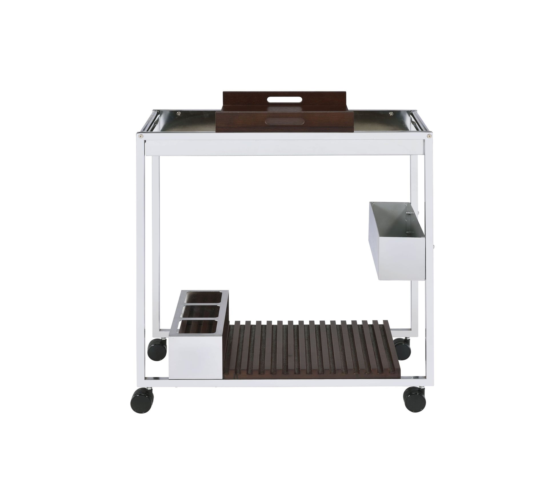 Product Details : KD, Rectangular Serving Cart • Storage: 2 Open Compartments, Wine Bottle Rack, Stemware Floating Shelf (2 Shelves) • Removable Wooden Serving Tray • Wooden Top • Metal Open Frame with Caster Wheels •• CONSTRUCTION] Wooden Tray/Shelves: Wood Veneer (), MDF • Metal Frame: Chrome Electroplating, Metal Square Tube ••