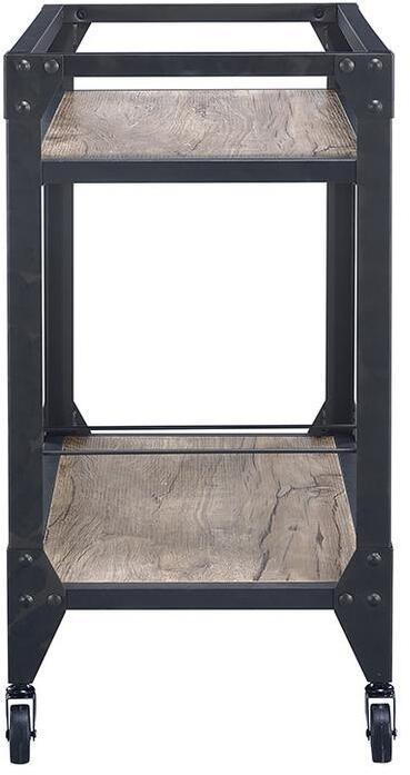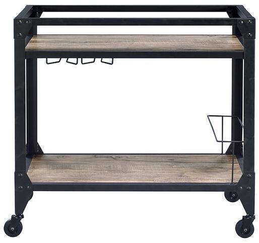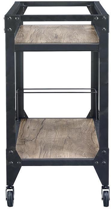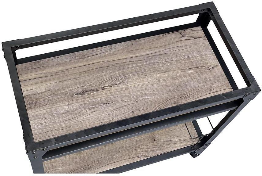 Romance : Round out your entertaining space in versatile style with this Jorgensen serving cart. Showcasing an industrial design, it features a metal frame in a matte black finish, two shelves wrapped in wooden veneer, and plank-inspired canvas prints. This versatile four-wheeled cart is a must-have addition to your home.