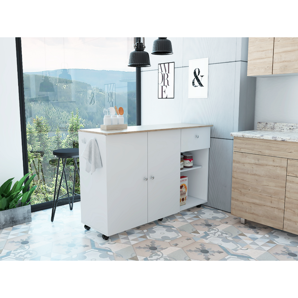 The Tuhome Victoria kitchen island and you are the perfect matches. A ton of features makes this product your best partner in the kitchen. Starting with its size!, a long yet narrow countertop (18.1-inch Deep x 53.5 inches Wide) will provide you with that extra space you were looking for without getting in your way. The modern design and color combination will make it stand out and turn heads. Featuring a Double Door cabinet with four very spacious interior shelves will allow you to put away those big pots and pans in an organized manner. Two open shelves allow you to place your more frequently used items that you want handy. The storage features are complemented by one drawer with a lot of room to fit plenty of silverware and utensils. Two towel hangers are a nice extra touch. Casters will provide mobility when needed with a locking mechanism that will secure the product in place whenever you want it.