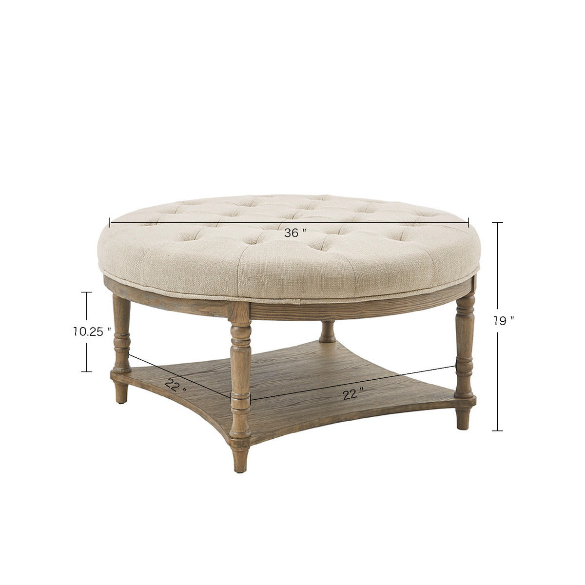 The Martha Stewart Cedric Accent Ottoman brings a touch of elegant style to your living space. This round ottoman features a button tufted top upholstered in a rich cream fabric with high density foam filling providing exceptional comfort. A lower veneer shelf and solid wood turned legs showcase a smooth reclaimed grey finish to complement the upholstery. Add this round accent ottoman to your living room to give your space a touch of elegance and functionality to your decor. Assembly is required and no tools are needed. |