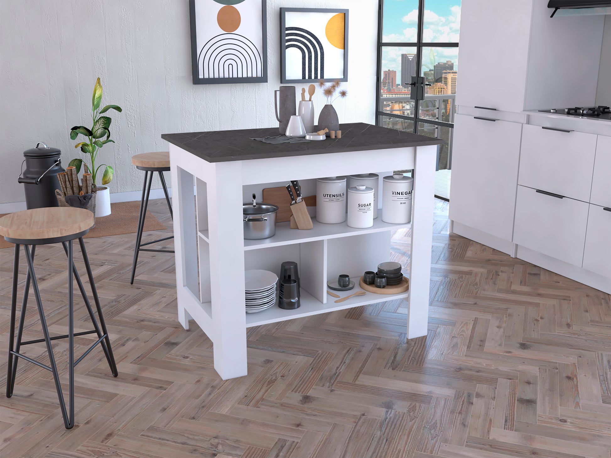 The TuHome Cala Kitchen Island brings style and functionality to your kitchen space. The large tabletop provides an open work area / display shelf. Below the tabletop, you will find one side with two shelves for additional storage space (12 In Height x 12 in Deep x 38 in Lenght). The bottom shelf is split into two equal sections, all of them are perfect for displaying any decor, pots, pans or having kitchen utensils handy when you need them; The other side is designed to be a working station where you can sit with leg room to confortably prep your meals. This two-tone finished piece is sure to draw the attention of your guests. Product Dimensions: 35.4 H x 40.5 W x 27.5 D
