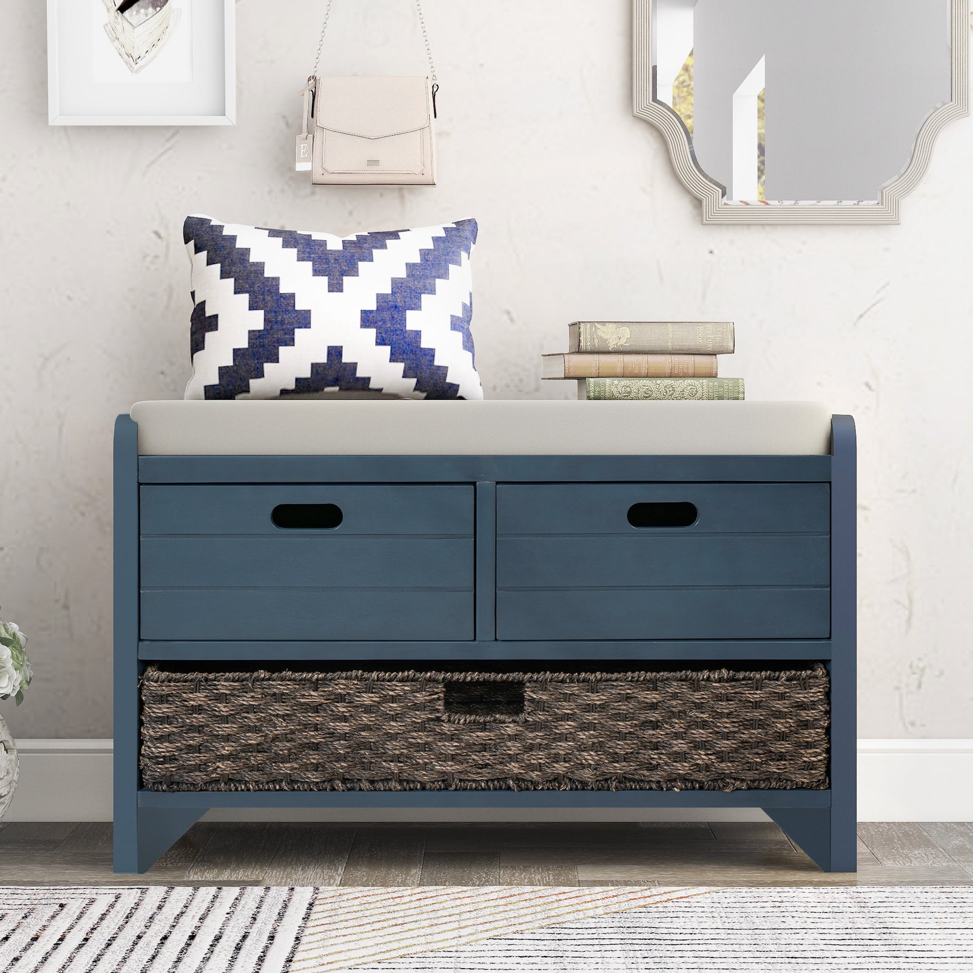 - Versatile Use:Place this rustic storage bench anywhere in your home with its highly versatile design that will compliment a variety of spaces. Enjoy the thick cushioned upper to take a breath or relax on the bench, the basket and 2 drawers make this piece the perfect contender for shoe storage in your hallway or an organizer in bedroom or living room.
