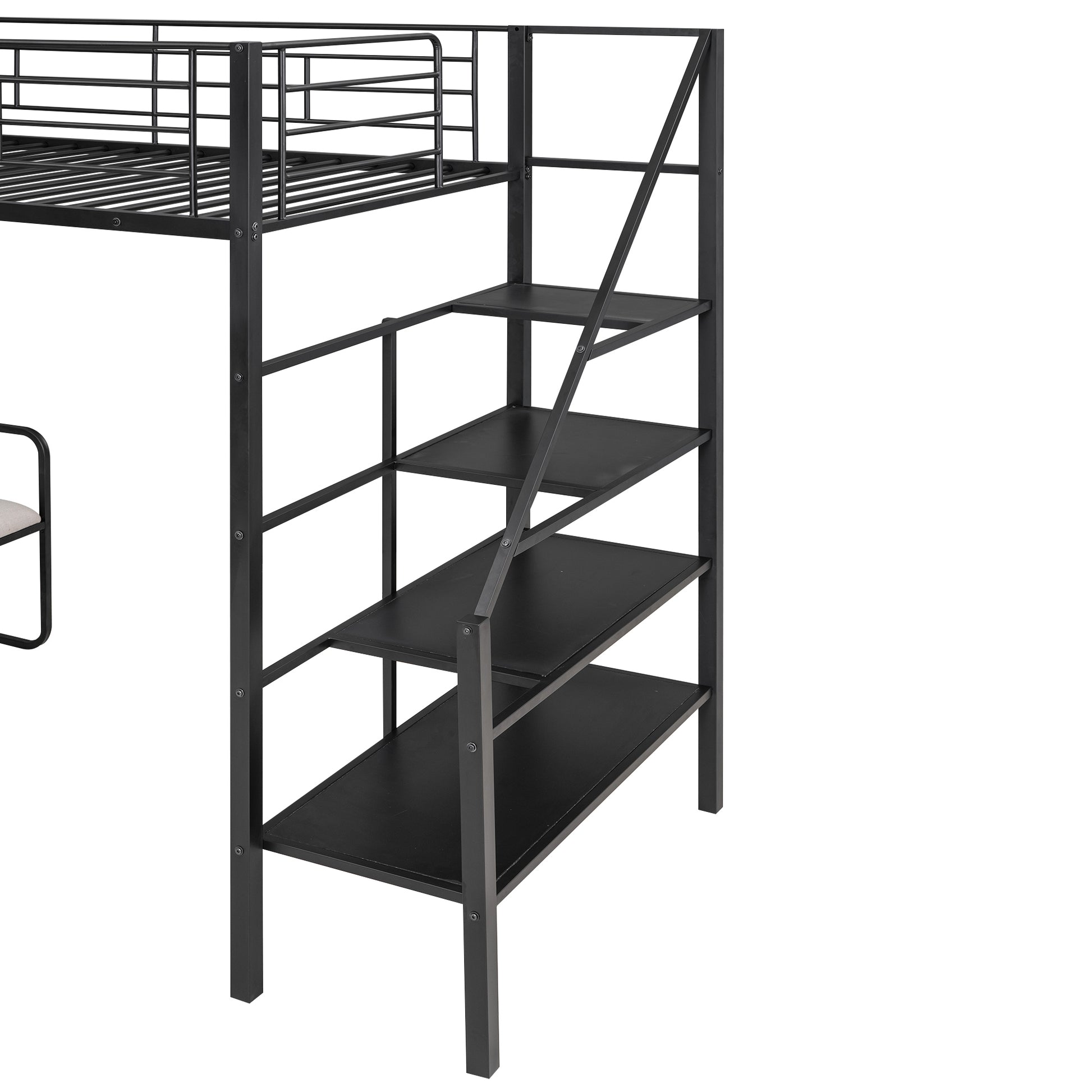 Keep your little child or teen's room clean and safe with a steel frame loft bed, featuring a built-in bench and stairway shelves to keep things tidy. This piece showcases heavy-duty construction that is coated in matte black and keeps your little one's room clean and modern looking.