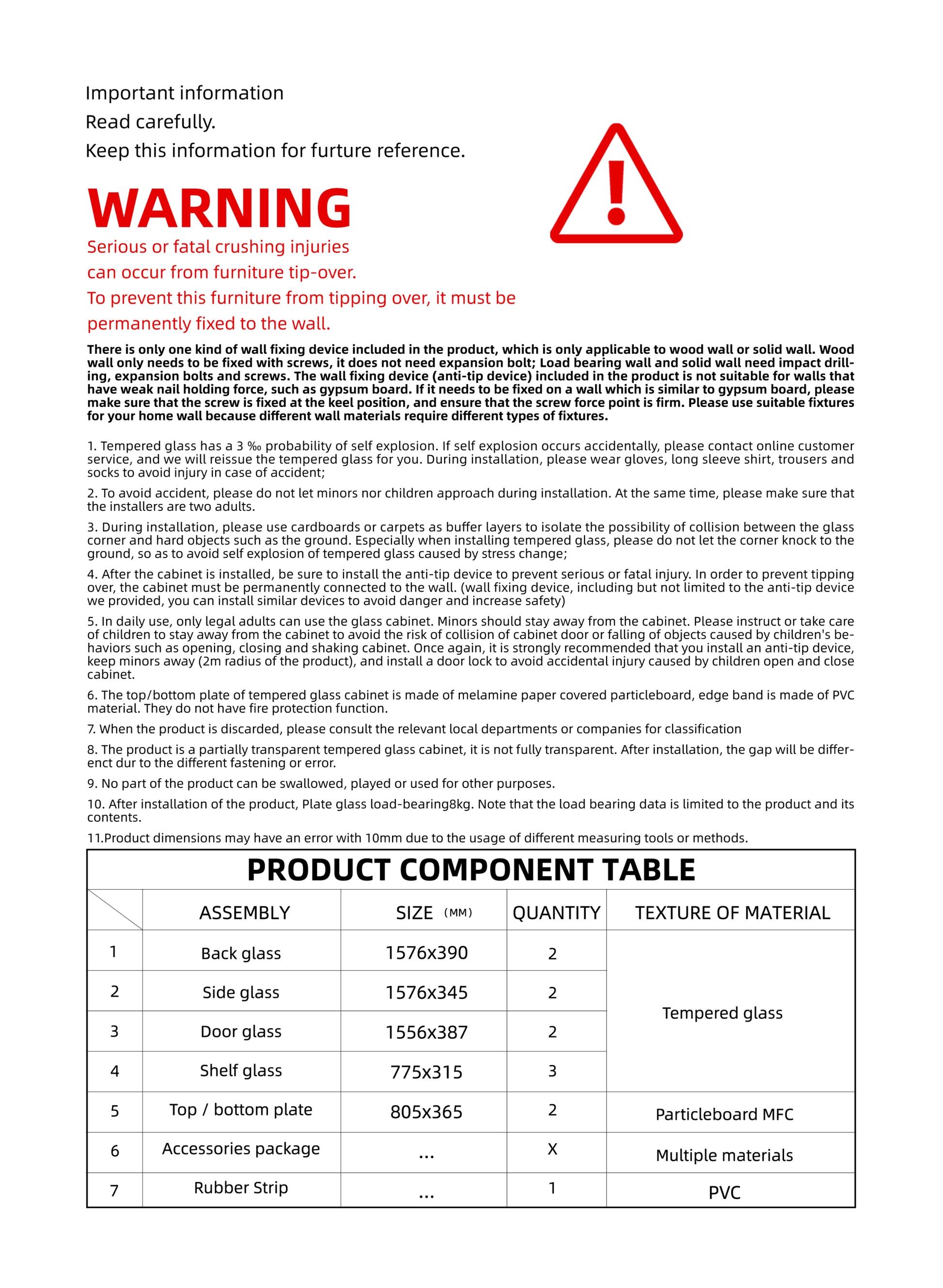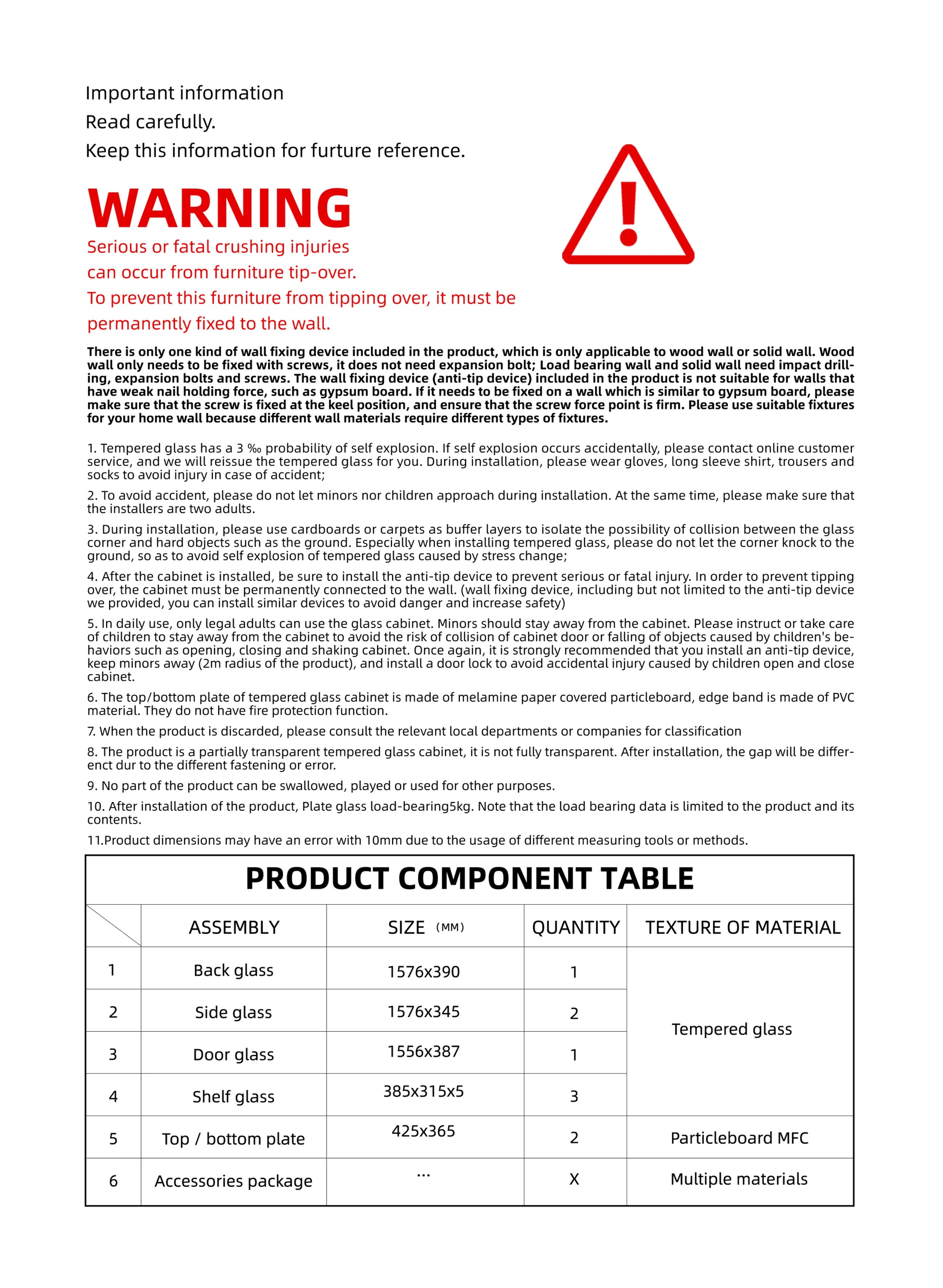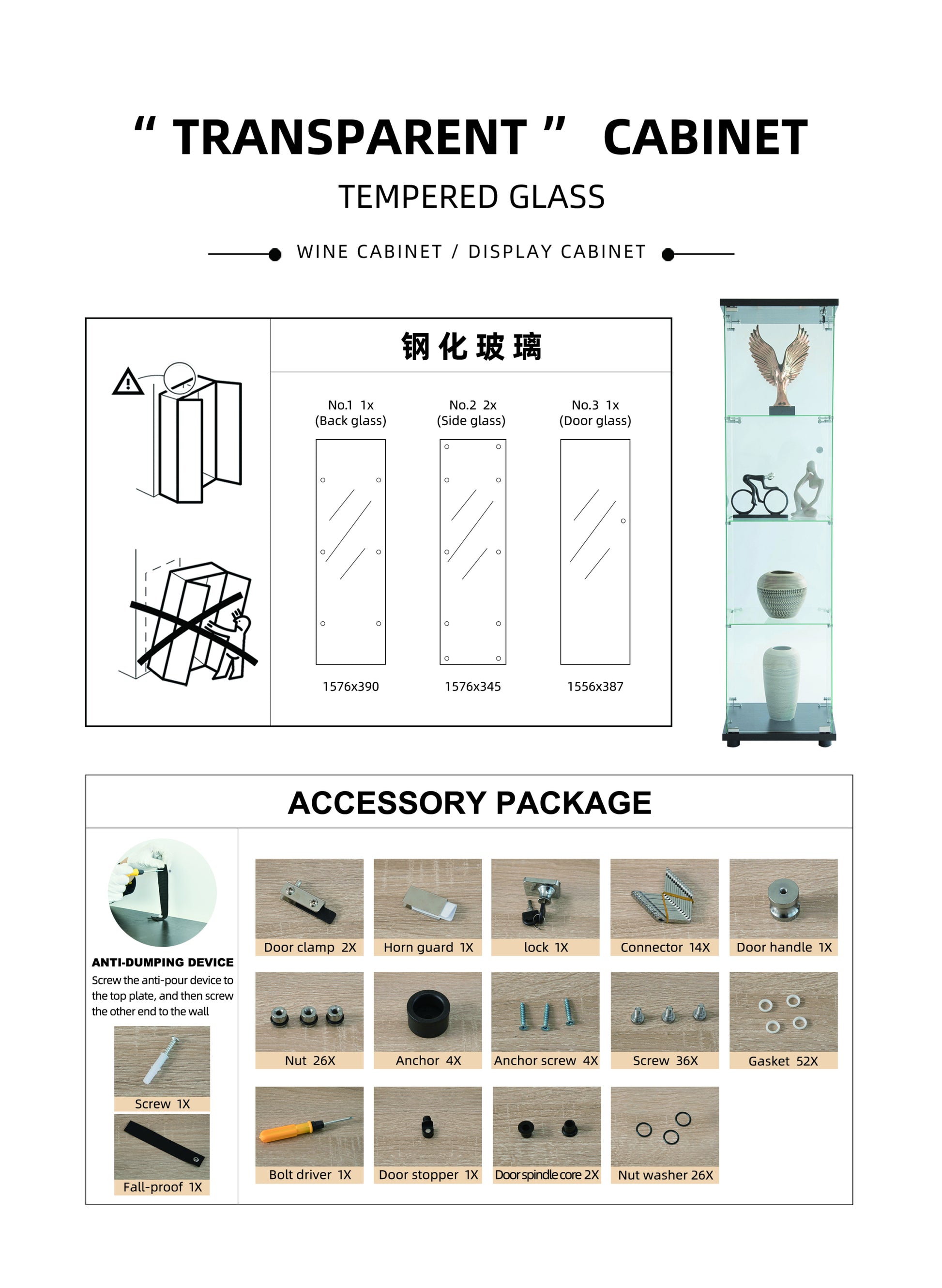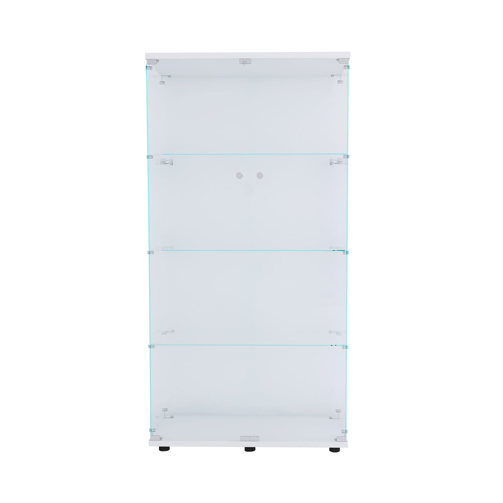 Two-door Glass Display Cabinet: Size 64.56”(H) x 33.69”(L) x 14.37”(W) inches, each tempered glass is 4mm thick. 4-shelf design is sturdy and stylish to display photos, books, action figures, wine and whisky; glass door is easy to open and close. Three colors available: White, Black and Natural Wood Enhanced Protection: Made of tough tempered glass and solid wood particle boards. There are bumper striTwops between glass plates and sides for maximum safety, durable and practical for everyday use. Store various items in this glass curio cabinet, the glass door helps keep dust out and well protect your collections Large Capacity: Each glass shelf level can withstand a maximum weight of 15 pounds, capacity in between is 15”(H) x 33.4”(L) x 14”(W), great for displaying books, photos, medals, action figures, wine bottles, toys, artwork, decorations Safe Installation: Adjustable feet can hold weight up to 440lb. Each display cabinet comes with a fixing device. In order to prevent tipping over, we recommend securely fixing the glass cabinet onto the wall. Ensure the safety for you and your family Widely Use: It can be used as a showcase in living room, a wine cabinet in the kitchen, bookshelf in the study, or a hand-made display rack in your collection room! Contact us if you received any damaged products, we will provide you with a satisfactory solution