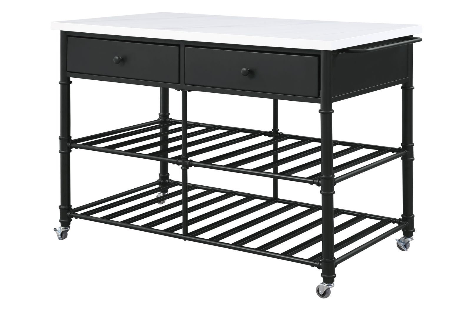 Romance : Give off a light and airy feel to a compact cooking space. The Emery Kitchen Island features a artificial stone top paired with two metal slatted shelves, creating a sleek, timeless silhouette that bring your kitchen an open feel. Two storage drawers and hanging rods help you organize a variety of tools in your kitchen. Four caster wheels roll easily, providing excellent mobility to this piece. Use this stylish yet functional addition to complete your kitchen decor.