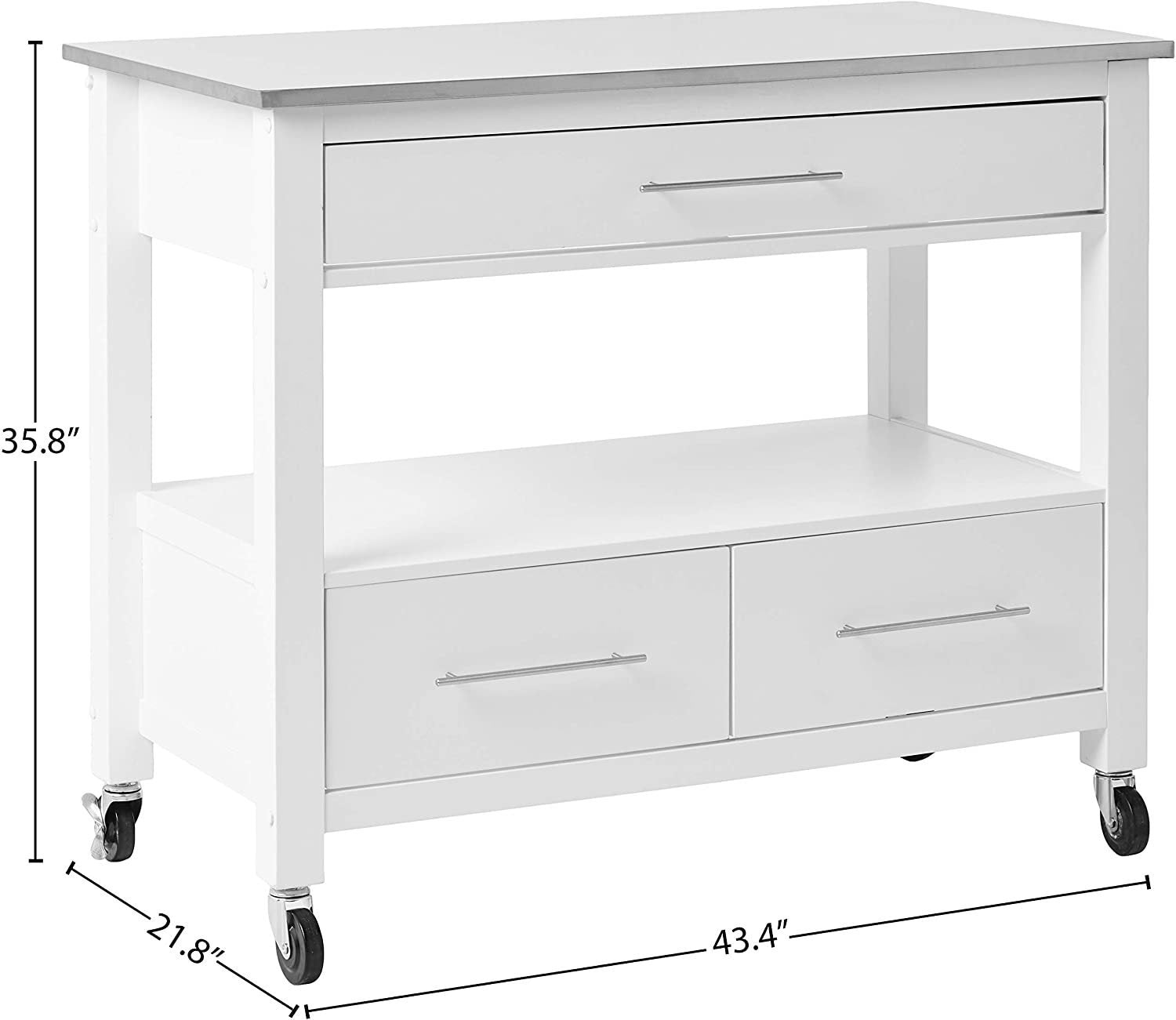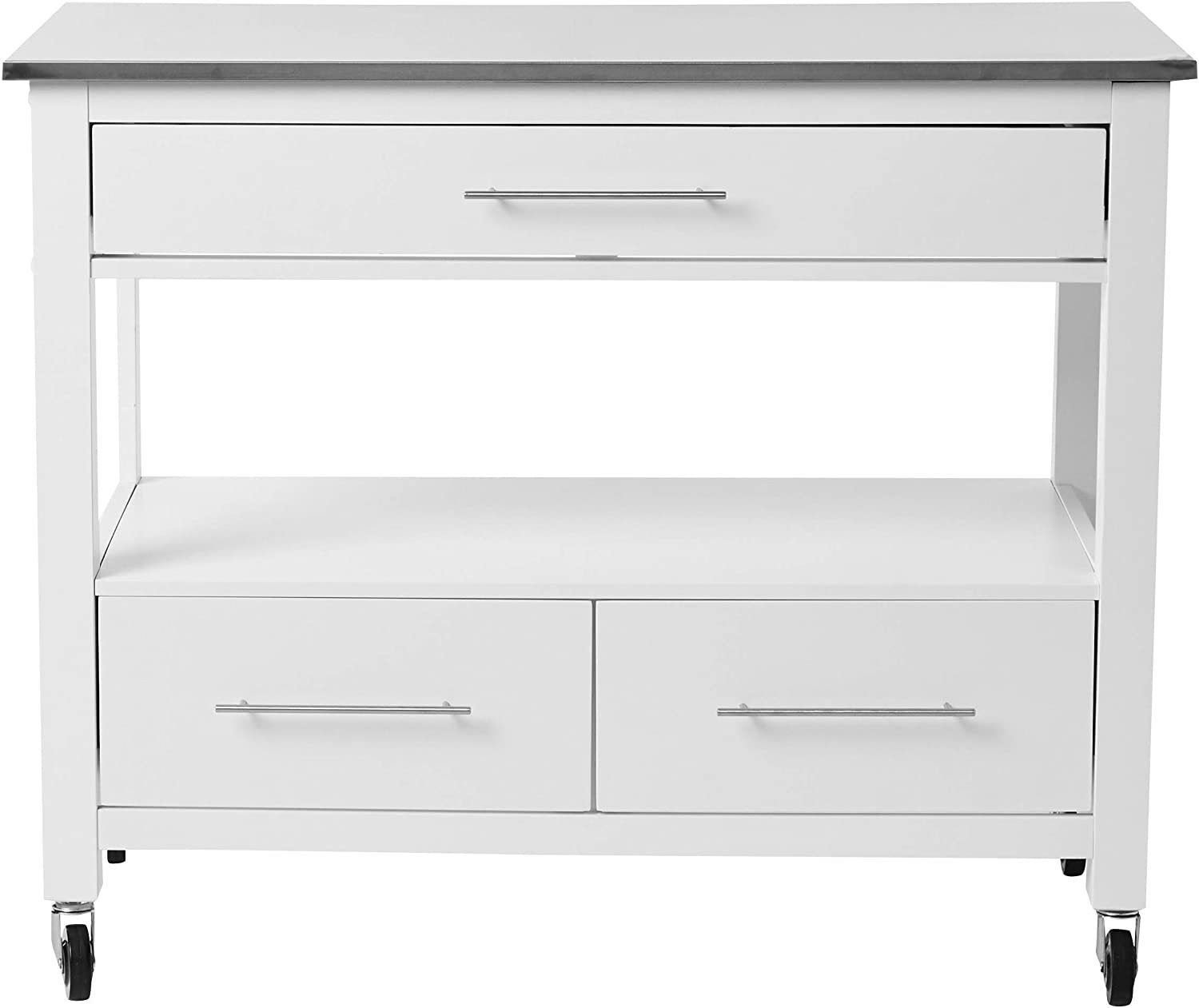 Our Ottawa kitchen island covers your need for storage and more. This multifunctional kitchen cabinet is a freestanding island that features four wheels for legs, each with a locking feature so it doesn't slip away while you are chopping fresh herbs and veggies. A towel bar, cabinet with concealed shelf, wine rack shelf, three drawers, and an open shelf provides plentiful space for cookware, non-perishables, and sundries. The frame is made with white finish, and topping this is a beautiful stainless steel countertop. Some Assembly Required. |