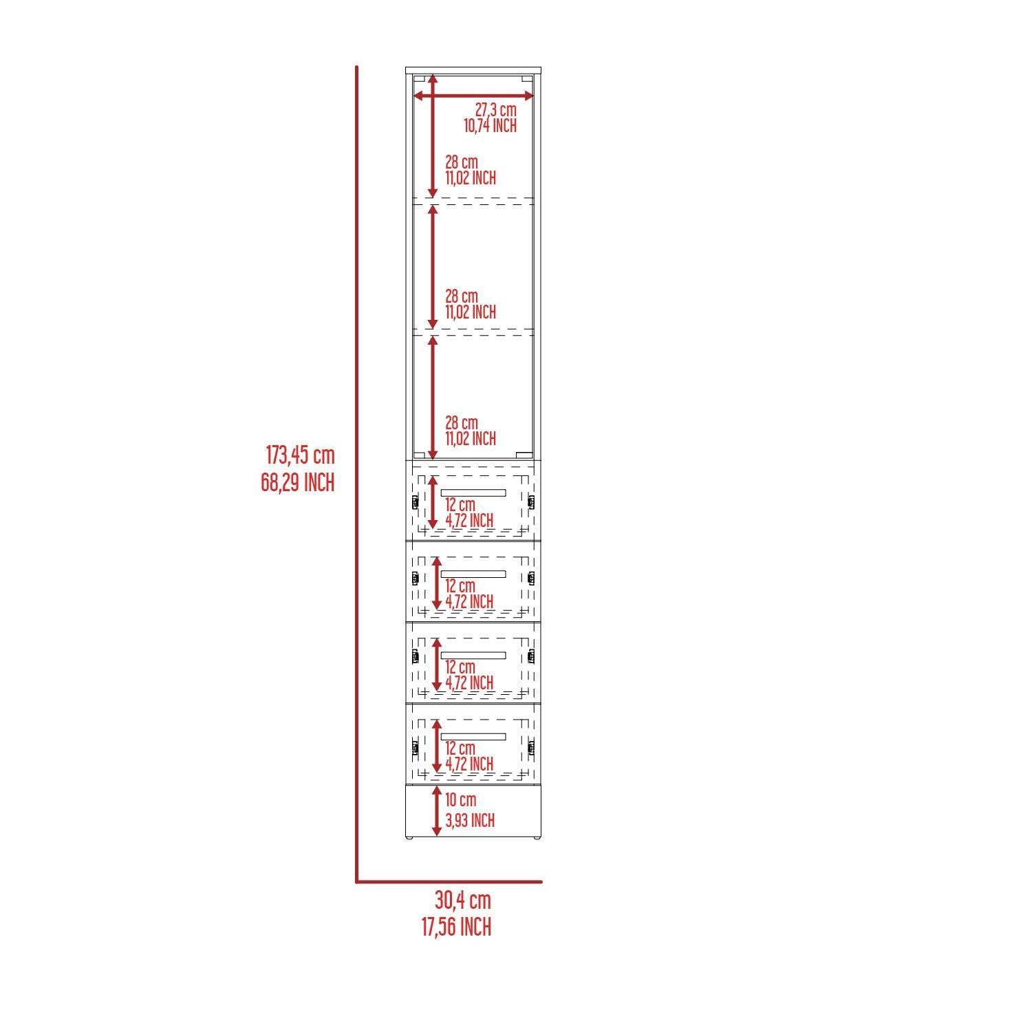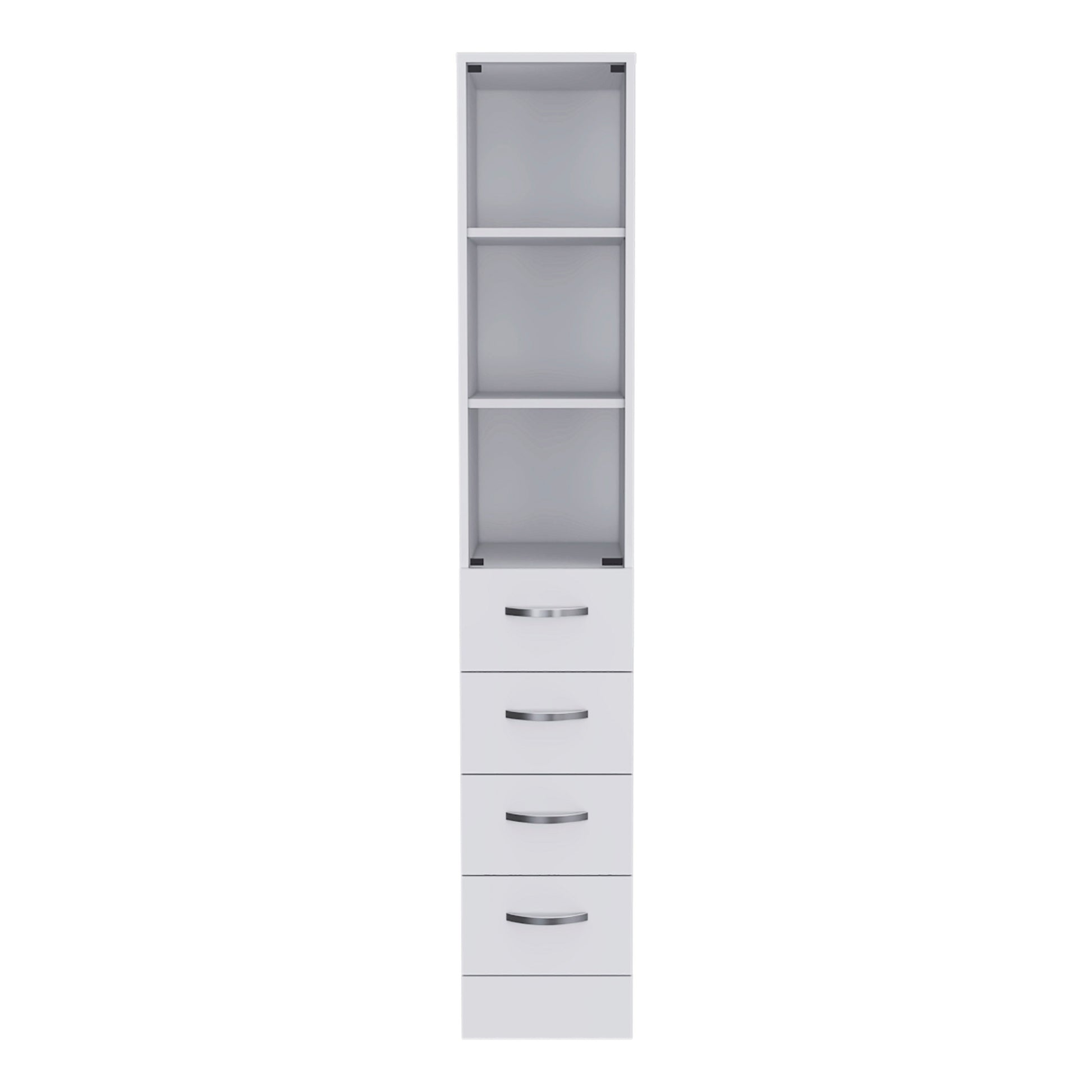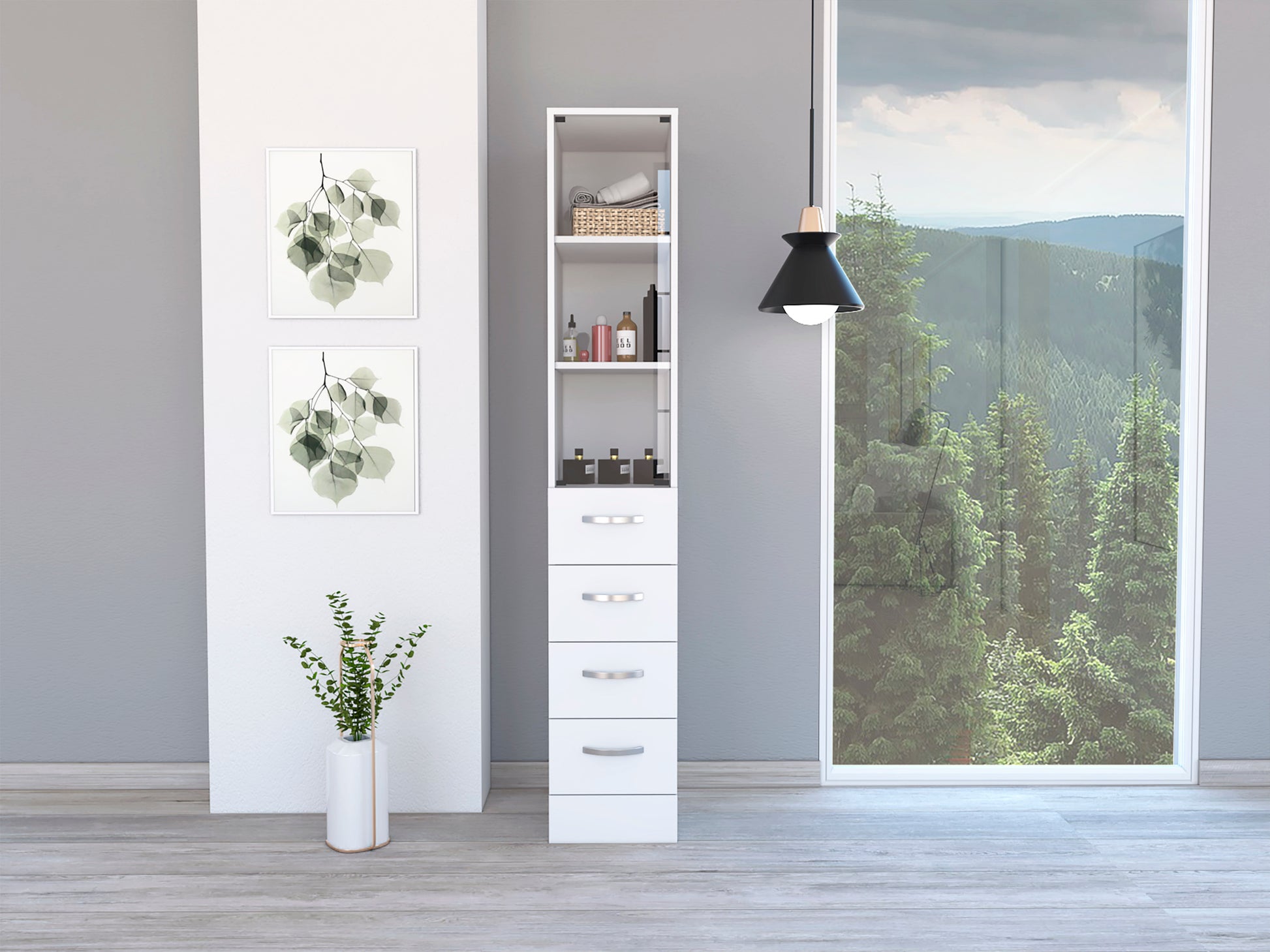 Keep your bathroom essentials looking tremendous and close by in this Vanguard Linen Cabinet, with its exclusive design on a white manufactured wood finish for a unique touch. Three open-top compartments (10,74''W X 11,02''H) offer ample space for folded towels, toiletries, and other bathroom necessities. The glass door keeps the dust-out and your linens fresh. Four lower spacious drawers (4,72''H X 10,74''W) provide you with extra privacy. With a 21.5 in diameter surface area in each drawer, you're sure to protect everything. With its white finish and metal handles, the Vanguard Linen Cabinet brings modern styling and design to any space you put it in. Product dimensions (11,97''W X 17,56''D X 68,29''H)