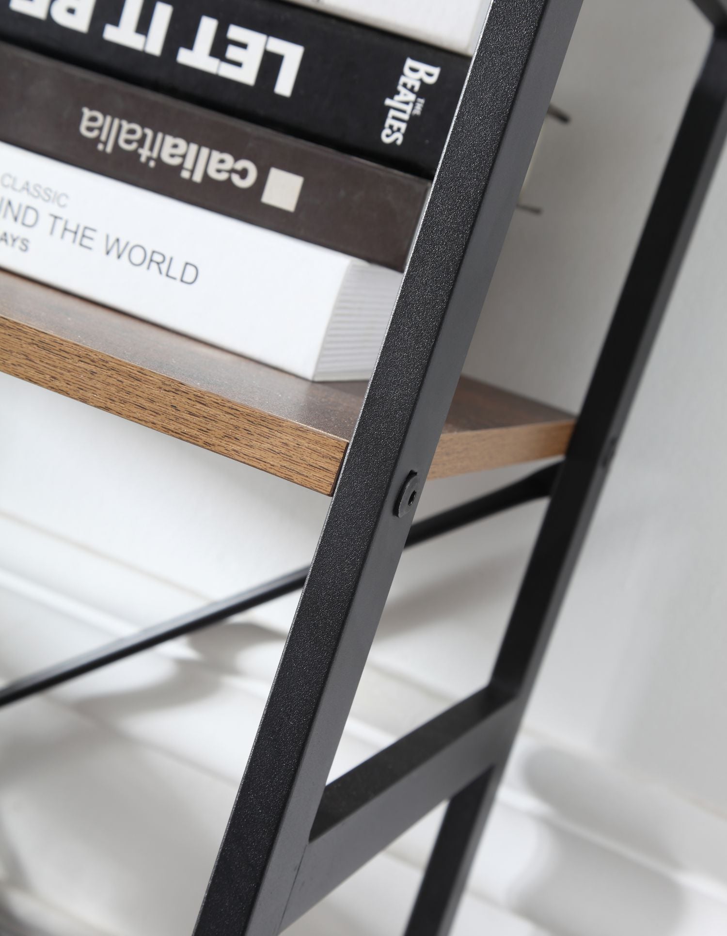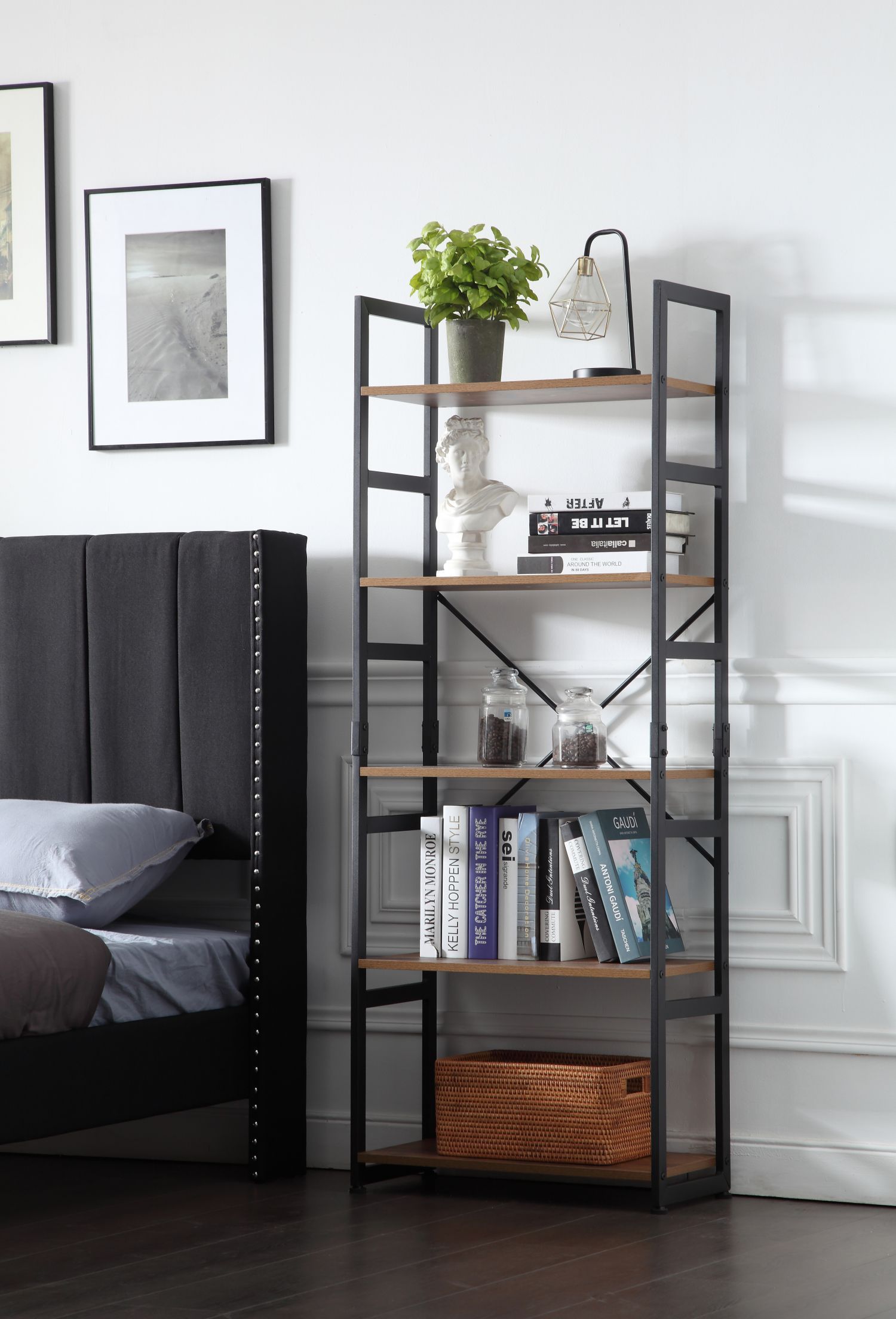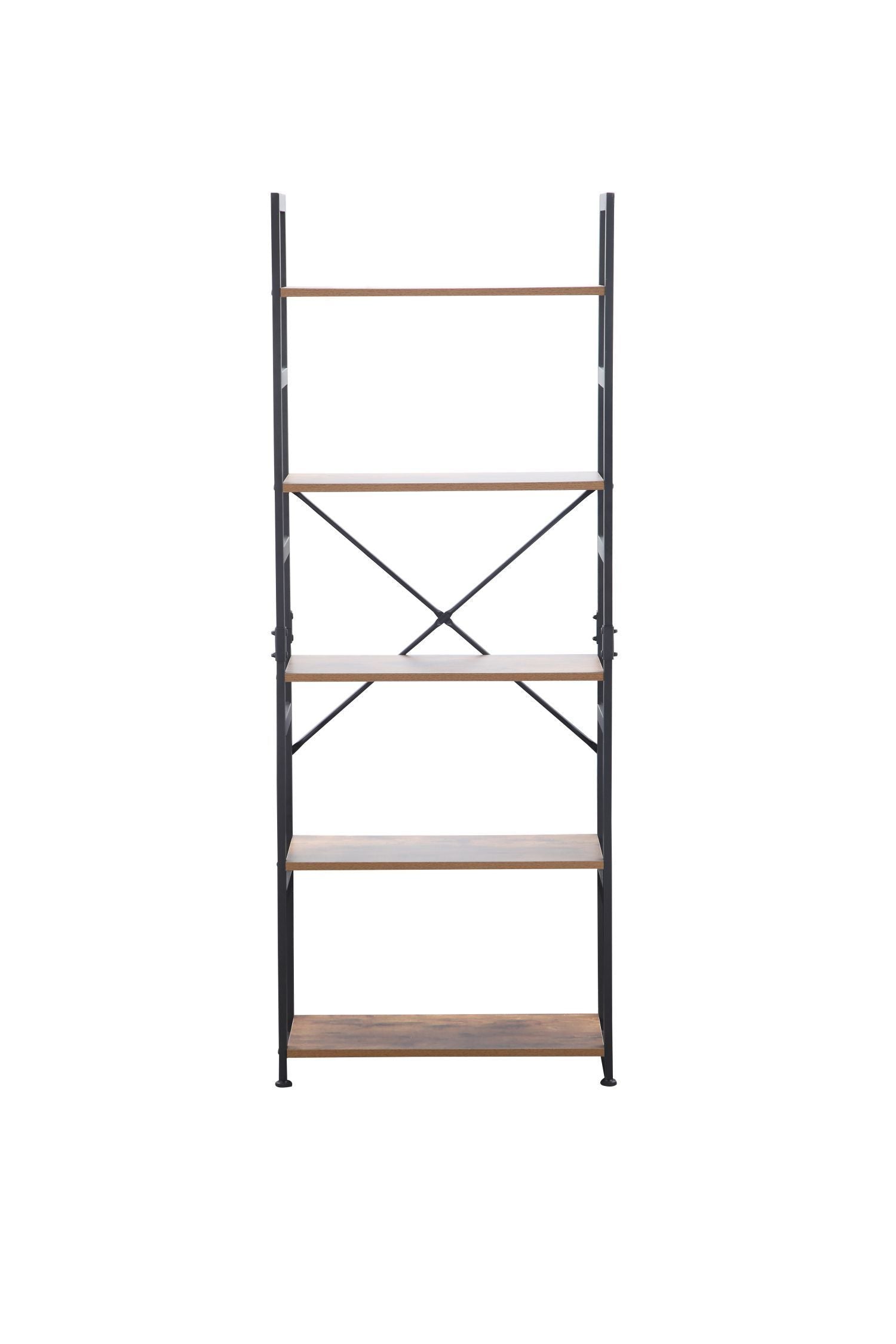 This bookcase brings sleek lines and convenient storage to your bedroom, home office, or living space. It has a steel, ladder-style frame with a black finish and features five engineered wood shelves in a brown hue. Vertically oriented with an angled silhouette, this bookshelf creates a streamlined industrial aesthetic that doesn't take up too much space. Use it to display your book collection, framed photos, and indoor plants.