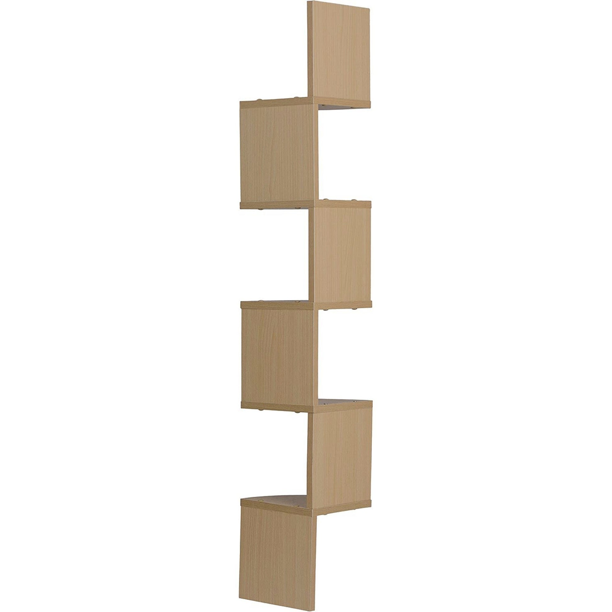 Decorative zig-zag corner wall shelf with 5 shelves makes space utilization possible from any corner. Creative design and space saving solution for small areas. Display collectibles, photos, toys, awards, CD's, videos, decorative items and more. Attaches to both sides of the wall with only 2 nails or screws. With its contemporary beech veneer finish, it is the ideal accent for any living space.