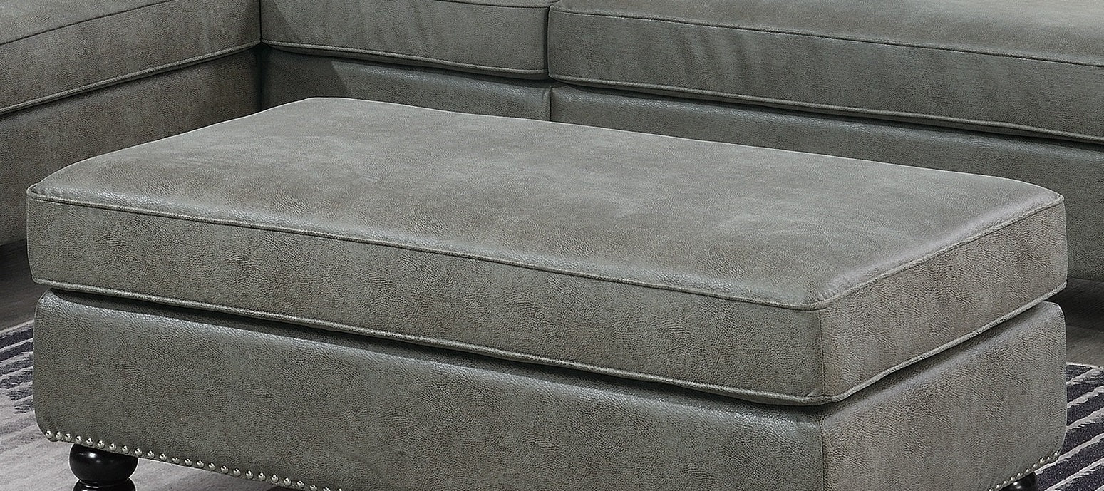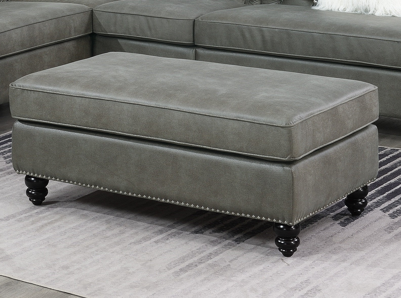 Description :- A traditional addition to your home is instantly made more dramatic with its rows of chrome nail head trim. Kick your feet up or serve trays of treats; the extra-large space on the cocktail ottoman lets you do it all. Its medium-firm padding cushion on top of this ottoman is wrapped in Breathable Leatherette upholstery. Purchase the matching sectional to complete your home. This ottoman is available in Dark Coffee and Slate Grey. Listing Includes - 1pc Ottoman Only. Dimensions - 46" x 25" x 19"H Materials - Breathable Leatherette Simple Assembly requires