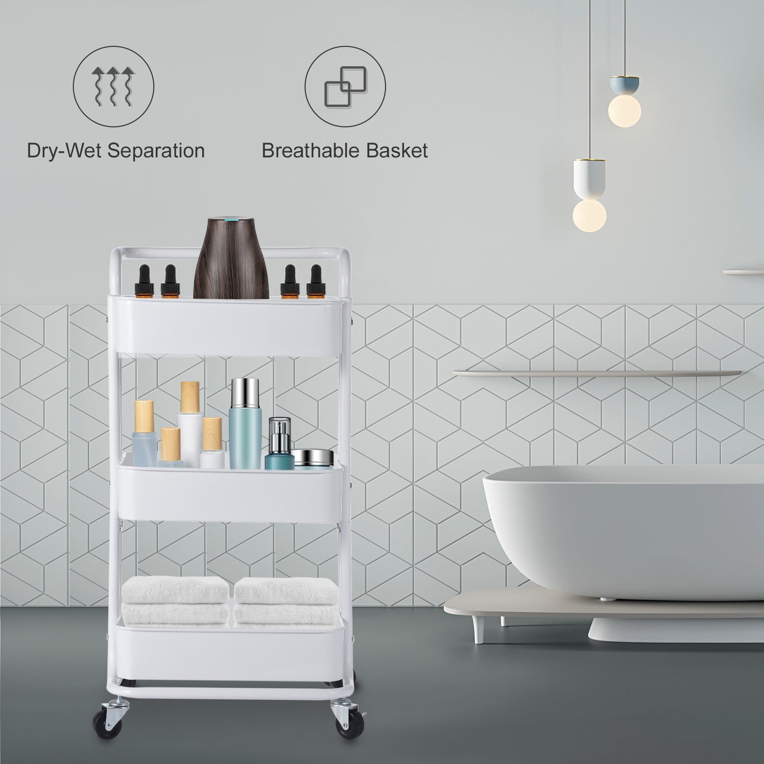 - 【Sturdy & Stable】The 3-tier mobile storage cart is made of high-quality steel frame , which is strong and durable, waterproof and wear-resistant . Each basket load capacity can reach up to 33 lbs.