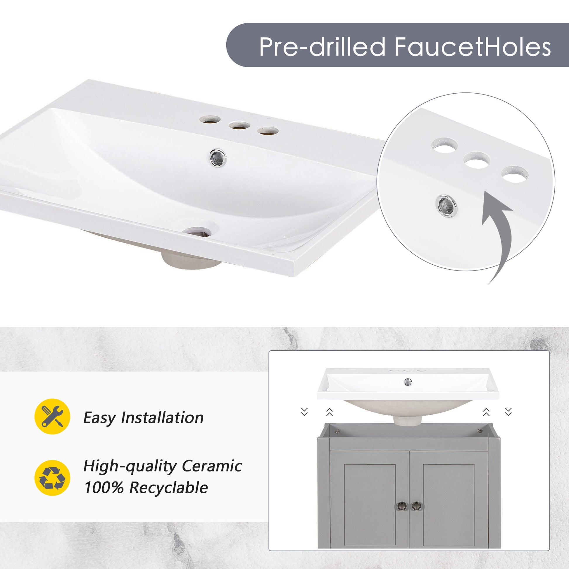 - ★Easy Assembly & Dimensions: This modern and simple style bathroom vanity has easy assembly steps to allow you install it by yourself. The instruction manual shipped with the products offers the procedure for installation. Take account of safety, the ceramic sink is individually packaged for shipping, in other words, there are TWO parcels for this bathroom vanity. The diameter of the middle hole faucet is 35mm, and the other two is 25mm. Please make sure that you chose the right size faucet.