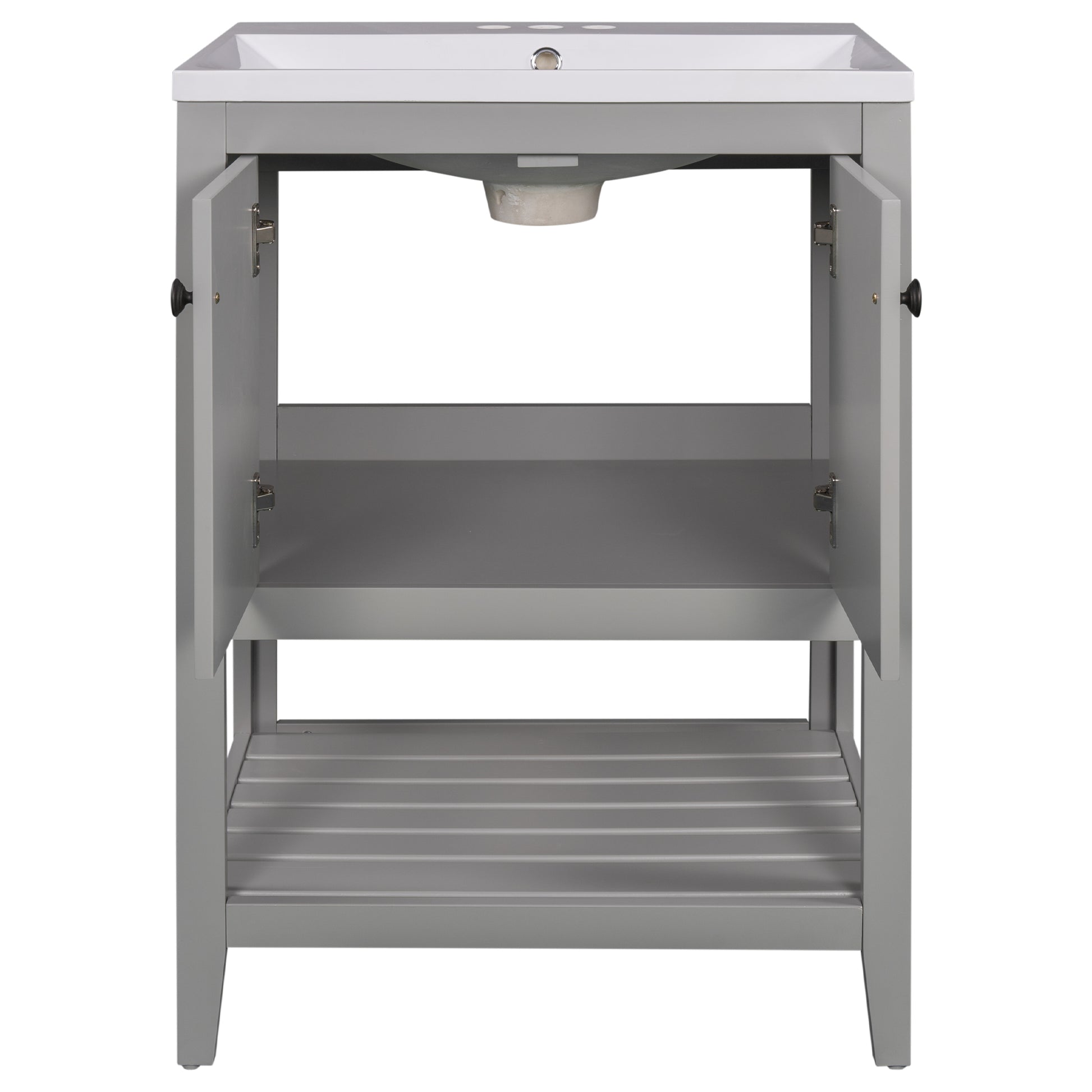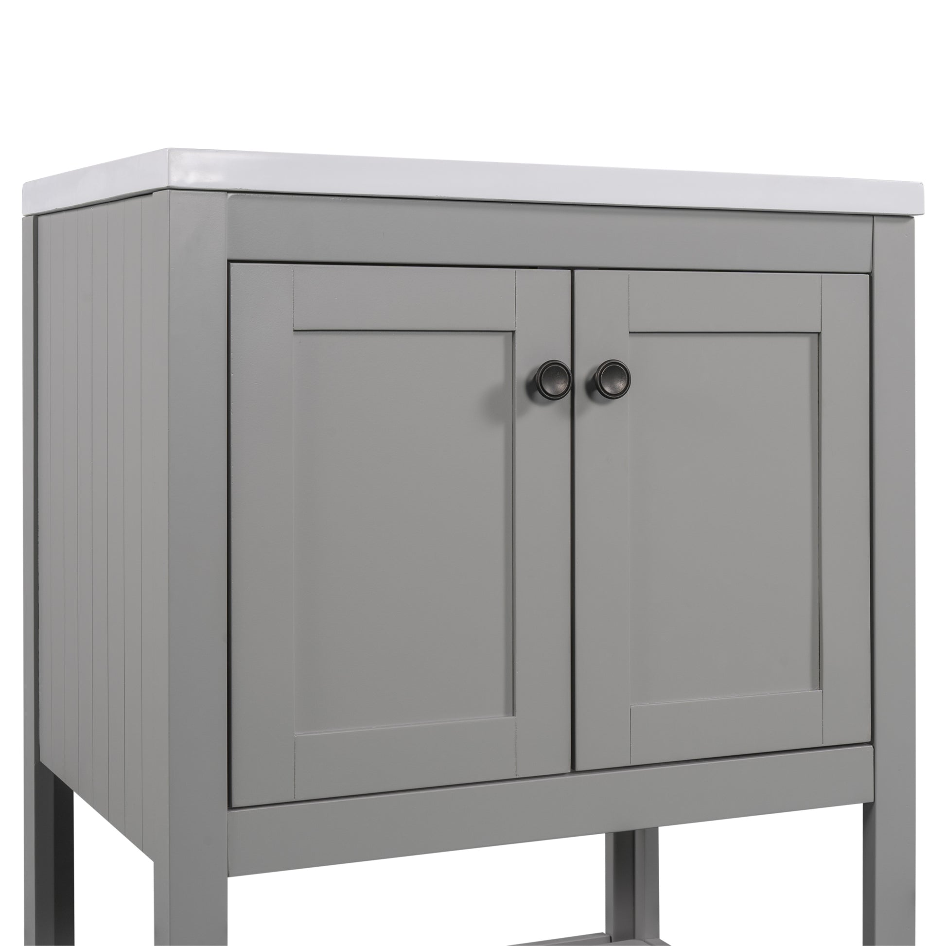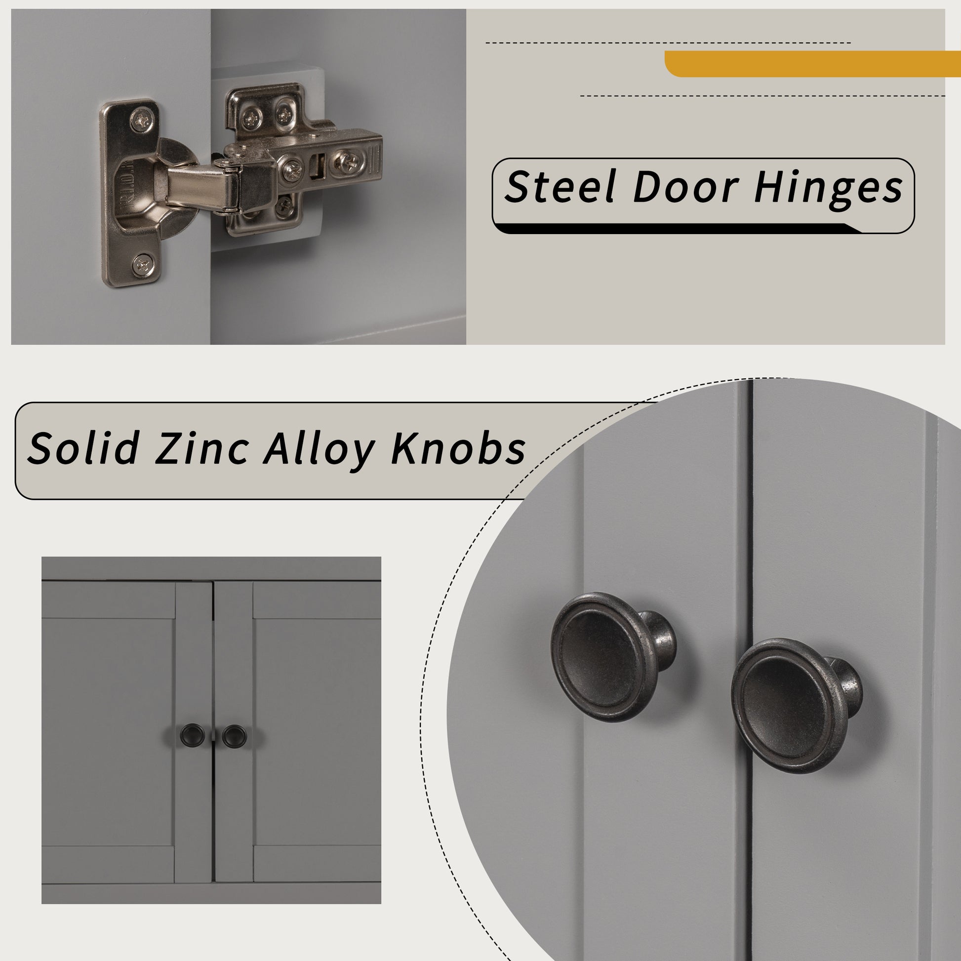 - ★Solid Wood Frame Construction: This bathroom vanity is made of birch wooden frame and MDF board, and the material of door hinges is stainless steel. These materials are all water-resistant and suitable for humid environment, that will allow longevity of this bathroom vanity lasts long. The round knobs are manufactured with zinc alloy, and the matte finish presents a high-end texture and makes a smooth feeling.