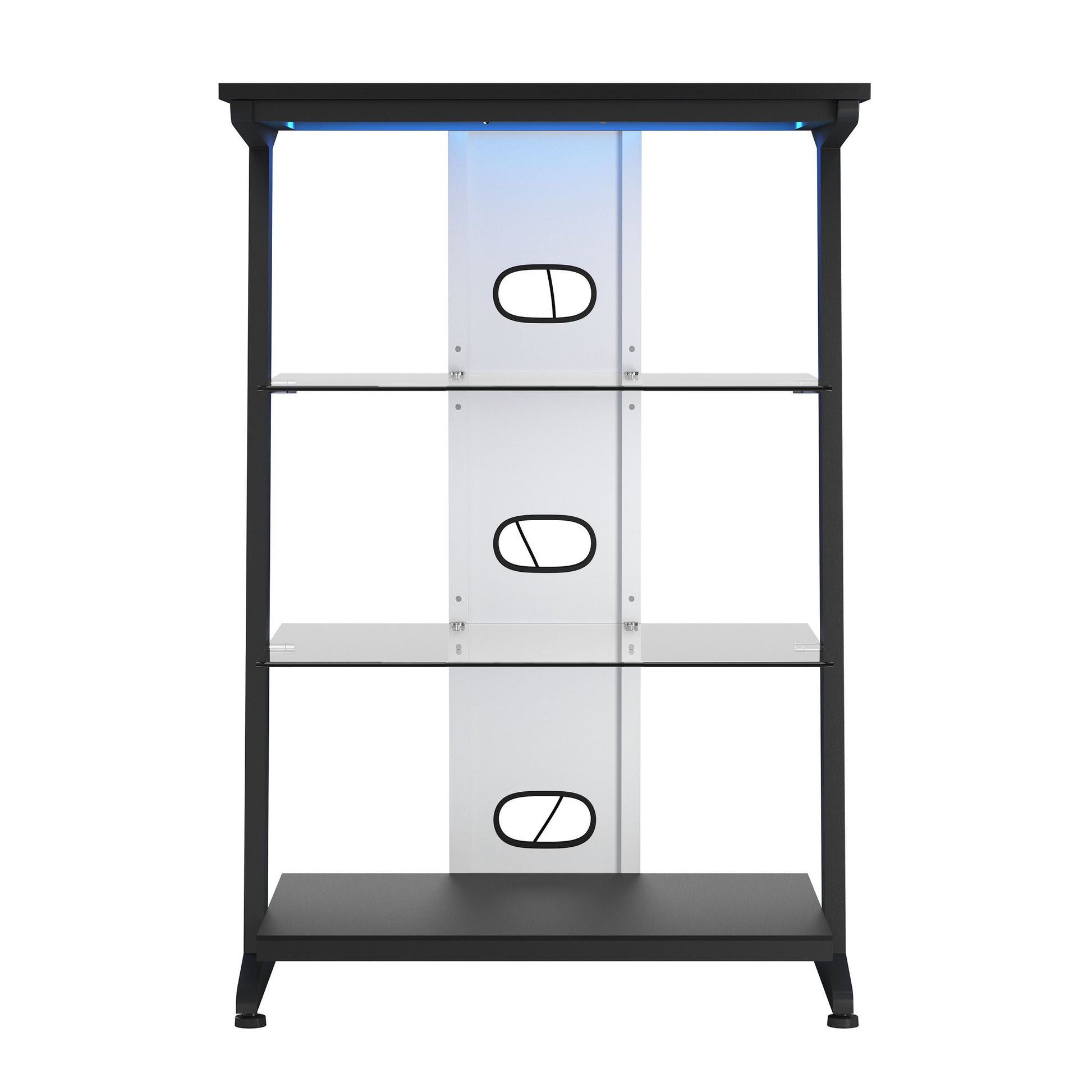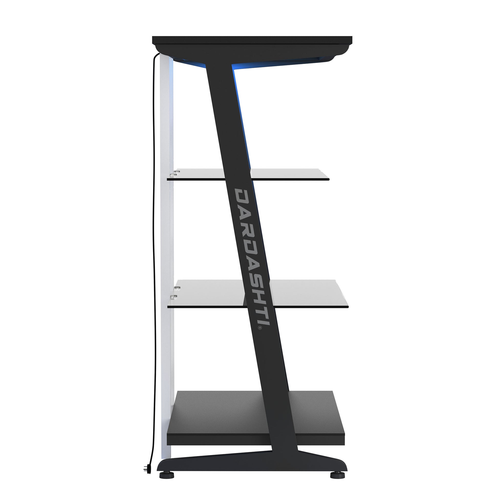Dardashti Gaming Shelf Z1-S1 features four shelves - two tempered 5mm glass and two matte black MDF. Features include 2” wide, steel “Z” legs; multi-color, remote controlled LEDs; three cable management ports, and leveling feet. Choose from five matching accent colors that match the Dardashti Desk and Chair.
