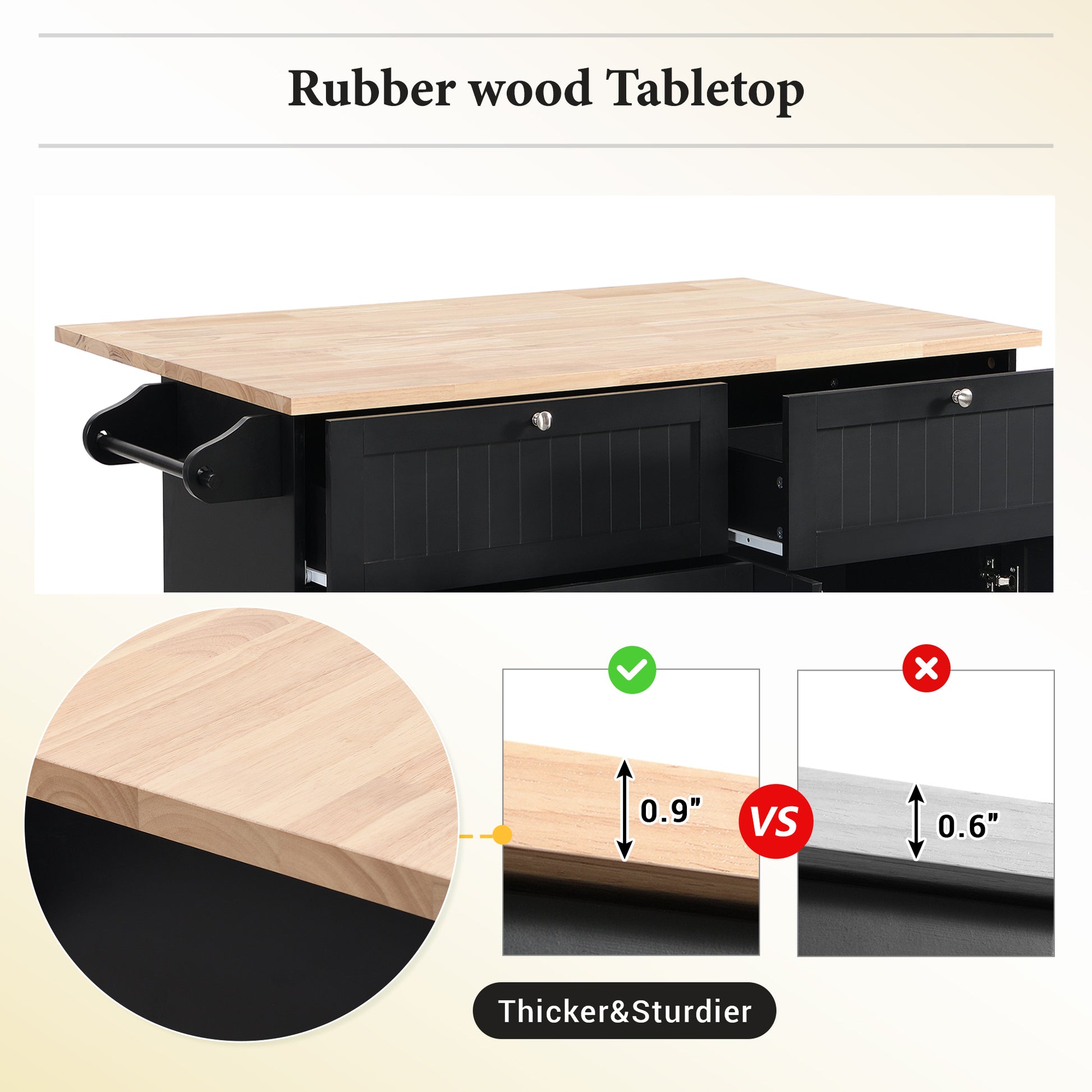 - [Rubber Wood Tabletop with Drop Leaf] Featured with water and stain-resistant, rubberwood is always the first choice for an island top. Designed with a large countertop with drop leaf, you can fold down the side when not in use or open it to provides ample space for easily cooking.