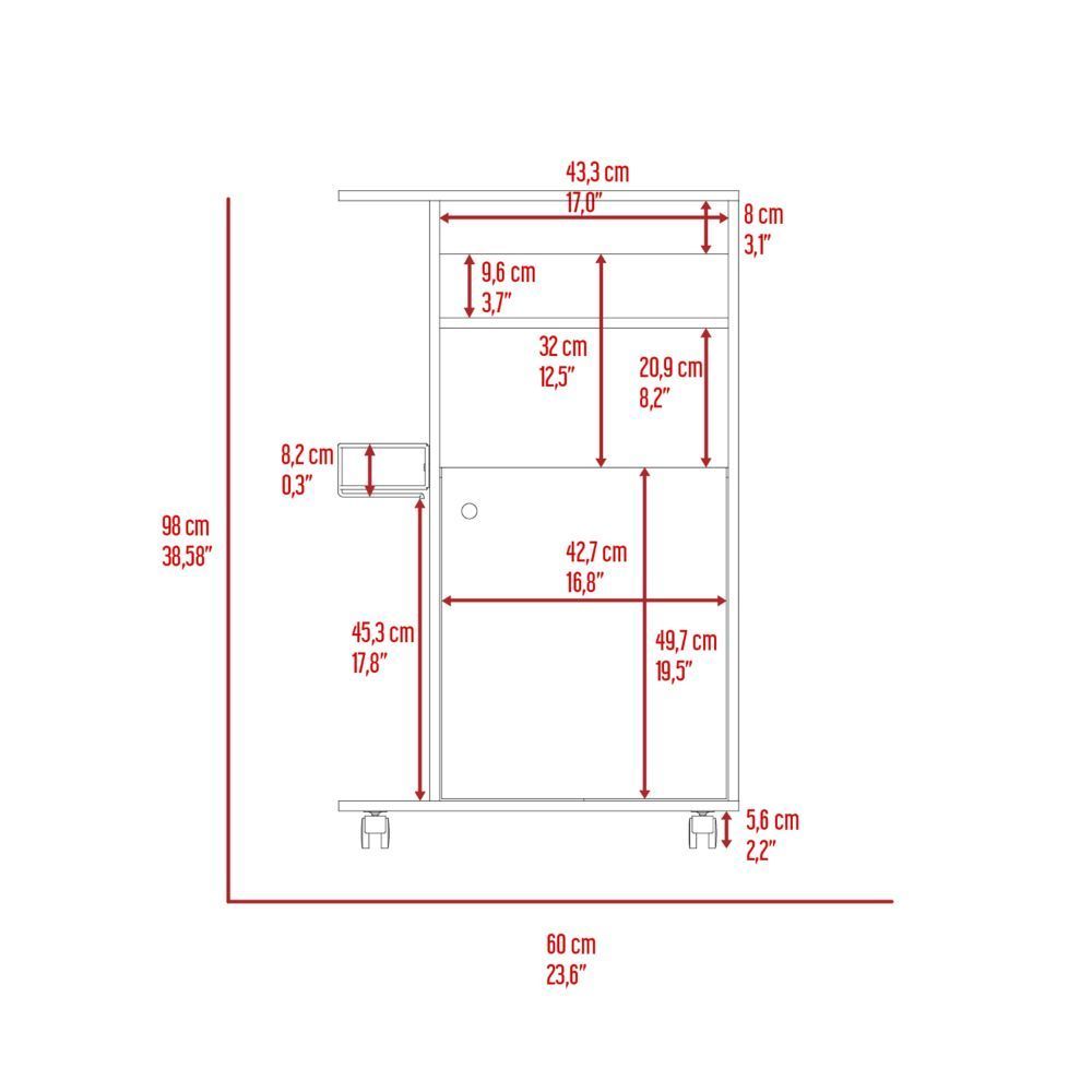 The idea of adding extra storage to your kitchen is entirely possible with this ergonomic cart. Its Countertop is ideal for the microwave, plus, with the ease of its four caster wheels(2,2'') it is possible to accommodate it in the place you prefer and move it when necessary, and it has ample storage space, elegant and versatile., with a rack for extra storage (0.3'') Ideal size (38,58''H X 23,6''W X 14.96''D) black engineered wood finish.
