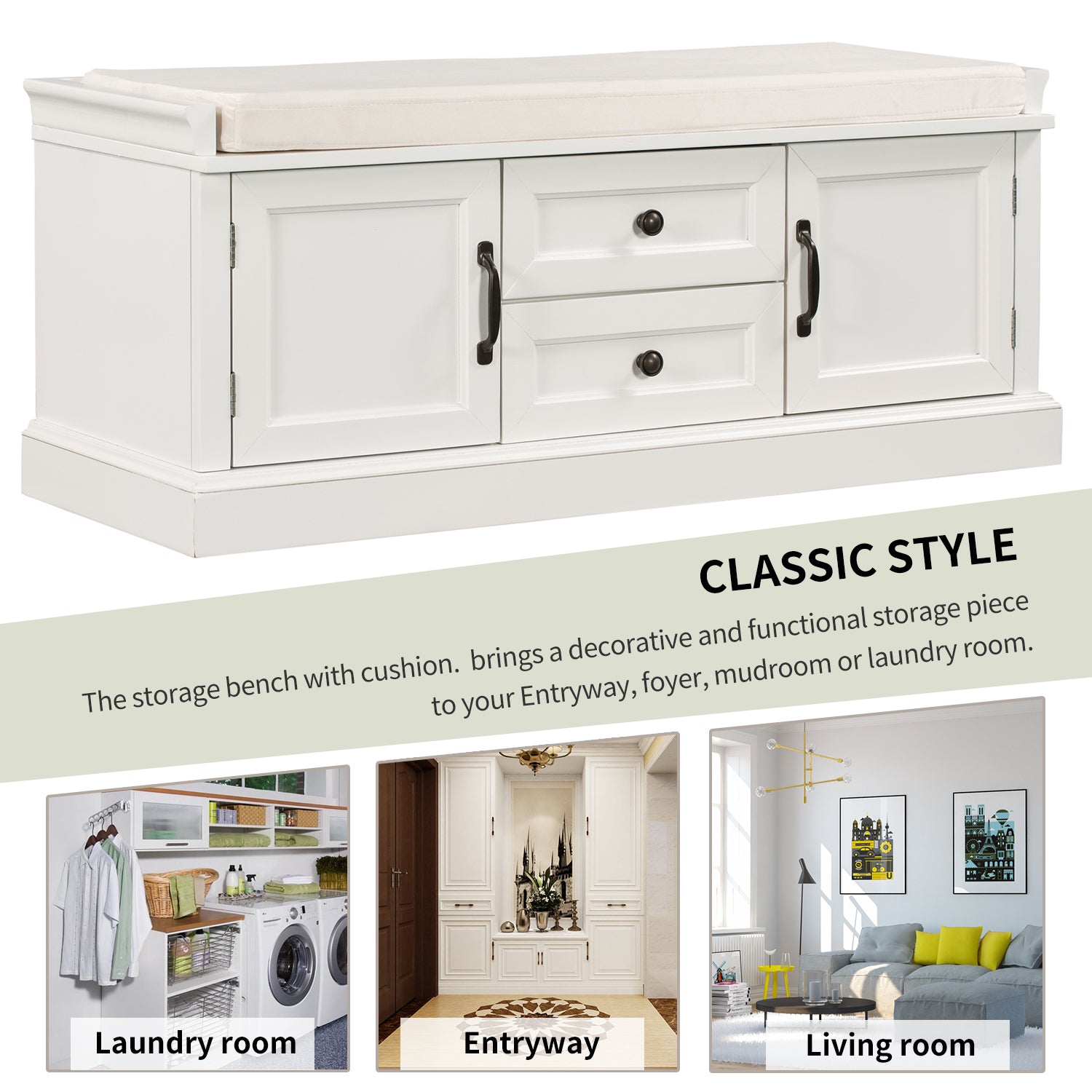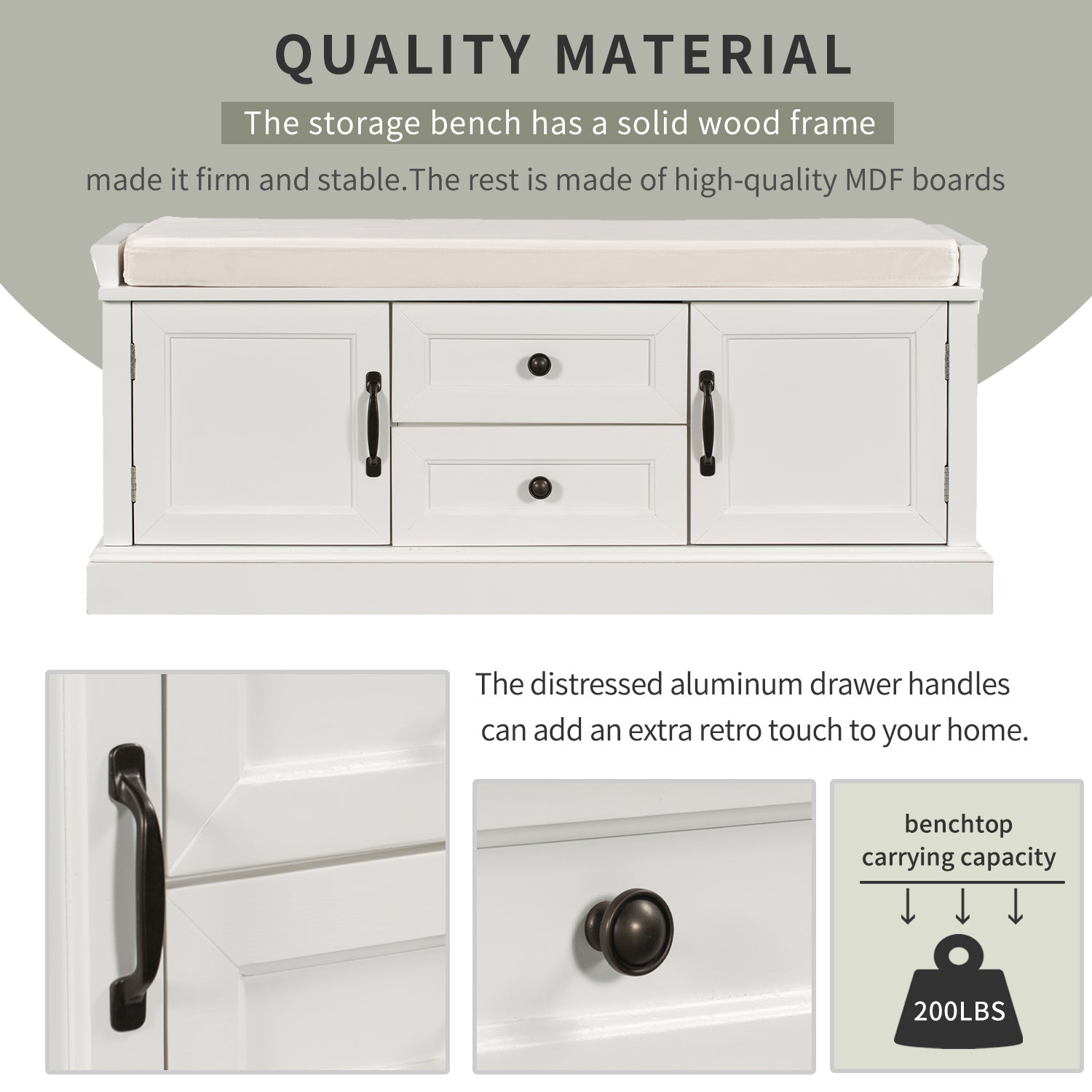 The storage bench with cushion brings a decorative and functional storage piece to your Entryway, foyer, mudroom or laundry room. The distressed aluminum drawer handles can add an extra retro touch to your home. Enclosed doors and drawers meet the needs of the home's multi-purpose storage, making it ideal for storing small items such as books, shoes, umbrella and keeping the living room, hallways and entrances clean and tidy.