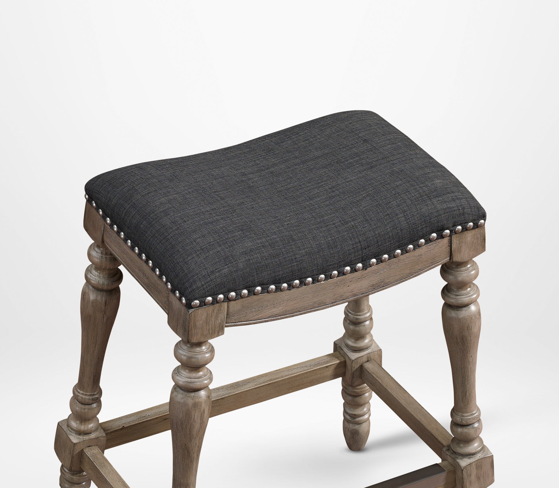 The Carolina Saddle Seat Counter Stool is the perfect choice for counter height seating where comfort and style combine. The charcoal linen look seat features a 3" thick saddle seat cushion in an easy to clean poly-cotton blend with webbed seating for added comfort. A simple sand finish and beautifully turned legs add to the traditional style and floor glides protect your floors. Stretchers provide stability and comfort and a bronze kick plate protects the foot rest from wear. Add to your dining space for a classic, cottage look.- Materials: Solid Birch Wood