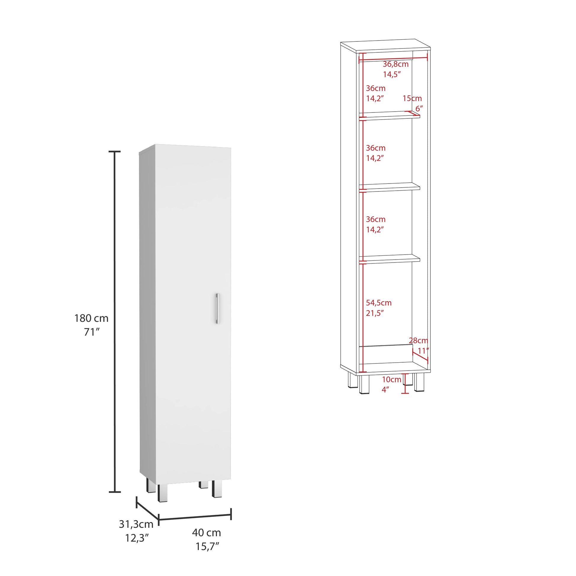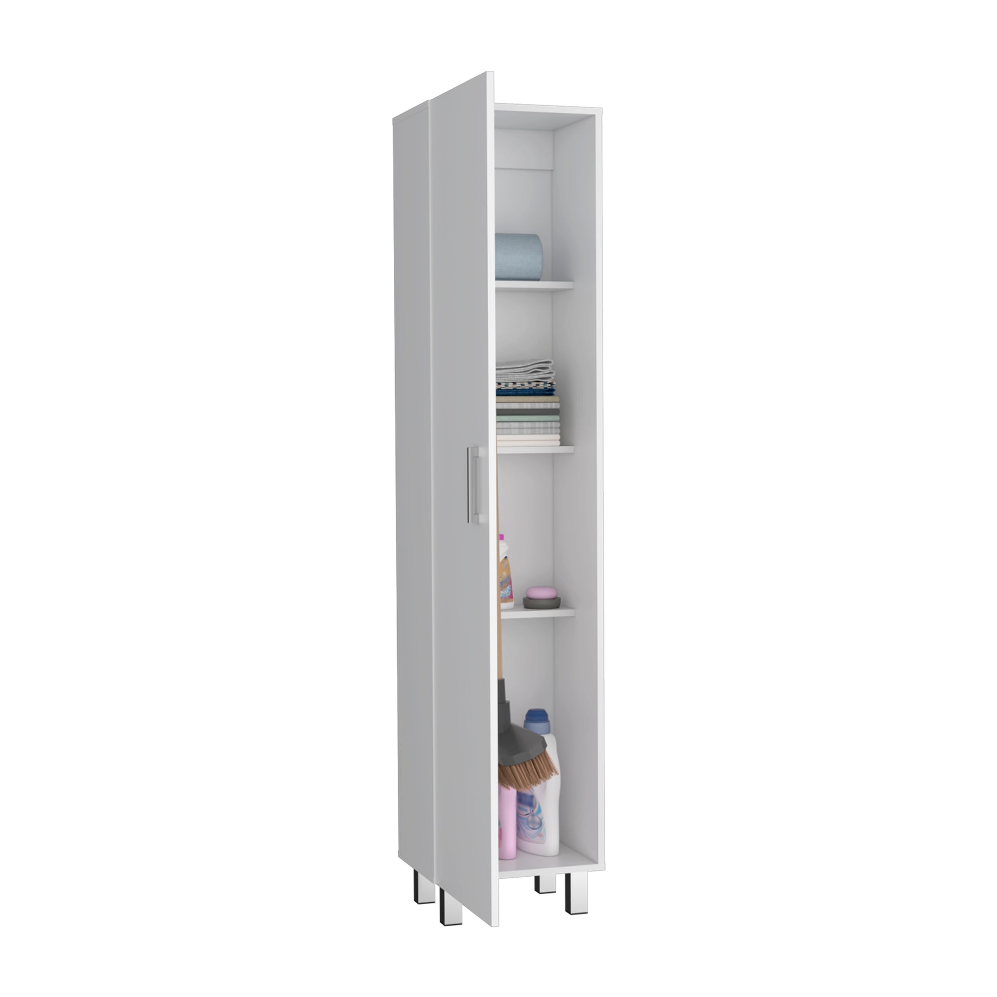 Looking for extra storage space in your Kitchen? Here's the Vintro Storage Cabinet. This cabinet has a wide door, perfect for keeping your cleaning supplies safe, and four internal shelves, perfect for extra storage. The cabinet has internal broom hangers, so you can keep your brooms organized and easy to access. The cabinet has a metal handle and legs, giving it a unique, stylish touch. Take advantage of this must-have piece of furniture - order the Vintro Storage Cabinet today! Designed with an elegant white manufactured wood finish. Dimensions: Height: 71" Width: 15,7” Depth: 12,3“ Furniture Type: Ready to assemble (full assembly required). Certifications: CARB phase II compliant – TSCA Title VI Compliant. Warranty: 1-year warranty coverage in wooden parts- 1-year warranty coverage in hardware pieces since its manufacturing date found in the lot number printed in the product box.