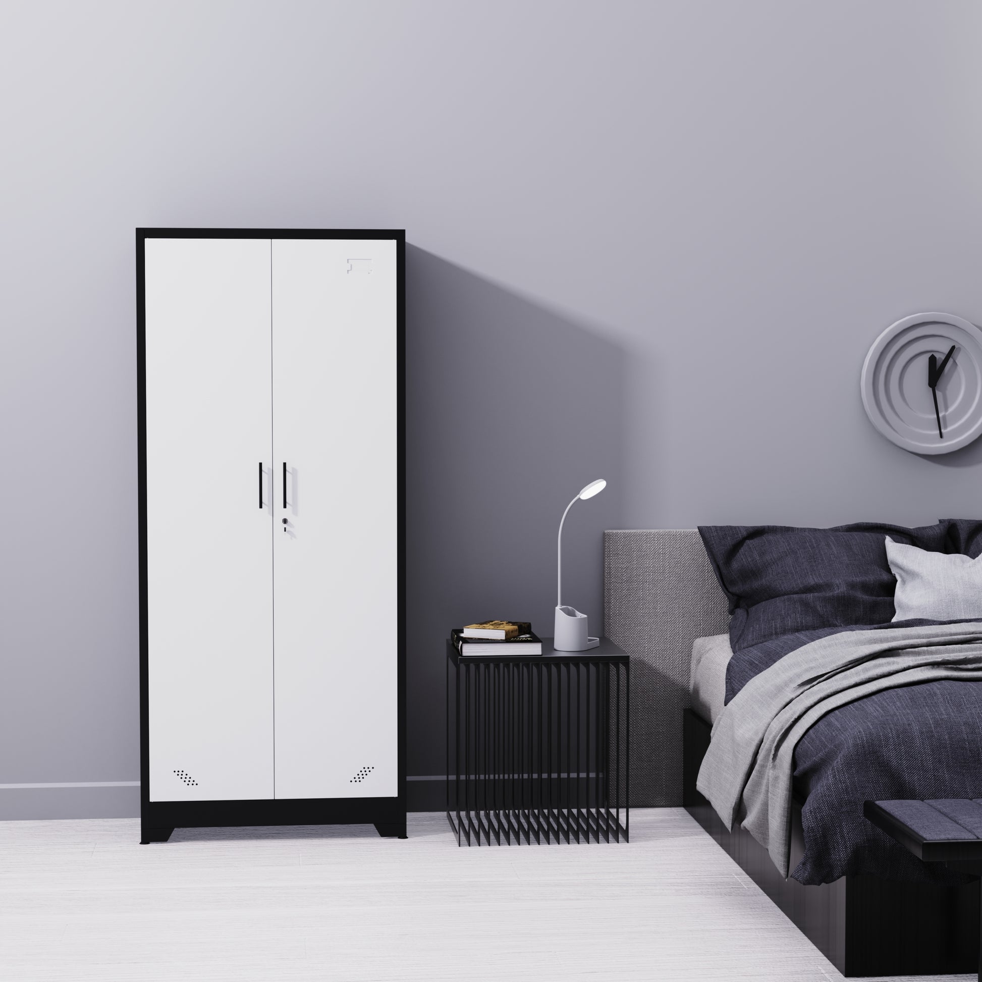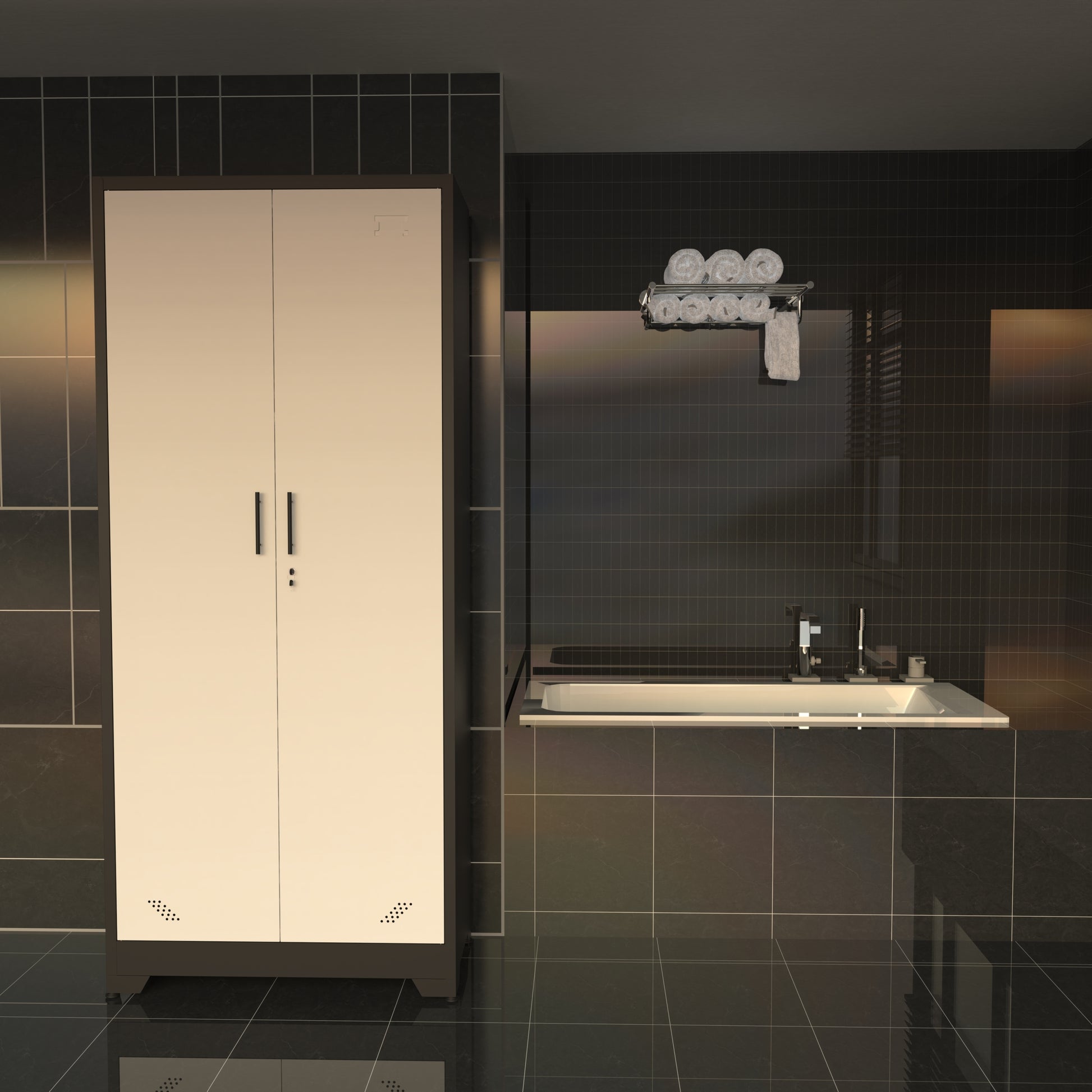 - Office Storage Cabinet with a lock and two keys, providing security for your files and personal belongings. There are 2 reserved holes on the back of the high storage cabinet to facilitate installation of the cabinet on the wall and prevent tipping over