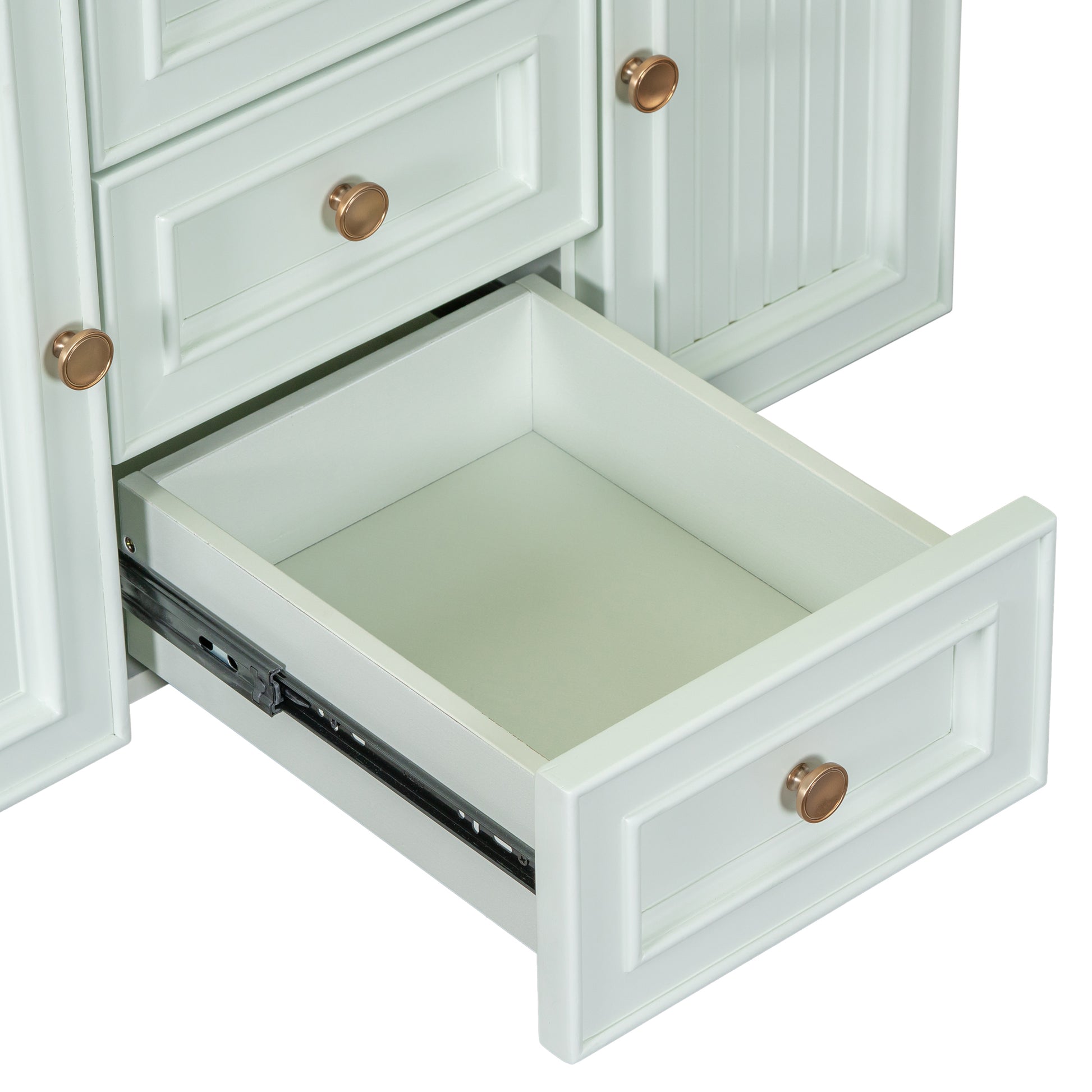 - Storage Space: This bathroom vanity has ample enclosed storage spaces: one drawer with two tiers, two different size drawers in the middle (the top drawer is only for decorative use), and one cabinet with door on the right. You can put soaps, towels, shampoos, tissue paper and other bathroom essentials in it so to keep them away from dust.