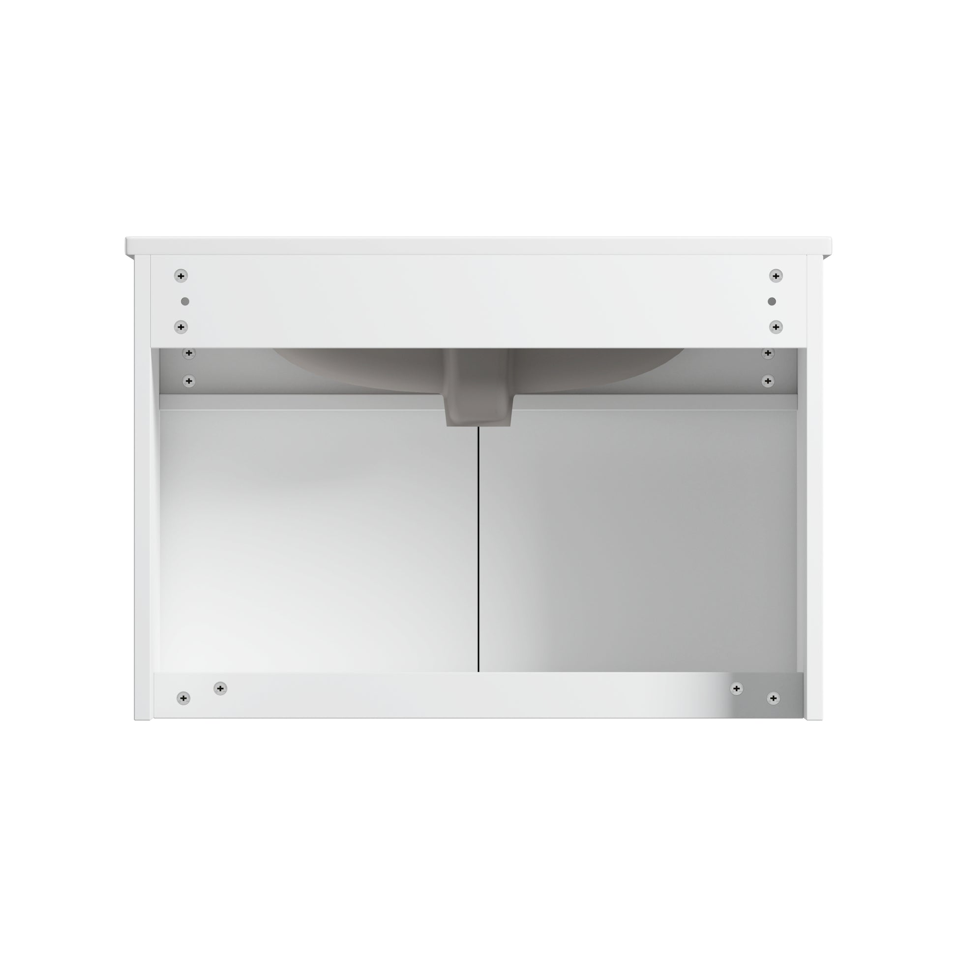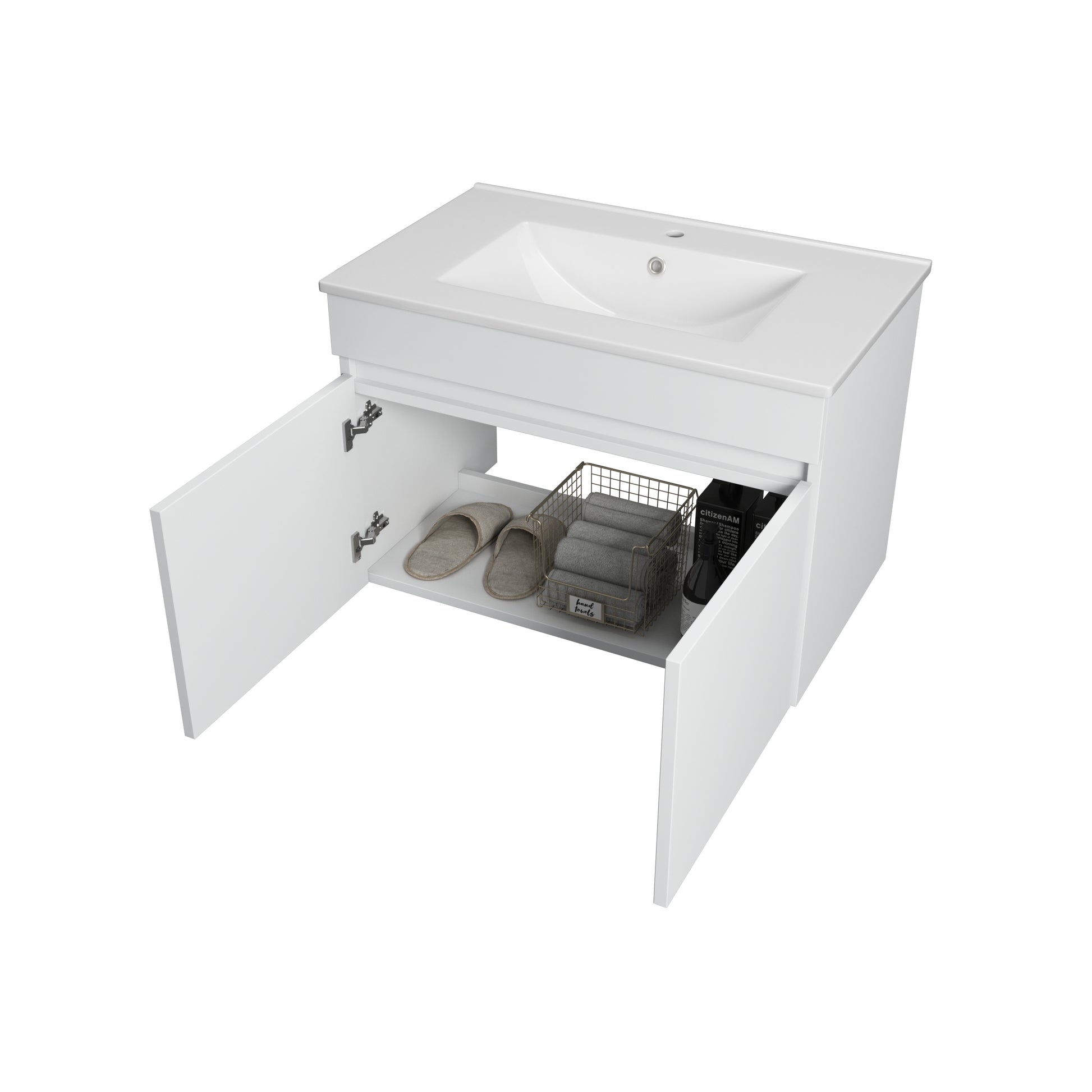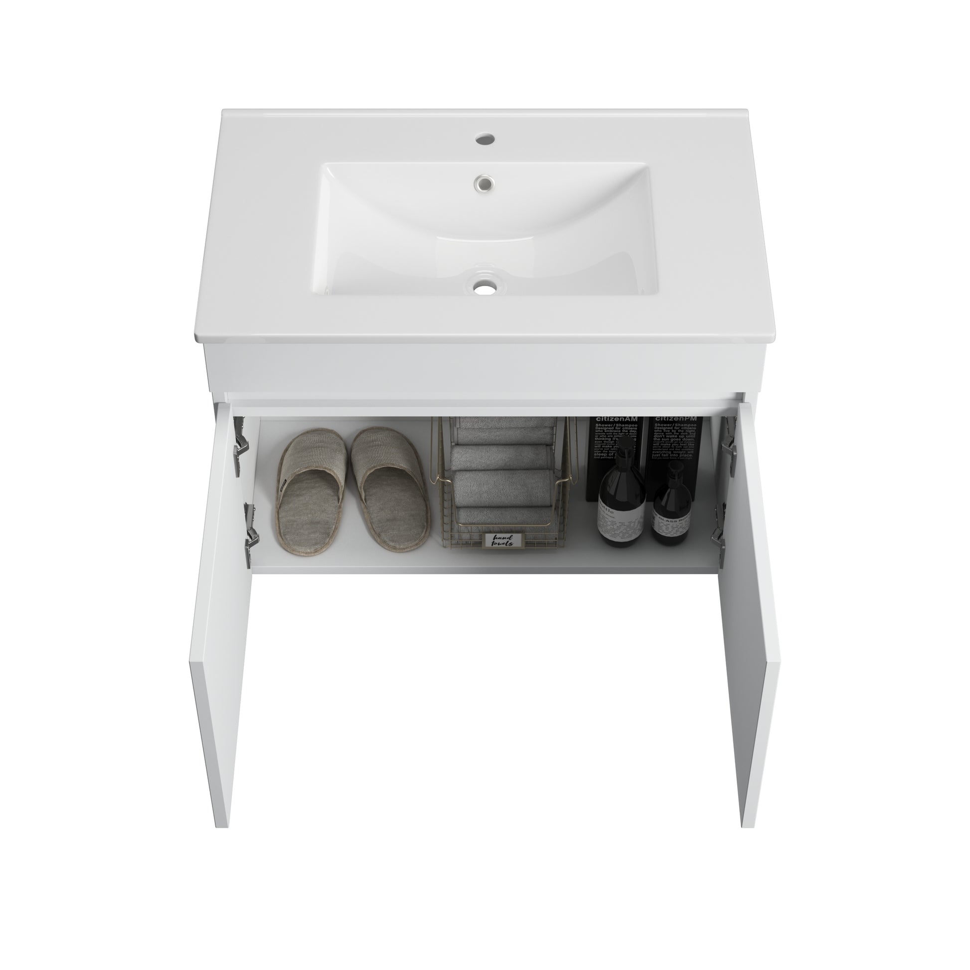 - This elegant wall-mounted vanity is compact in size and ideal for any small Bath Room or Powder Room.Two full-extension doors provide easy-access storage for all your toiletries.