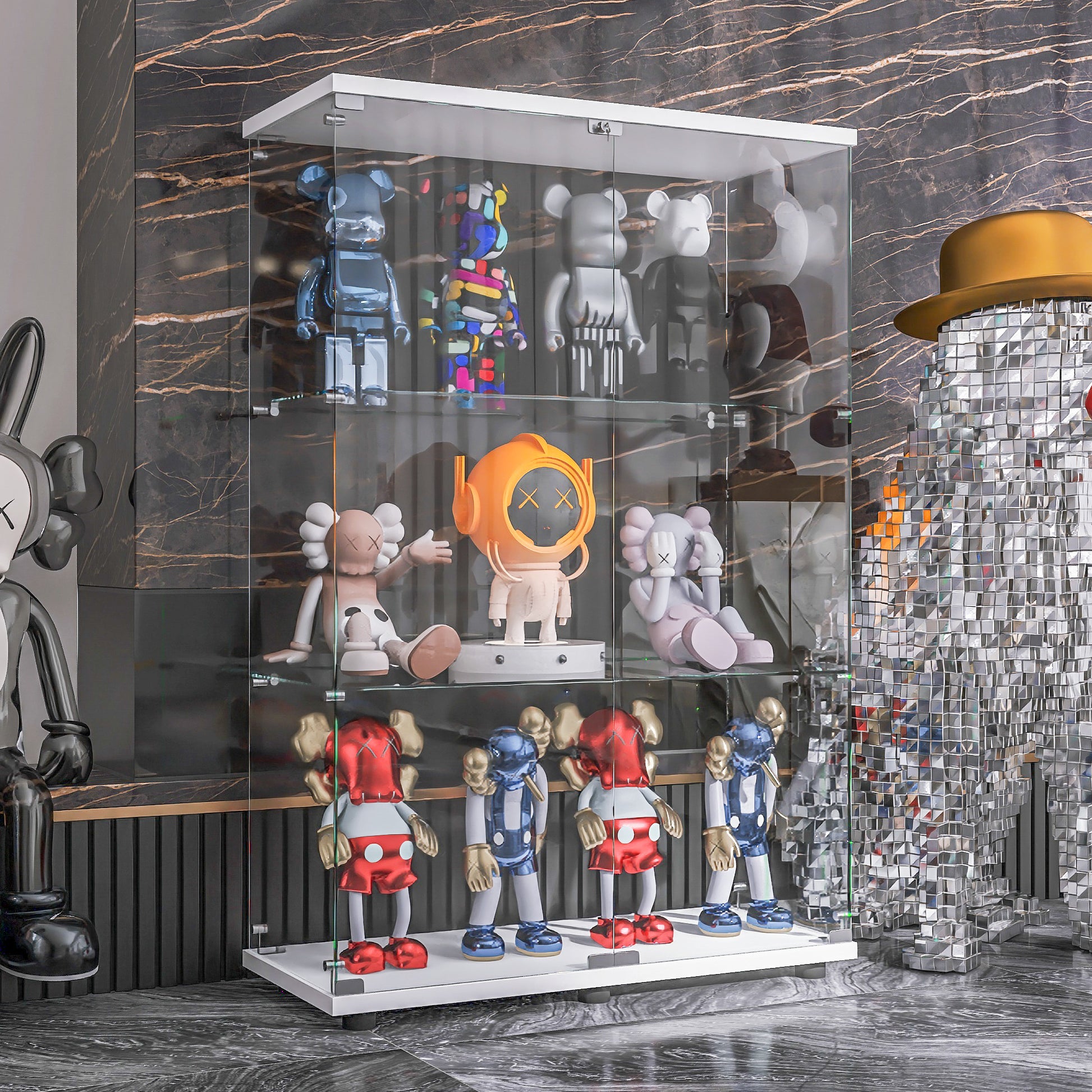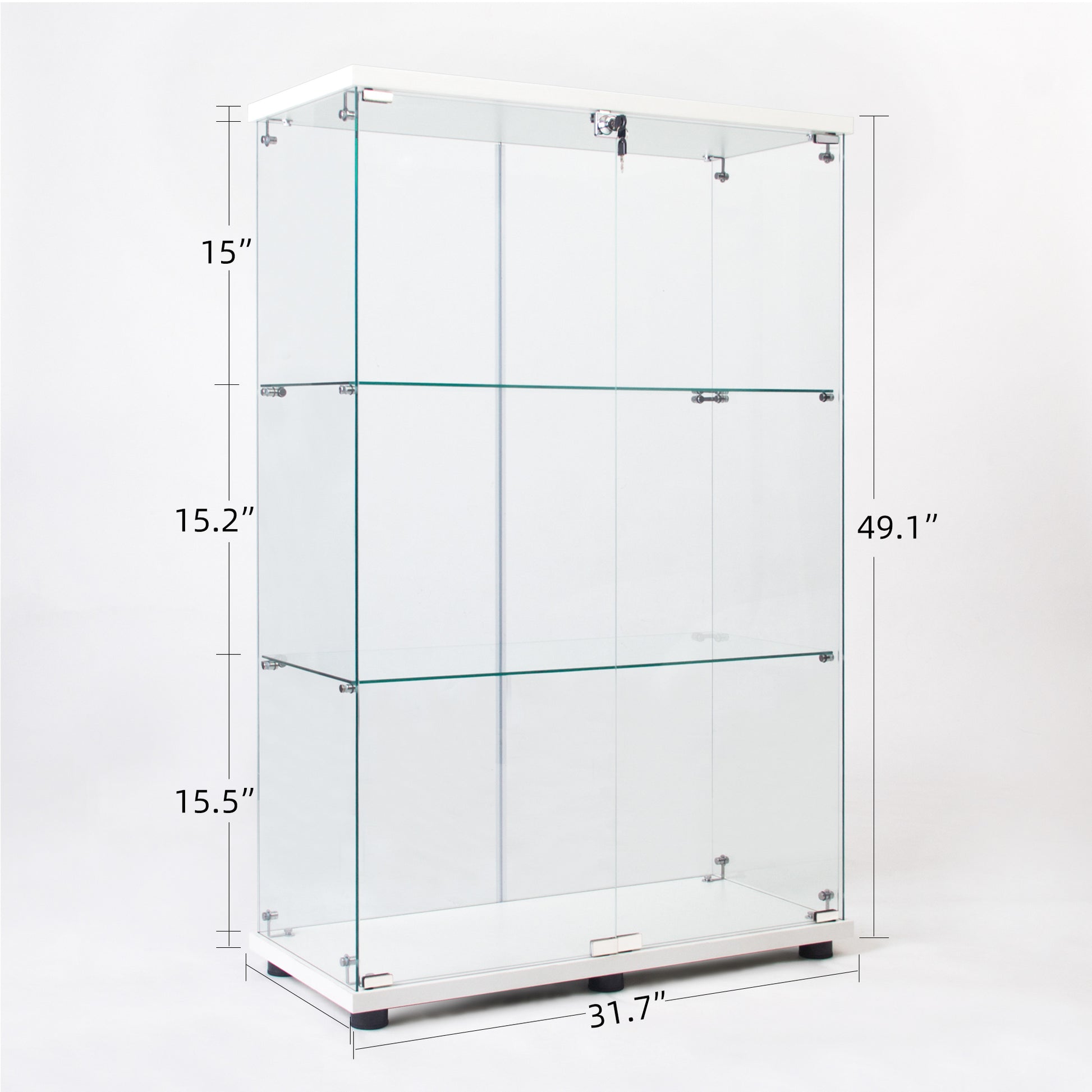 Two-door Glass Display Cabinet: Size 49.49”(H) x 31.77(L) x 14.37”(W) inches, each tempered glass is 4mm thick. 3-shelf design is sturdy and stylish to display Jewelry, Bags, Shoes, Figures,photos, books, action figures, wine and whisky; glass door is easy to open and close. Enhanced Protection: Made of tough tempered glass and solid wood particle boards.The product uses a screw structure, which is easy to install, strong and stable. Store various items in this glass curio cabinet, the glass door helps keep dust out and well protect your collections Large Capacity: Each glass shelf level can withstand a maximum weight of 16pounds,The upper and lower decks can hold 84 pounds per floor. capacity in between is 15”(H) x 16.7”(L) x 14.4”(W), great for displaying Jewelry, Bags, Shoes, Figures,books, photos, medals, action figures, wine bottles, toys, artwork, decorations Safe Installation: Adjustable feet can hold weight up to 200lb. Each display cabinet comes with a fixing device. In order to prevent tipping over, we recommend securely fixing the glass cabinet onto the wall. Ensure the safety for you and your family Widely Use: It can be used as a showcase in living room, a wine cabinet in the kitchen, bookshelf in the study, or a hand-made display rack in your collection room! Contact us if you received any damaged products, we will provide you with a satisfactory solution