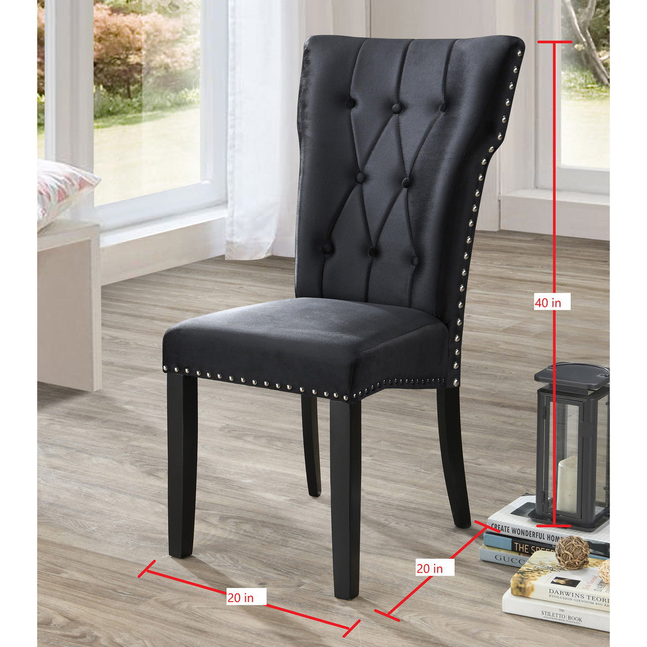Dine in luxurious style with the Go Green Woods La Costa Velvet Tufted Dining Chair Set of 2. Featuring high back, plush cushioned seat and deep tufted Plush Velvet Upholstery studded with chrome nail heads, this luxe dining chair is sure to take your dining experience to a whole new level. Wood legs provide sturdy support and complement the stunning upholstery for a sleek, contemporary design that bring a touch of elegance into your home! Available in Black, Beige, Green, Blue and Gray color options.