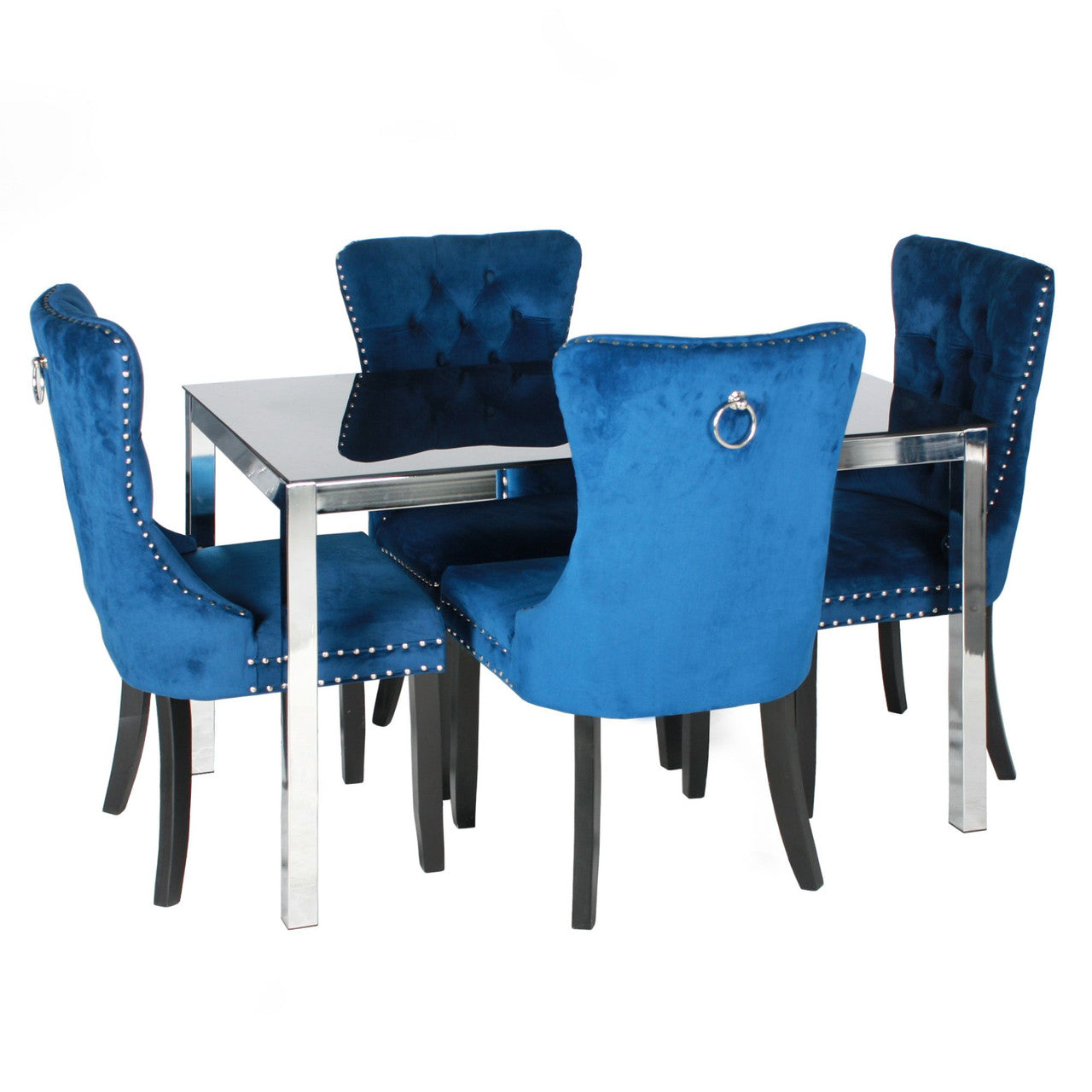 The Go Green Woods Lisa Dining Table Set for 4 with Velvet Chairs will add classic mid-century modern charm to your dining room. Metal table in chrome finish with rectangular tabletop made from strong black tempered glass brings modernity and stylish up-to-date impression. Chairs are crafted from sturdy wood framework with plush velvet upholstery and features curved high back, plush cushioned seat, and deep tufted design. Sturdy solid rubber wood legs in black finish provide durable support. With chic ring-pull on the back and studded chrome nail heads trim chairs, this dining set is sure to take your dining experience to a whole new level. Available in Blue, Gray and Black chair color options. Assembly required.