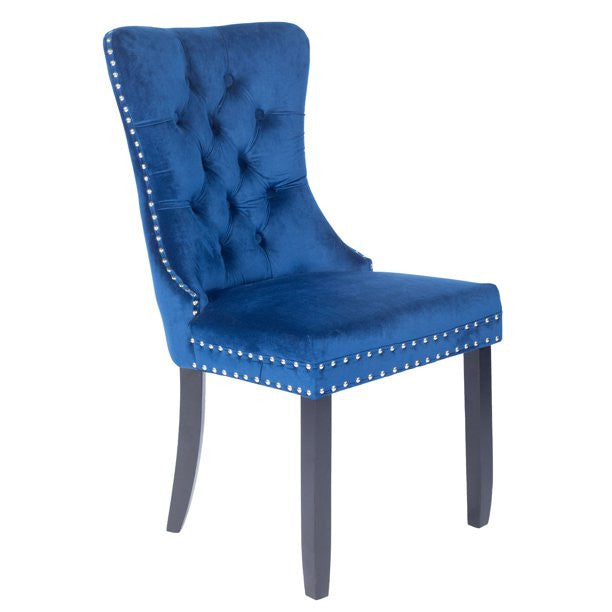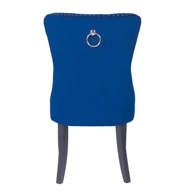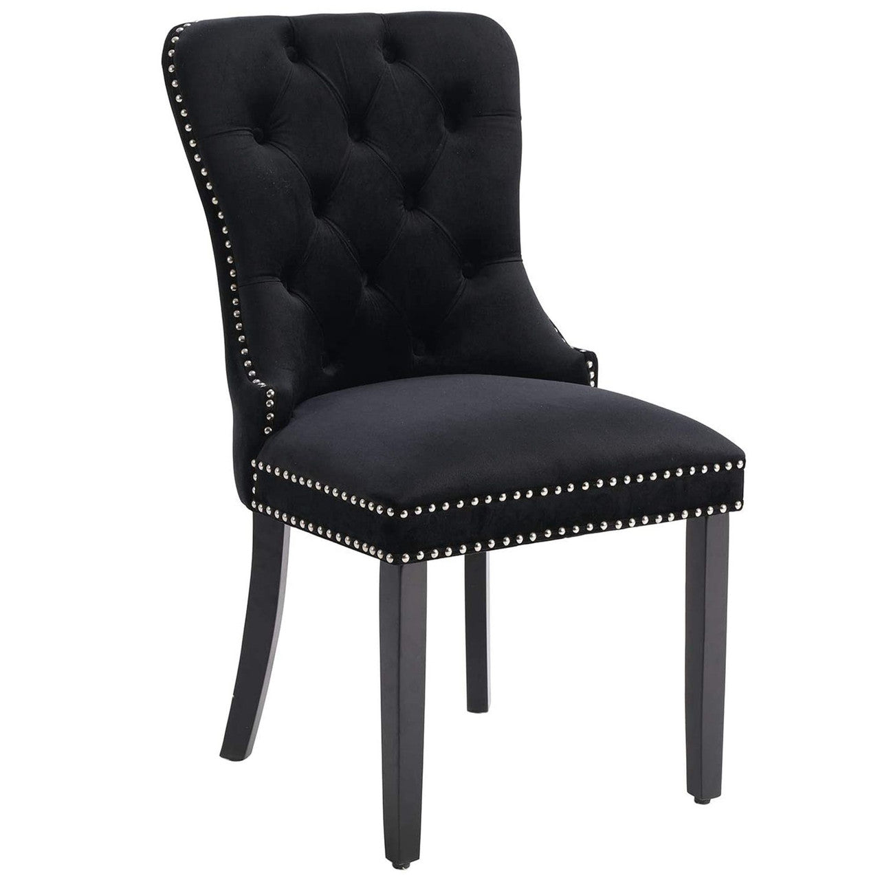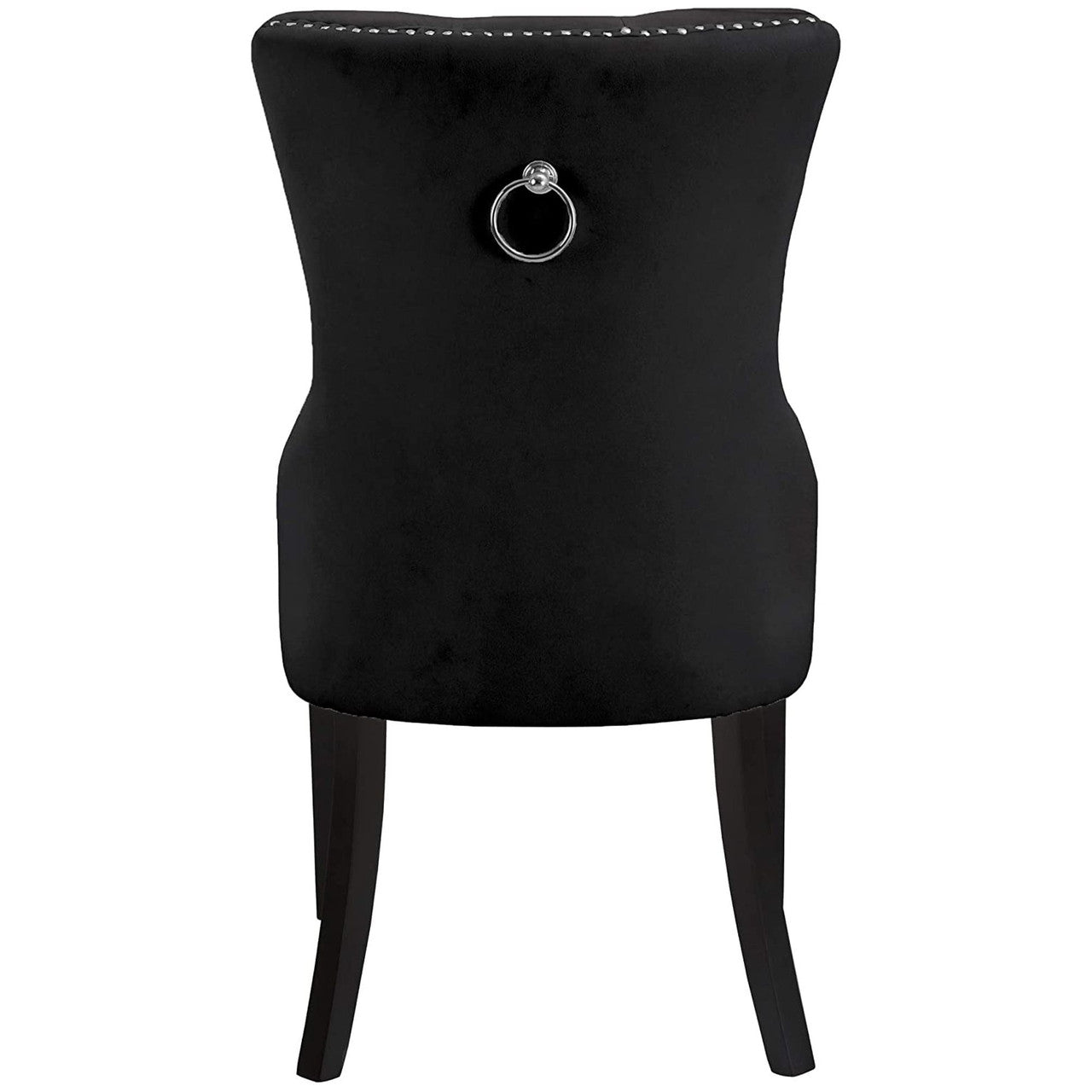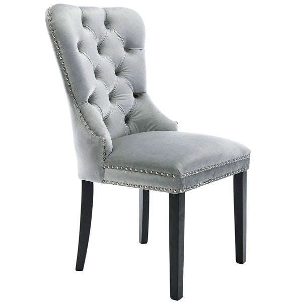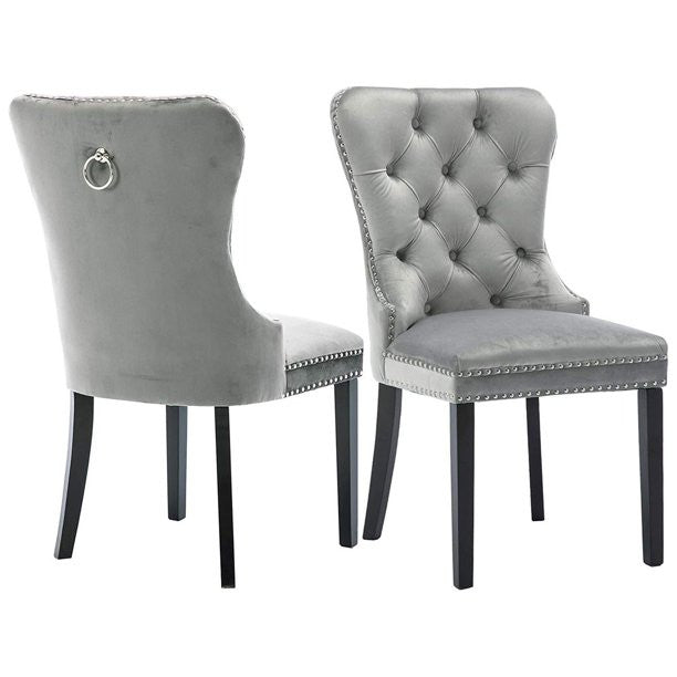 - Velvet upholstered dinning chairs are crafted with solid wood framework and features deep button tufted back, nail head trim and pull-back ring at back.