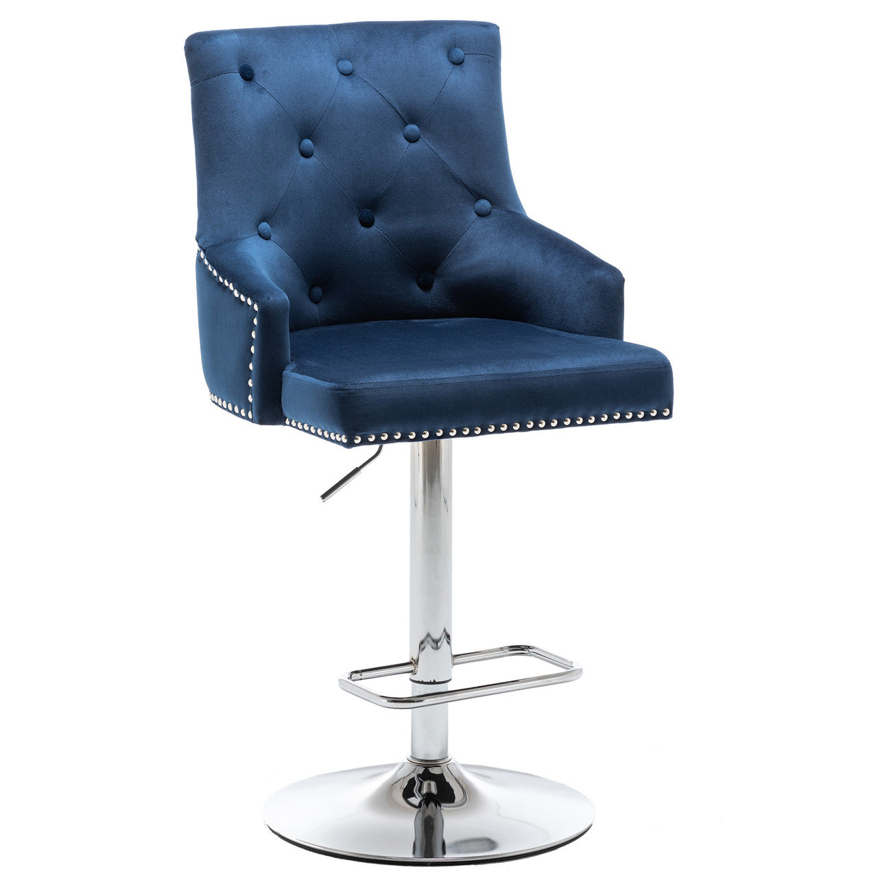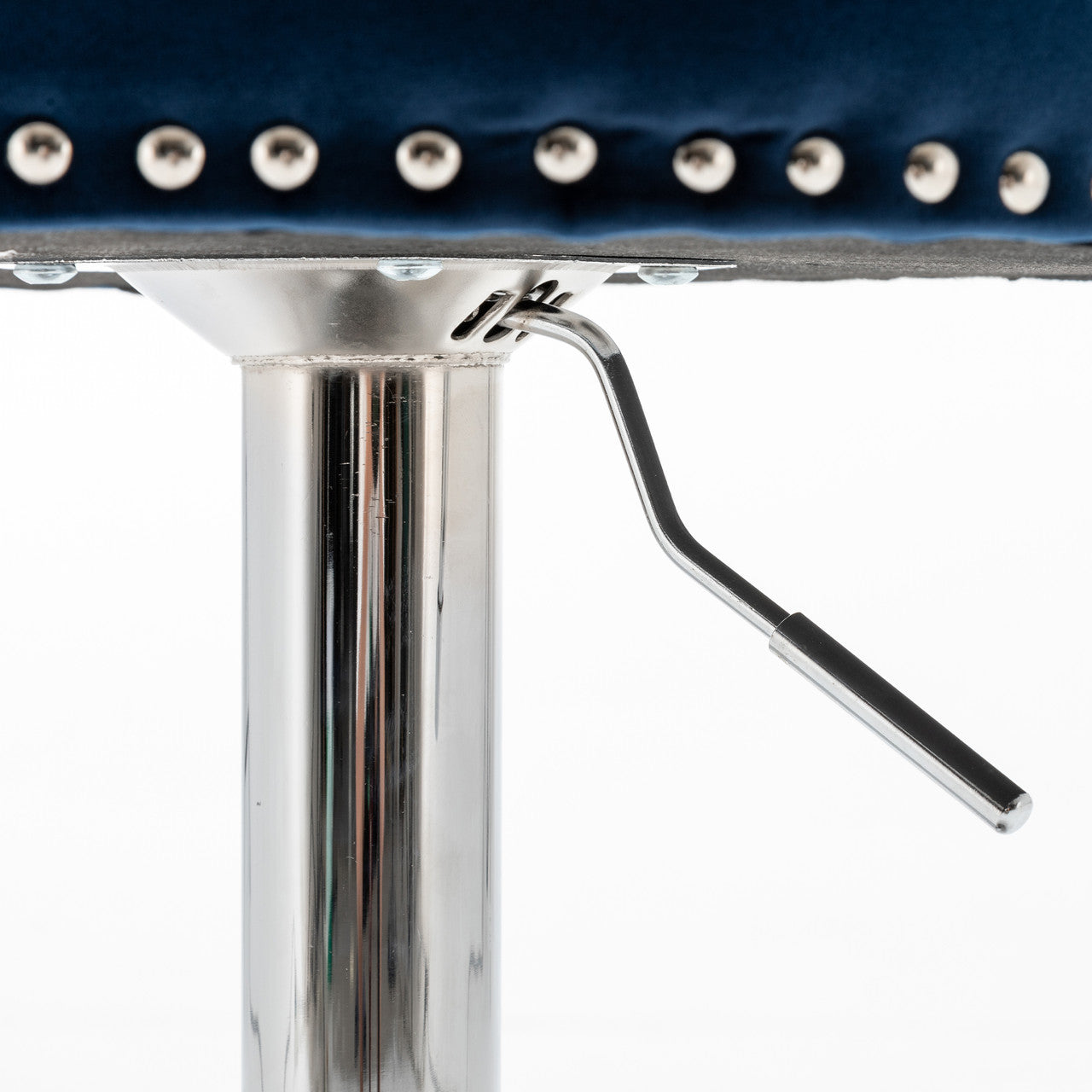 The Go Green Woods Monroe Velvet Tufted Adjustable Swivel Bar Stool Set is designed for strength, durability, and stability, as well as high quality and comfort. Skin-touch velvet upholstery, tufted button, nail-head stitches, and chrome parts make up the elegant appearance, which combines both contemporary and retro. 360-degree swivels for rotating around freely. A lift bar is equipped, you can effortlessly adjust in height with only one hand. These functions help you to find the right and comfortable position to sit by your counter table. It’s durable enough as a piece of daily furniture that perfectly match your counter for lazy breakfasts, casual meals, or snacks. Available in Black, Gray and Blue color options.