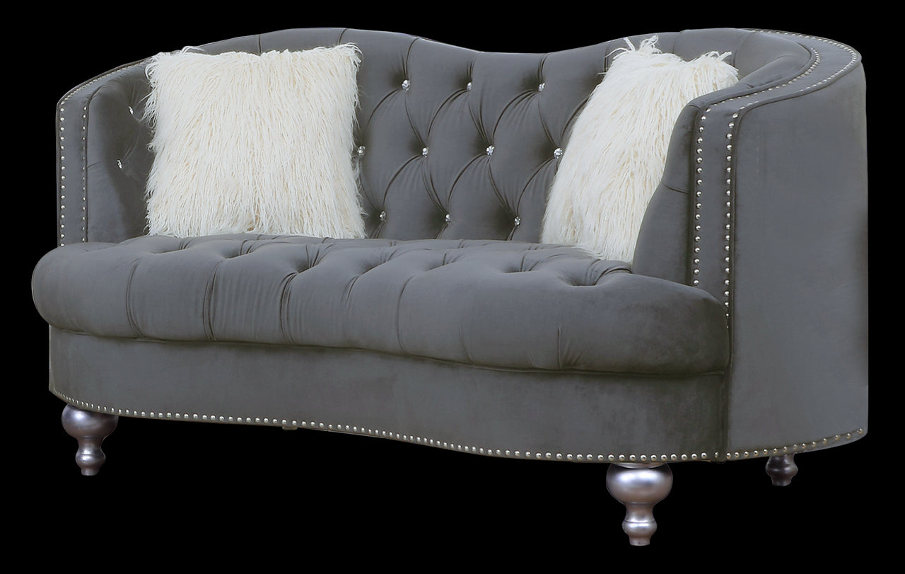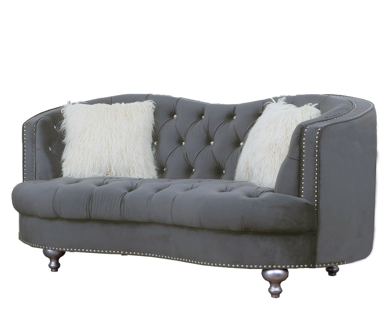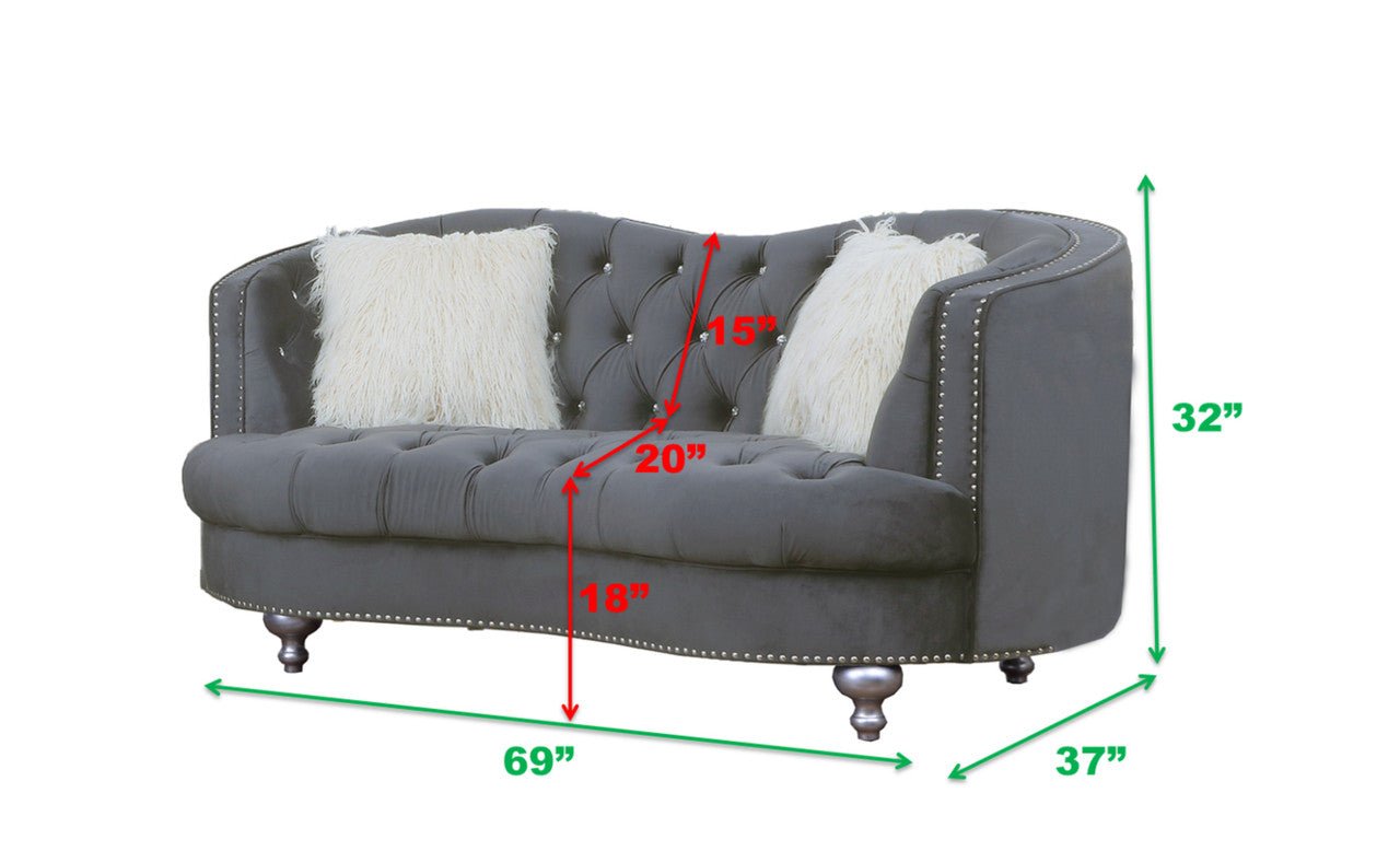 Introducing our Graceful Gray Velvet Loveseat Upgrade your living room with this one-of-a-kind set. With a modern transitional design, it offers aesthetic versatility and unbeatable comfort. The button-tufted velvet upholstery is both soft to the touch and visually captivating. The swivel barrel structure and silver spindle steel legs add a unique Hollywood-inspired look. With foam-filled cushions and a solid wood frame, this set ensures perfect comfort for reading or cuddling with loved ones.