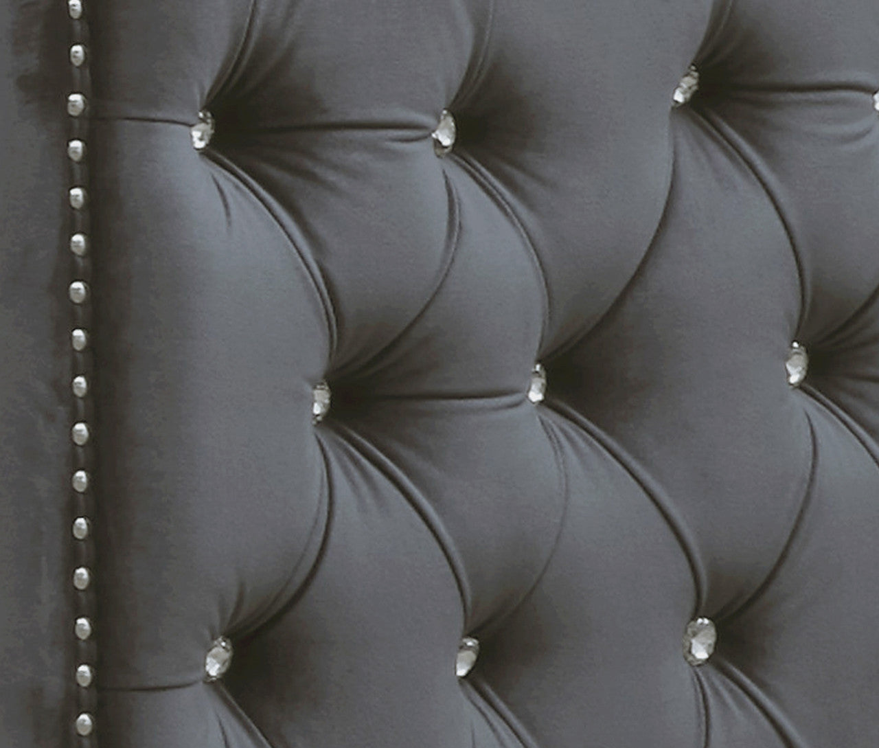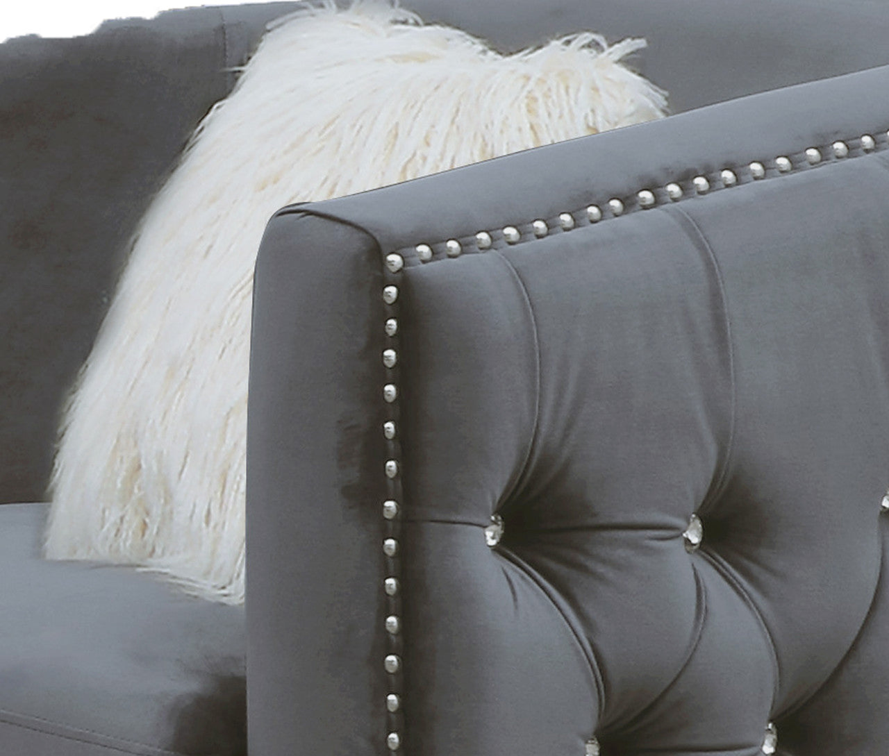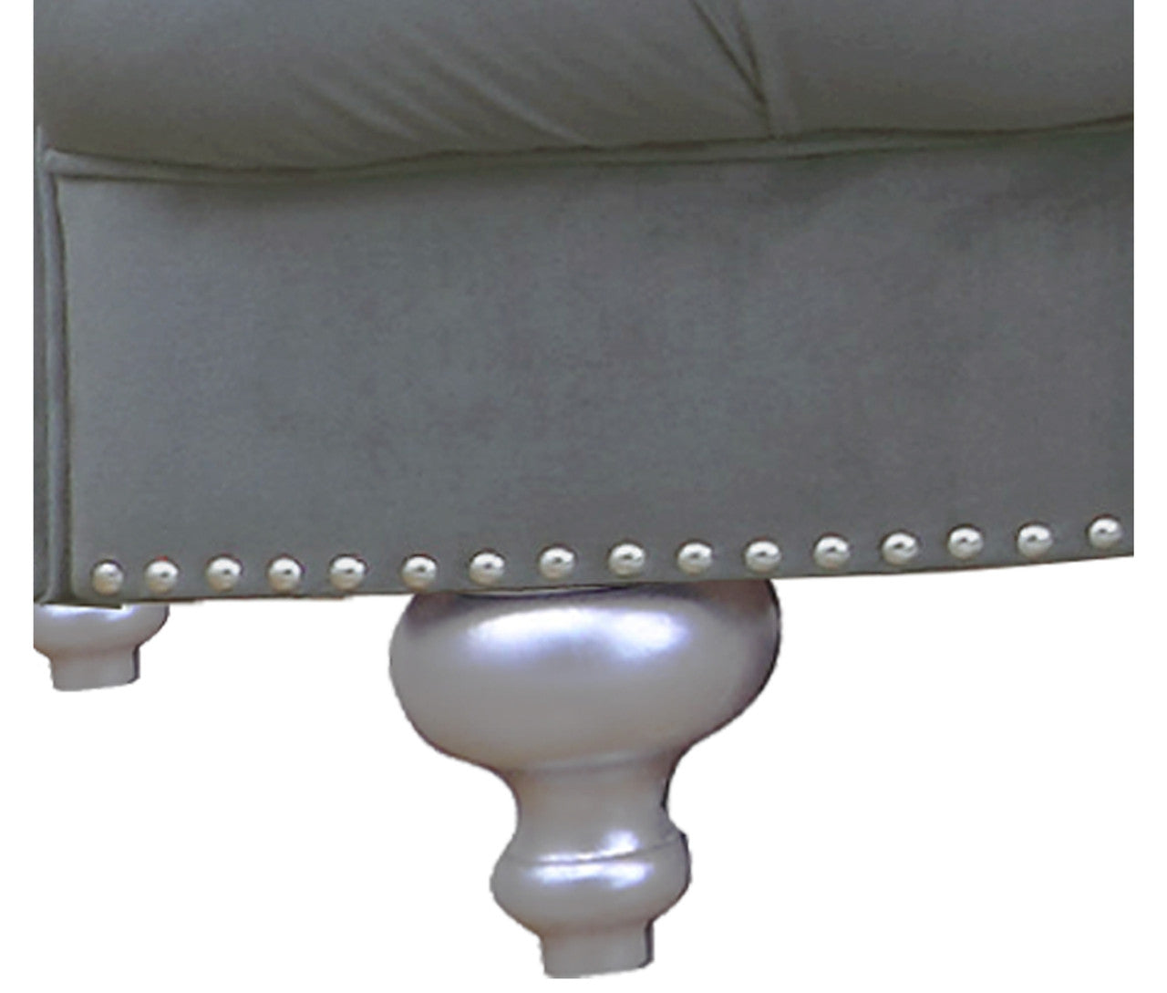 Introducing our Graceful Gray Velvet Loveseat Upgrade your living room with this one-of-a-kind set. With a modern transitional design, it offers aesthetic versatility and unbeatable comfort. The button-tufted velvet upholstery is both soft to the touch and visually captivating. The swivel barrel structure and silver spindle steel legs add a unique Hollywood-inspired look. With foam-filled cushions and a solid wood frame, this set ensures perfect comfort for reading or cuddling with loved ones.