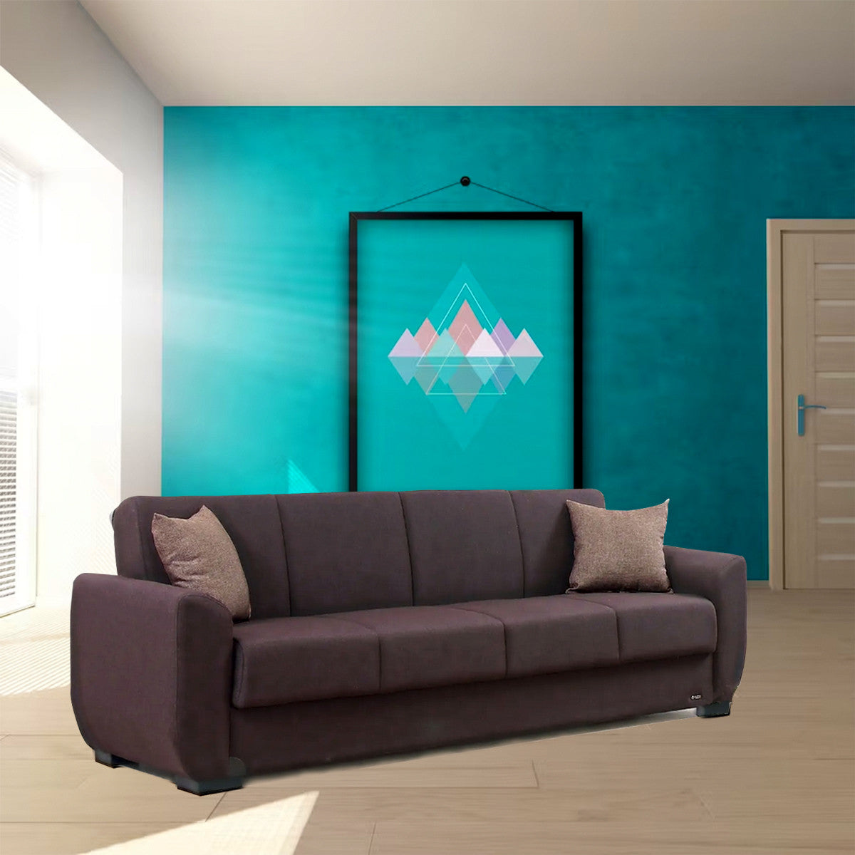 - Experience the versatility and elegance of the Karen Sofa Bed, featuring a sturdy frame and luxurious dark brown fabric upholstery.